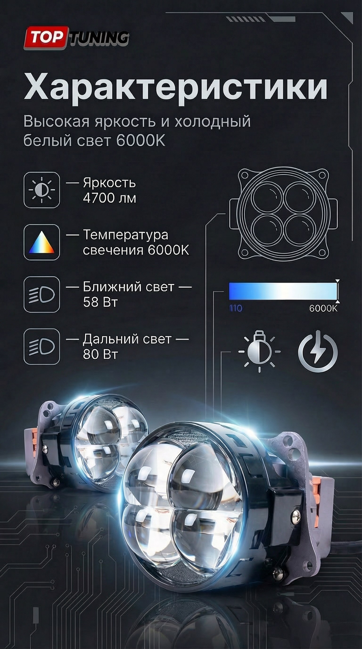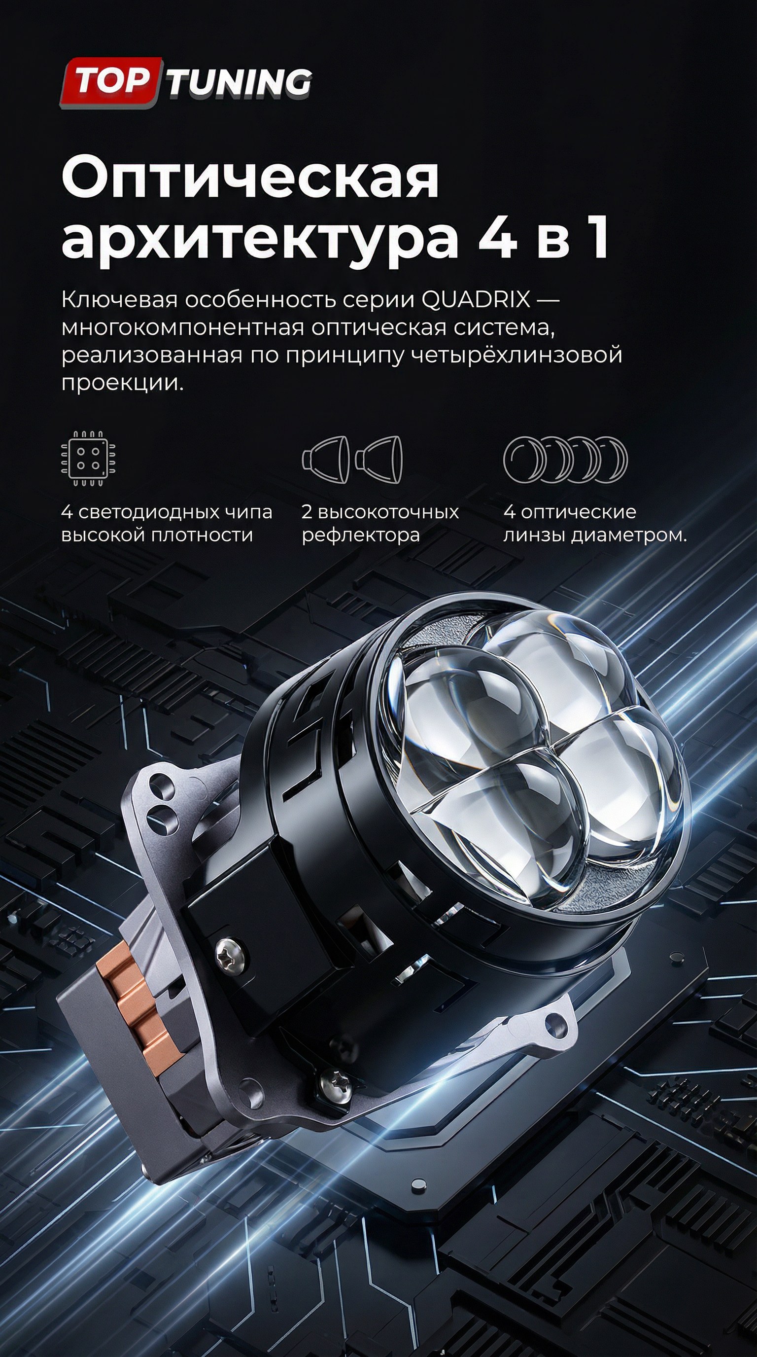 Благодаря четырёхлинзовой оптической системе, высокоэффективным светодиодным чипам и гибридному охлаждению модули формируют правильный европейский световой пучок с чёткой светотеневой границей, высокой дальнобойностью и стабильной яркостью в любых условиях эксплуатации, сочетая функциональность, надёжность и выразительную эстетику премиального автосвета.