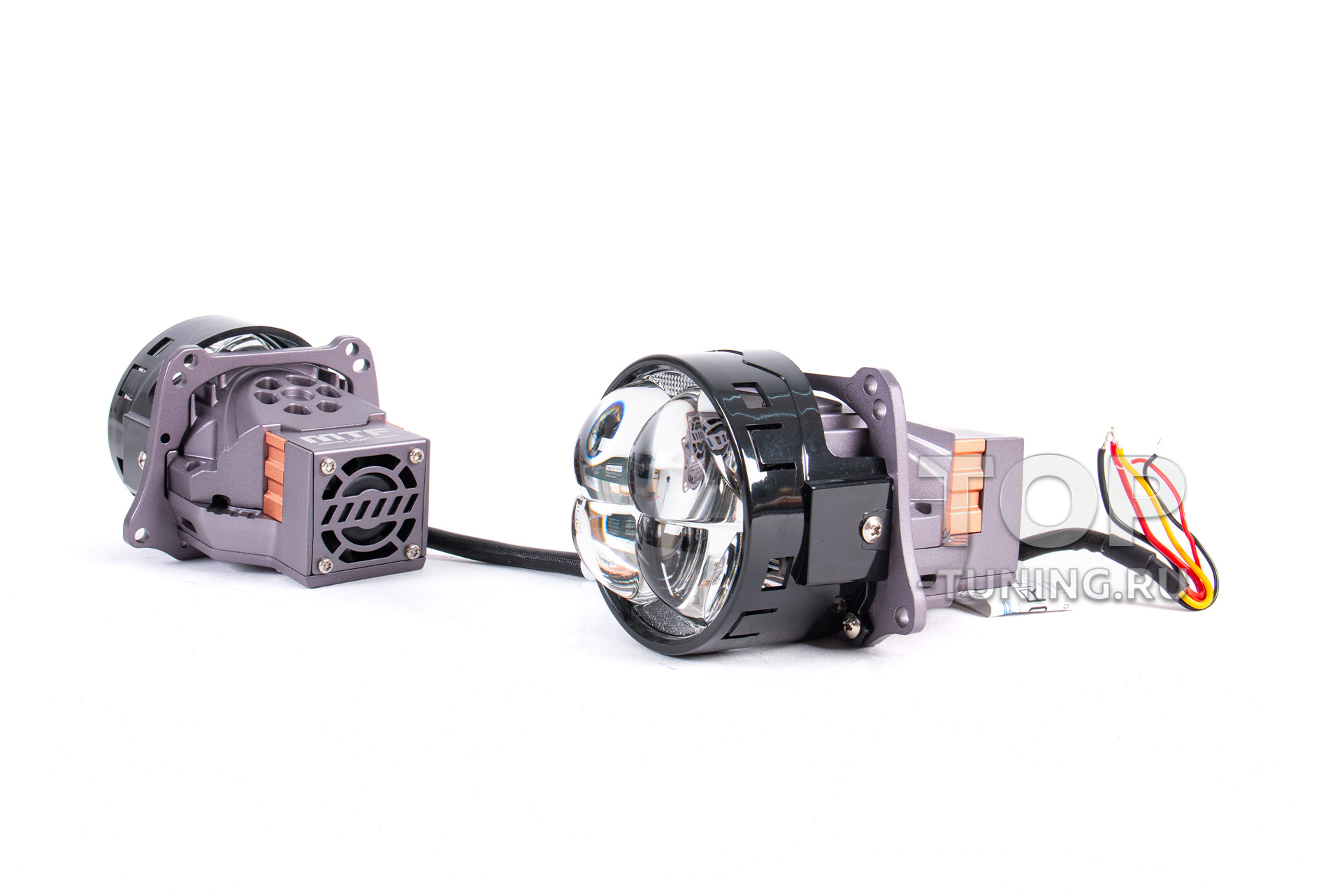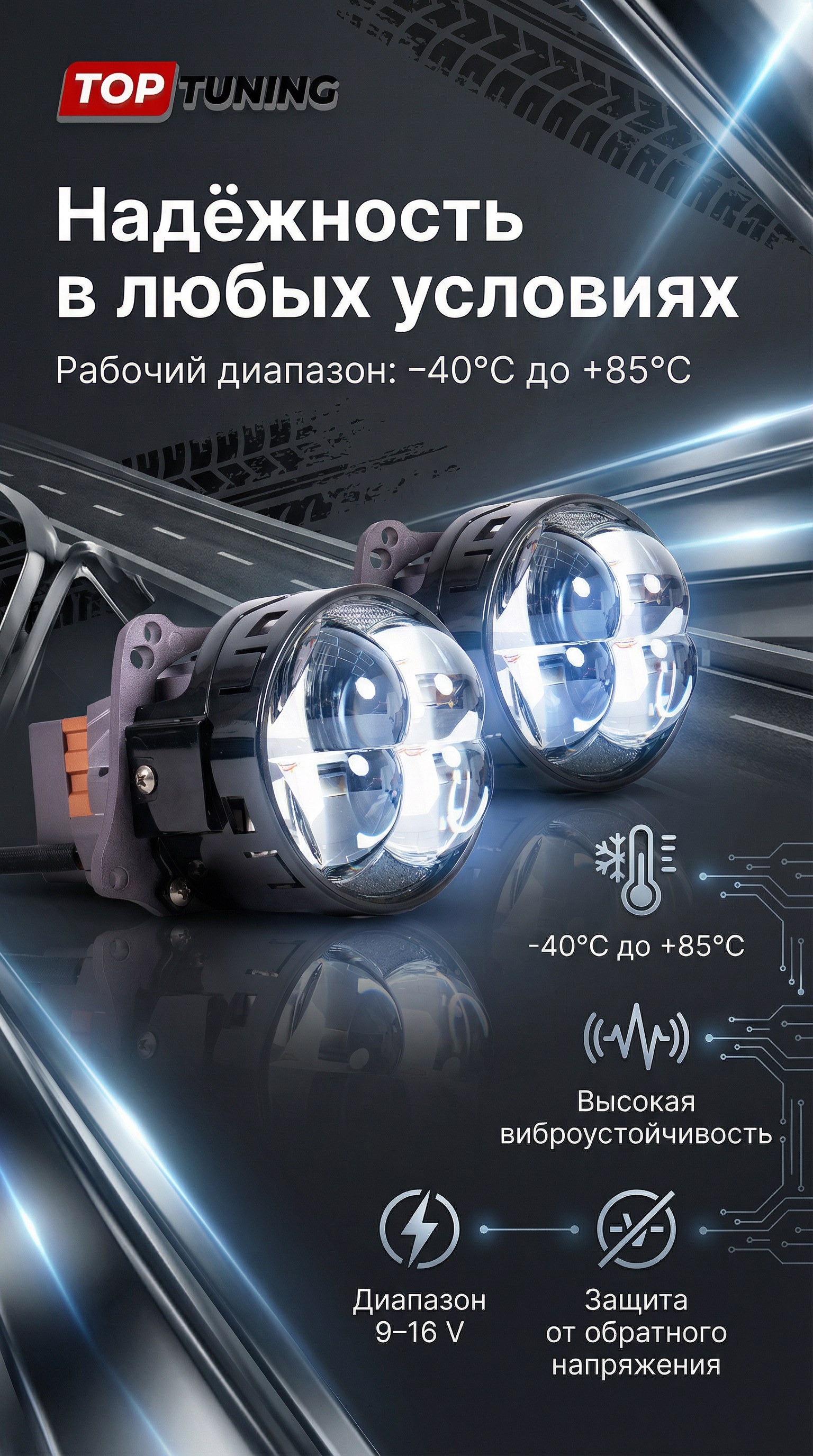 Конструкция предусматривает работу в двух режимах — ближний и дальний свет — без необходимости установки дополнительных источников освещения. Это делает систему универсальной для комплексного апгрейда оптики.