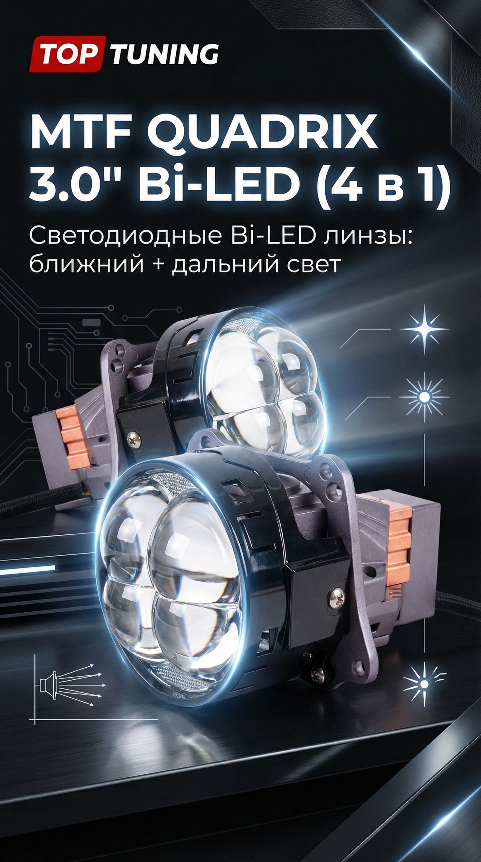 Светодиодные Bi-LED линзы MTF QUADRIX 3.0" (4 в 1) — это профессиональные проекторные модули ближнего и дальнего света, разработанные для комплексной модернизации головной оптики автомобилей с бортовой сетью 12V.