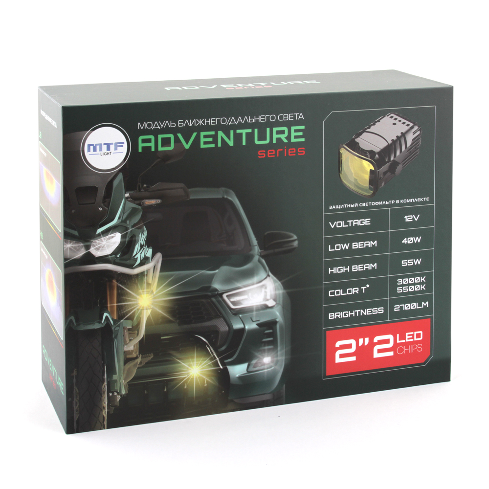Универсальные квадратные влагозащищённые светодиодные модули ближнего и дальнего света MTF Adventure 2" — это высокоэффективное решение для дооснащения оптики автомобилей, внедорожников, мототехники, скутеров и малотоннажного транспорта. Отличительная особенность — квадратная форма корпуса и встроенный откидной светофильтр, позволяющий переключать световой оттенок с холодного белого 5500К на насыщенный жёлтый 3000К для лучшей видимости в тумане и осадках.