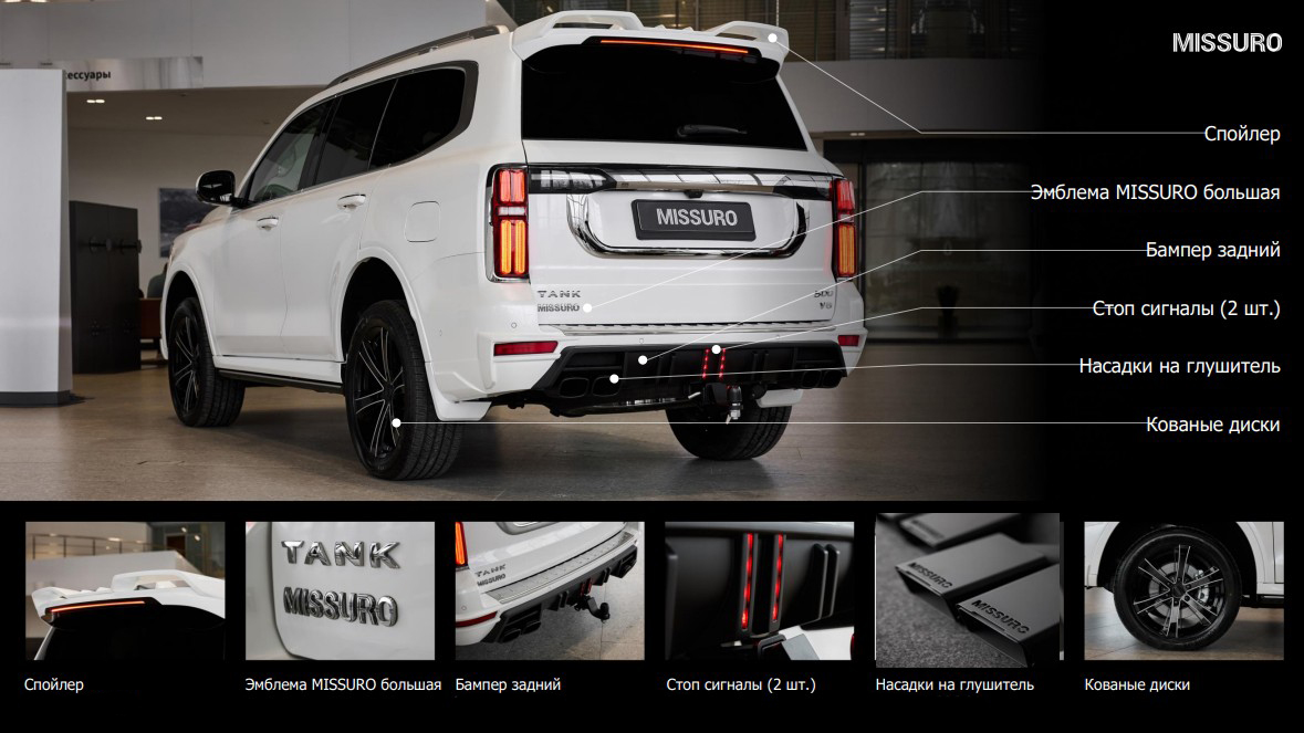 Обвес Missuro от Larte Design для Tank 500 разработан для тех, кто хочет подчеркнуть мощь и динамику автомобиля. Комплект включает тщательно спроектированные элементы из премиальных композитных материалов, которые гармонично дополняют оригинальный дизайн, придавая автомобилю более агрессивный и стильный вид. Все элементы обвеса идеально совместимы со штатными деталями и не требуют сложных модификаций.
