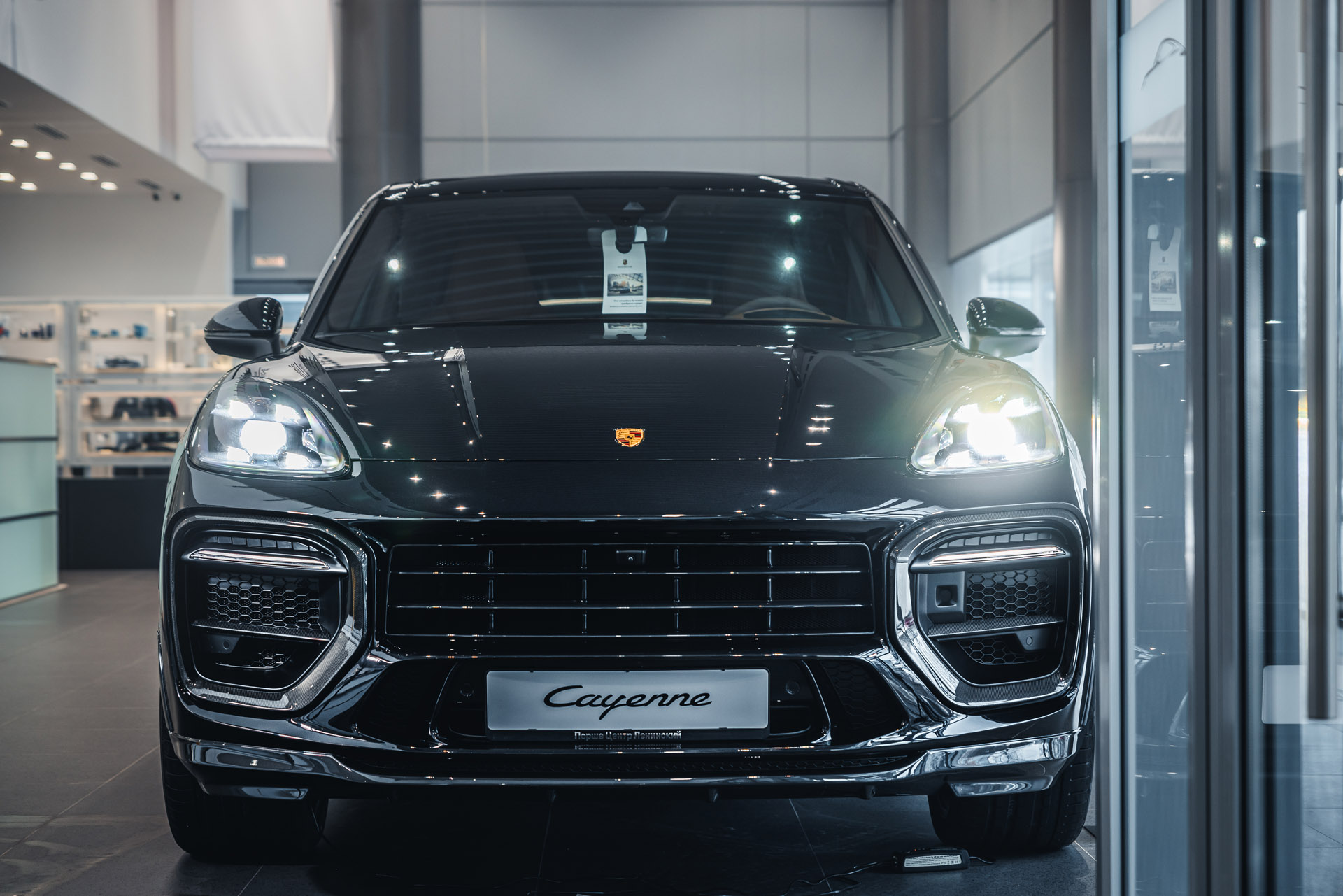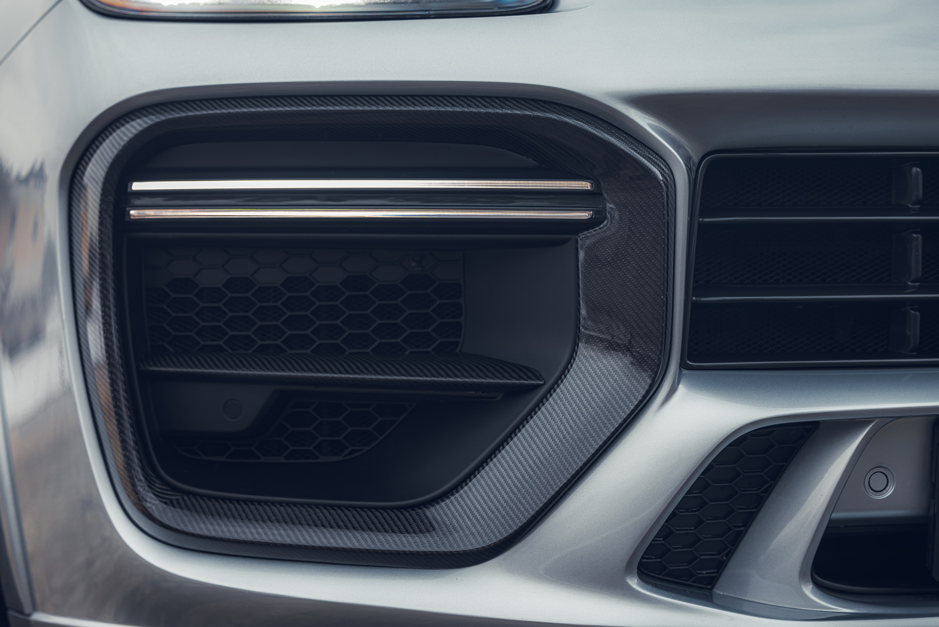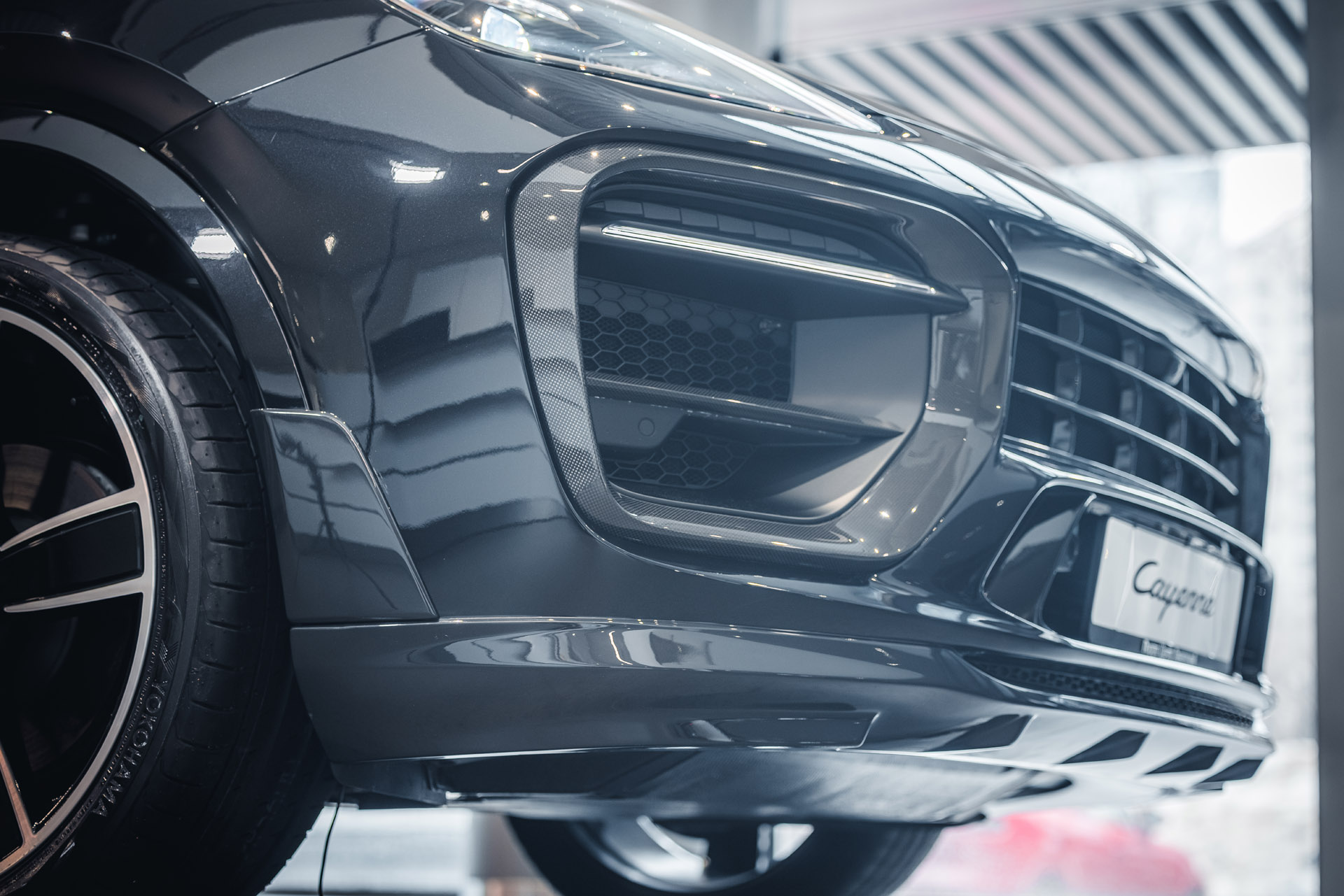 Передняя часть автомобиля полностью преображается за счёт переработанного бампера с расширенными воздуховодами, рельефными линиями и функциональной аэродинамикой. Компоновка элементов создаёт ощущение более широкого и низкого силуэта, подчеркивая спортивный характер Cayenne.