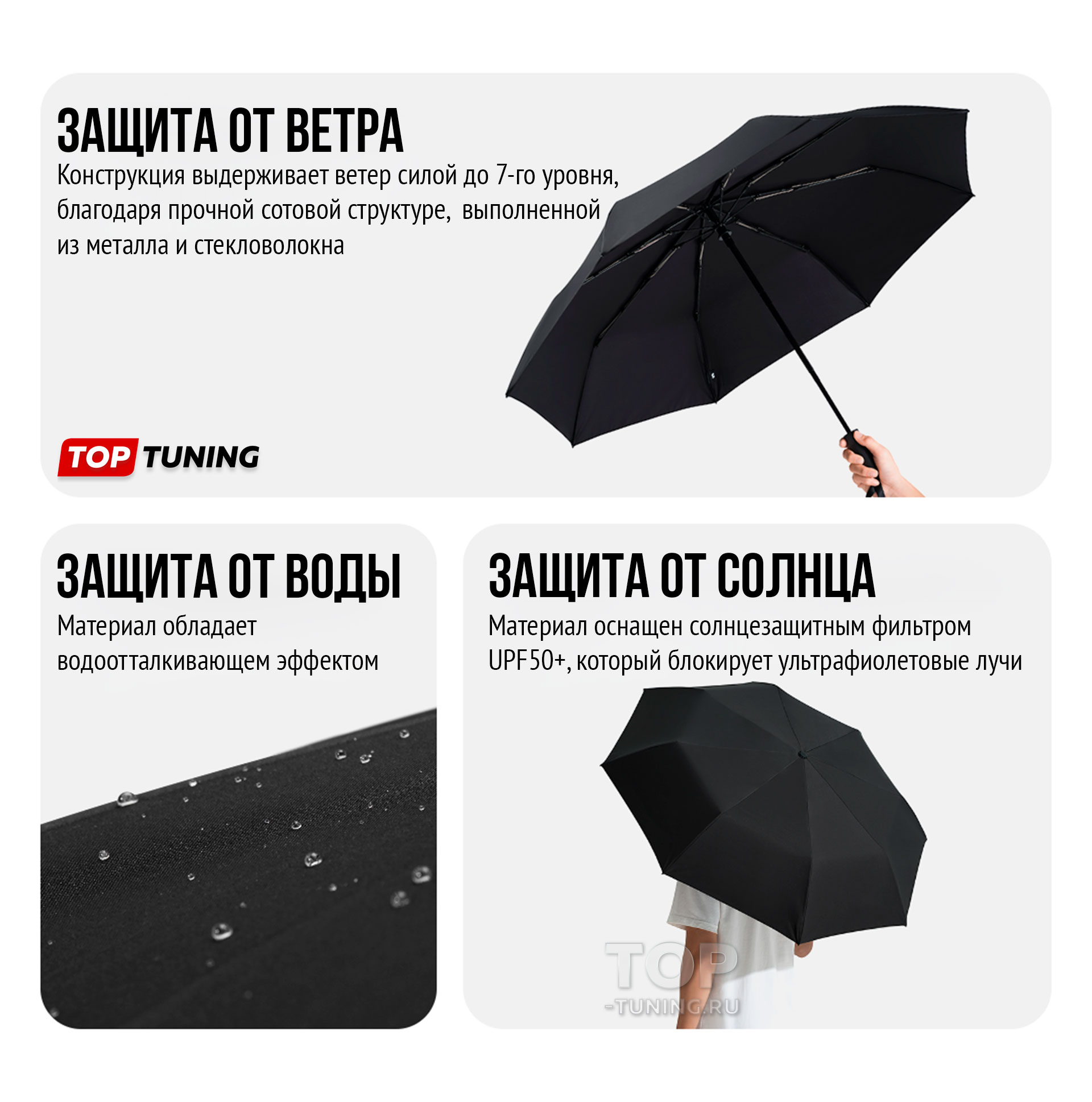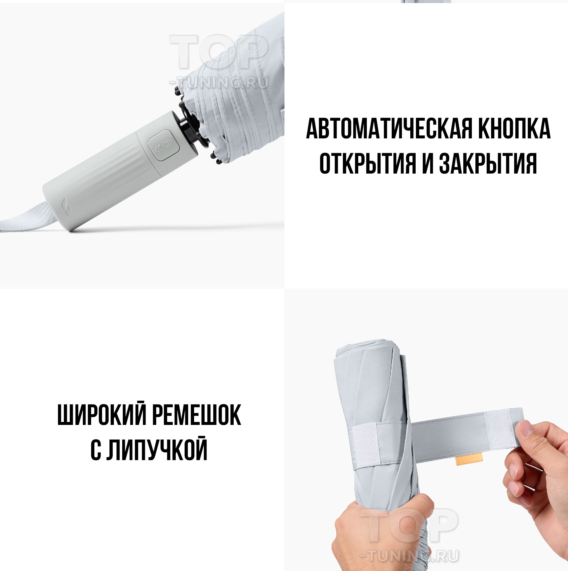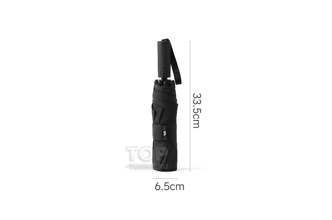 Для удобного хранения и складывания зонт оснащен широкой застежкой на липучке, а в сложенном виде его высота составляет 33,5 см, а диаметр — 6,5 см. Вес — 450 грамм.