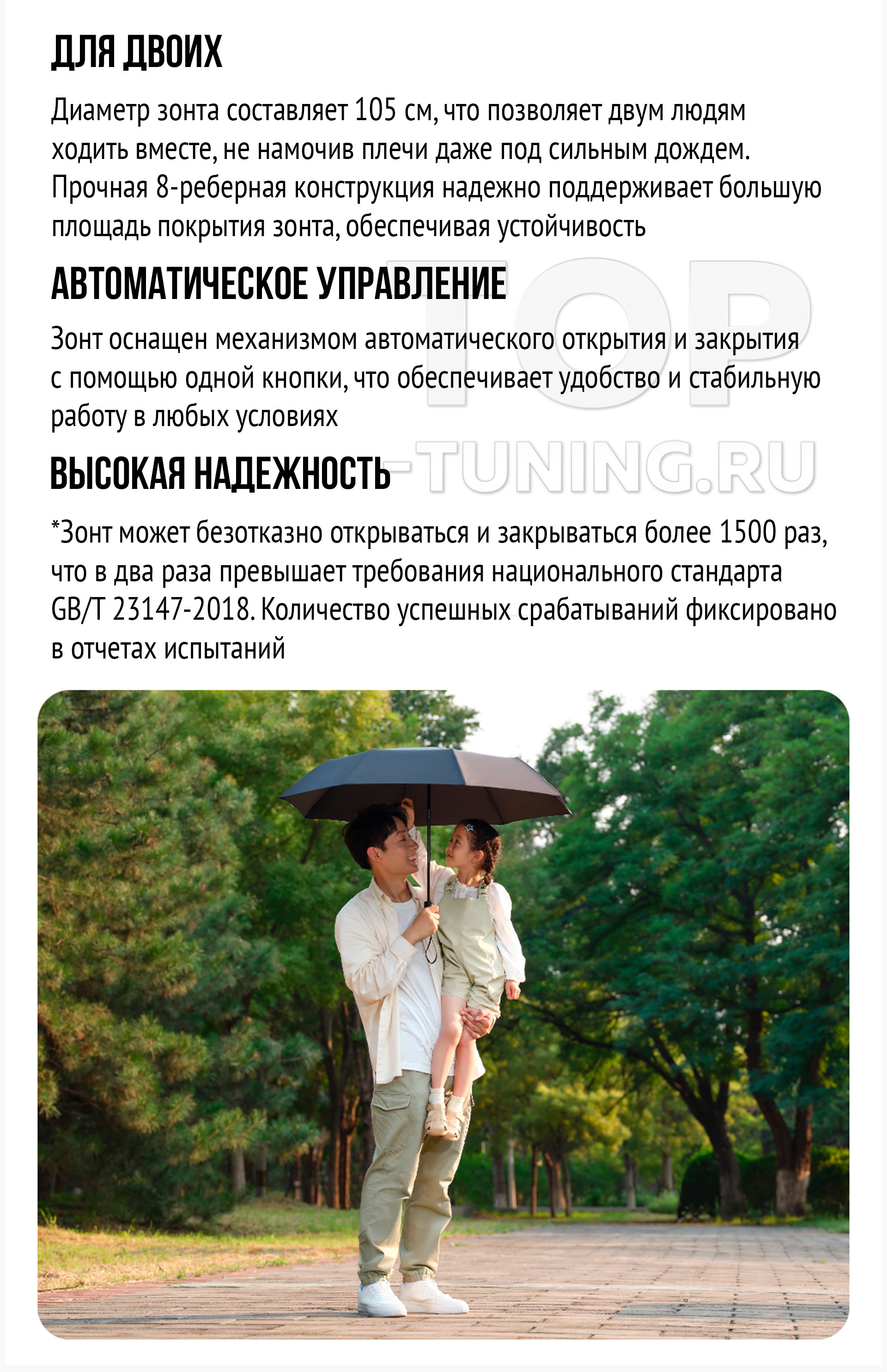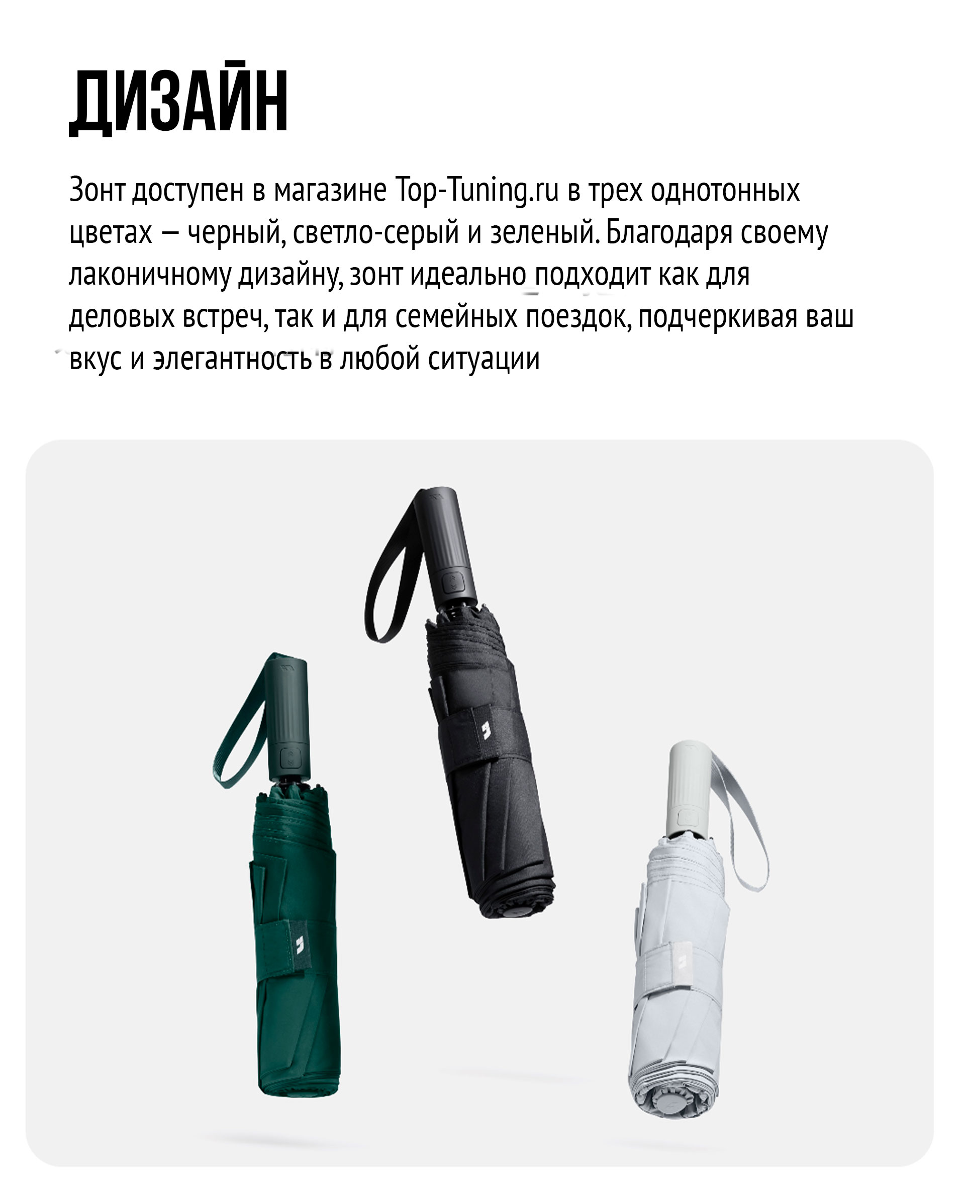 Зонт доступен в трех элегантных цветах: черный, зеленый и светло-серый. Диаметр купола в раскрытом состоянии составляет 105 см и имеет 8 ребер жесткости, что позволяет укрыть двух человек средней комплекции.