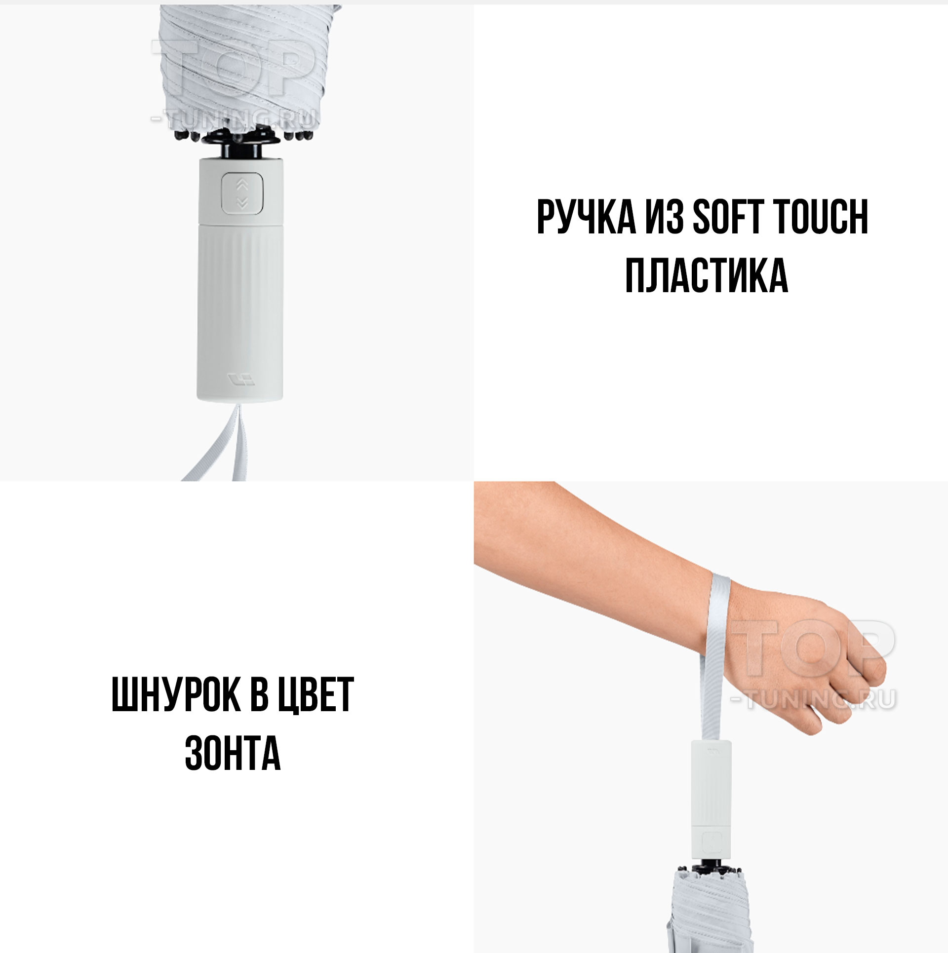 Ручка зонта изготовлена из приятного на ощупь софт-тач пластика, который не скользит в руке, обеспечивая комфортное использование в любых погодных условиях.