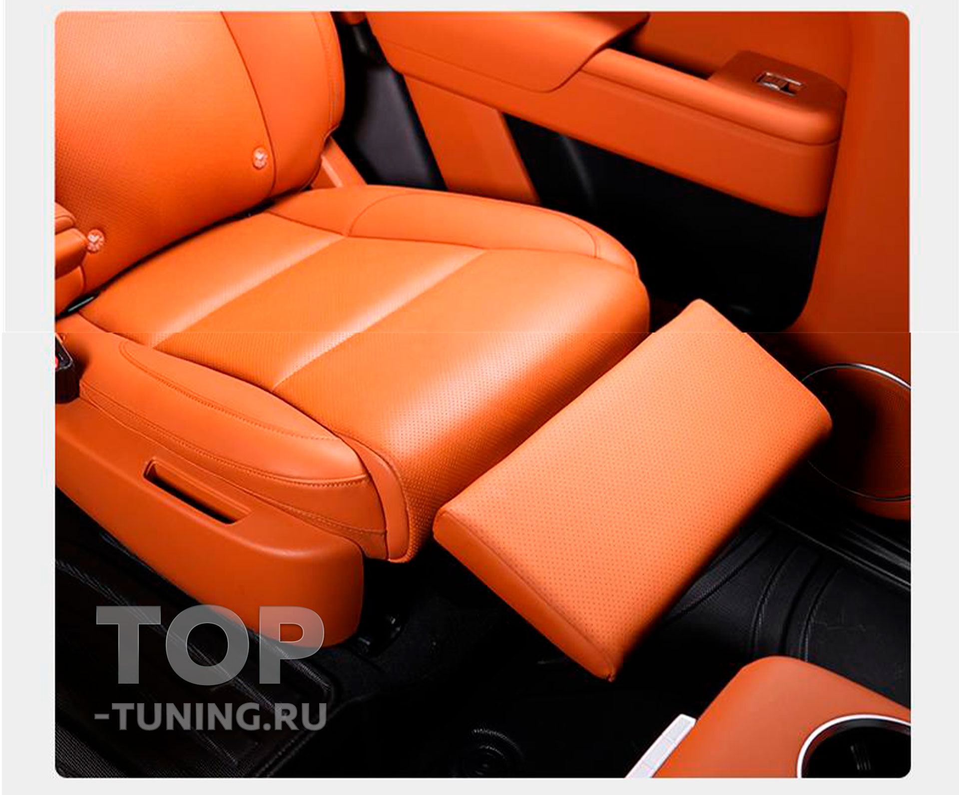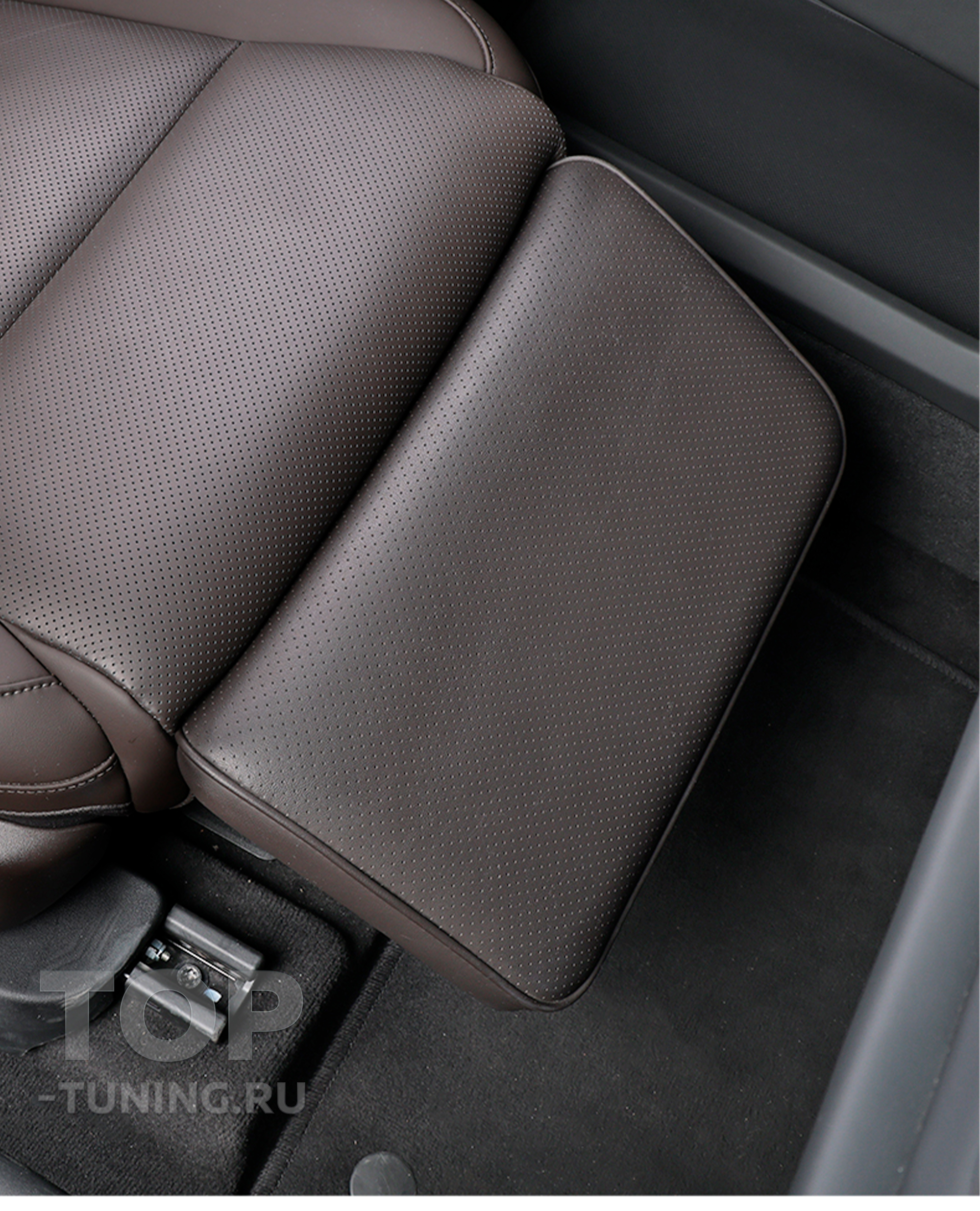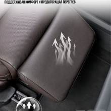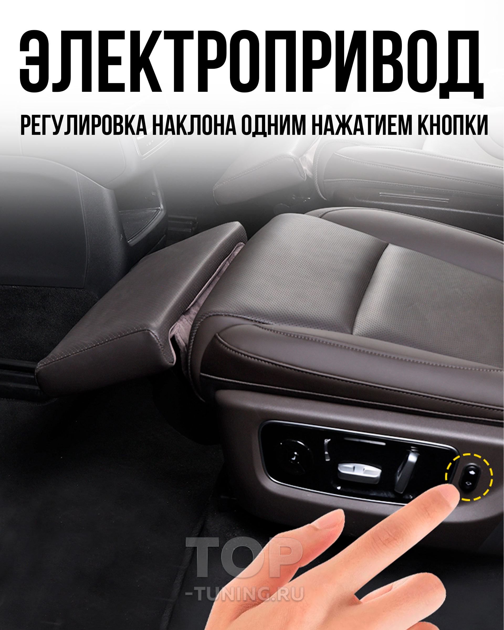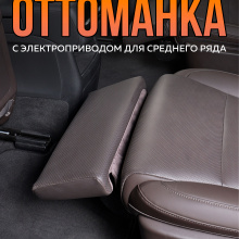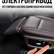 Электропривод обеспечивает плавную регулировку угла наклона, а индивидуальная кнопка управления делает использование простым и интуитивным. Каркас конструкции изготовлен из прочной стали, а обивка выполнена из качественной перфорированной экокожи в цвет интерьера автомобиля, что подчёркивает её заводской вид. Это не просто аксессуар — это элемент комфорта бизнес-класса, интегрированный в повседневную поездку..