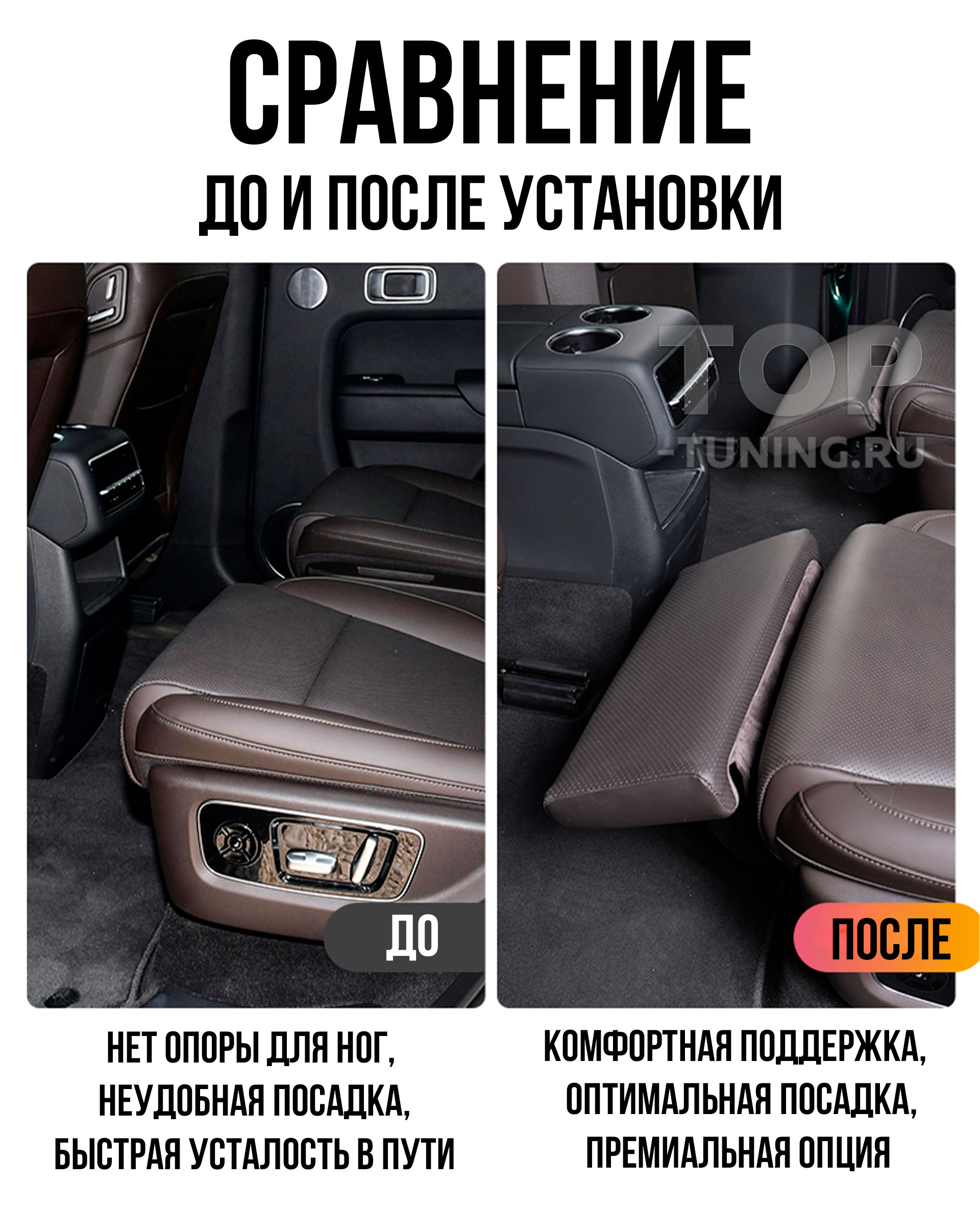 Оттоманка для среднего ряда Lixiang L8 / L9 — это продуманное до мелочей решение, позволяющее превратить второй ряд сидений в полноценную зону премиального отдыха. В отличие от штатной компоновки, где пассажирам не хватает опоры для ног, подставка устраняет дискомфорт при длительных поездках и помогает сохранить правильную посадку.