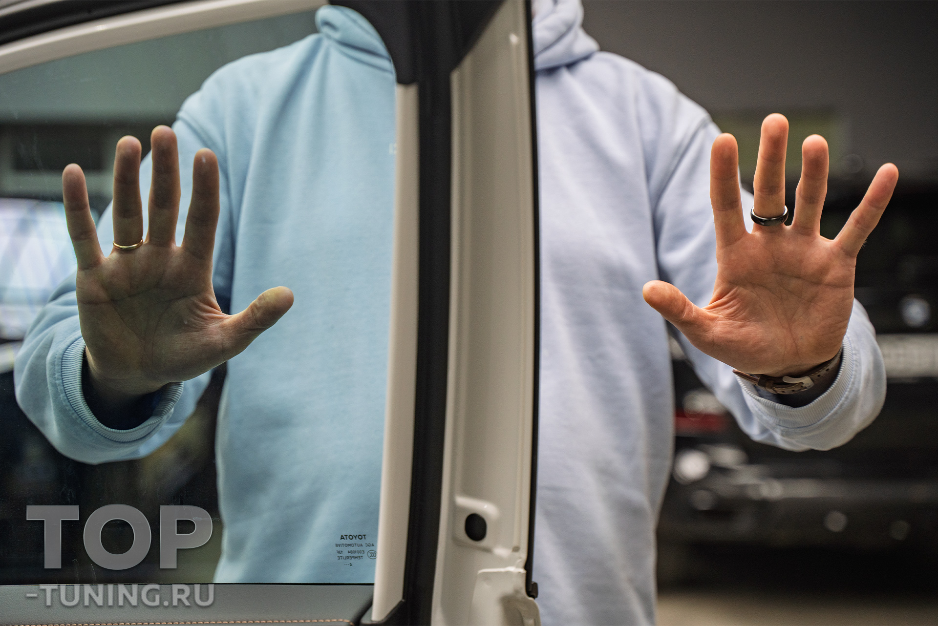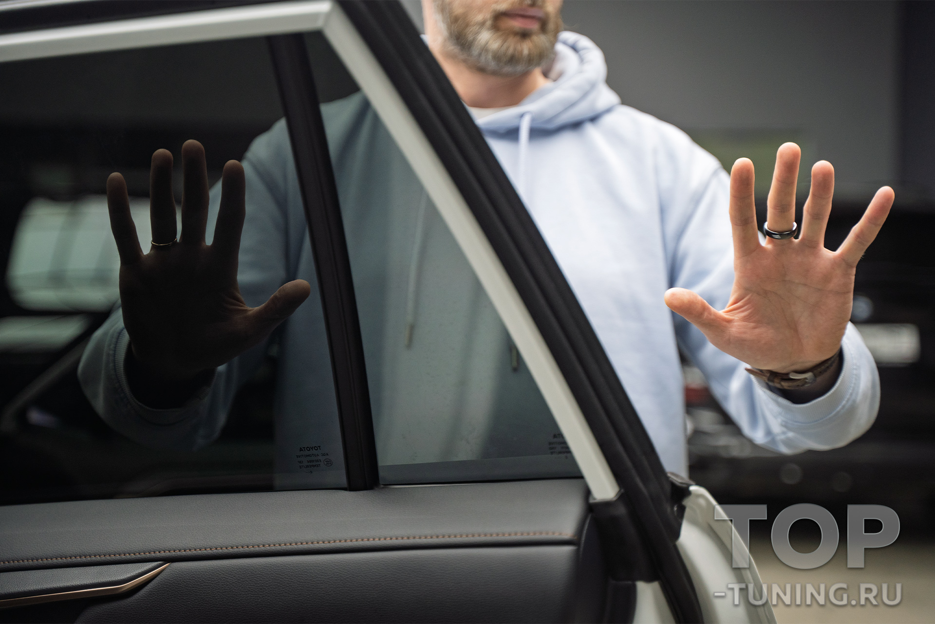 Задняя полусфера новой Тойота была оклеена пленкой с 5% светопроводимостью, что формирует повышенную конфиденциальность для пассажиров на заднем ряду. Передние боковые стекла были оклеены пленкой с 70% светопроводимостью.