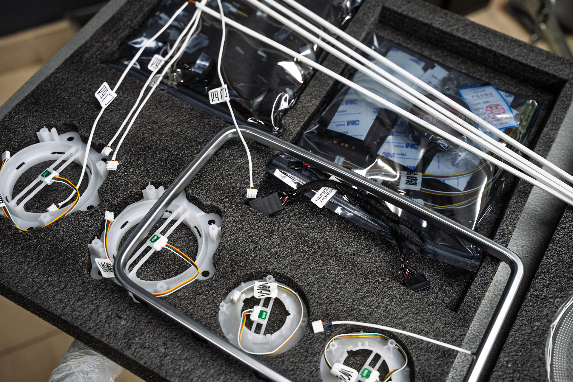 Комплект — не просто набор светодиодов, а продуманная до последнего миллиметра система. Металлические сетки для нижних динамиков, аккуратные рассеиватели в верхние, тонкие RGB-линии взамен скучных заводских лампочек. Дооснащение не нарушает внешний образ салона, а подчеркивает преимущества штатного дизайна.