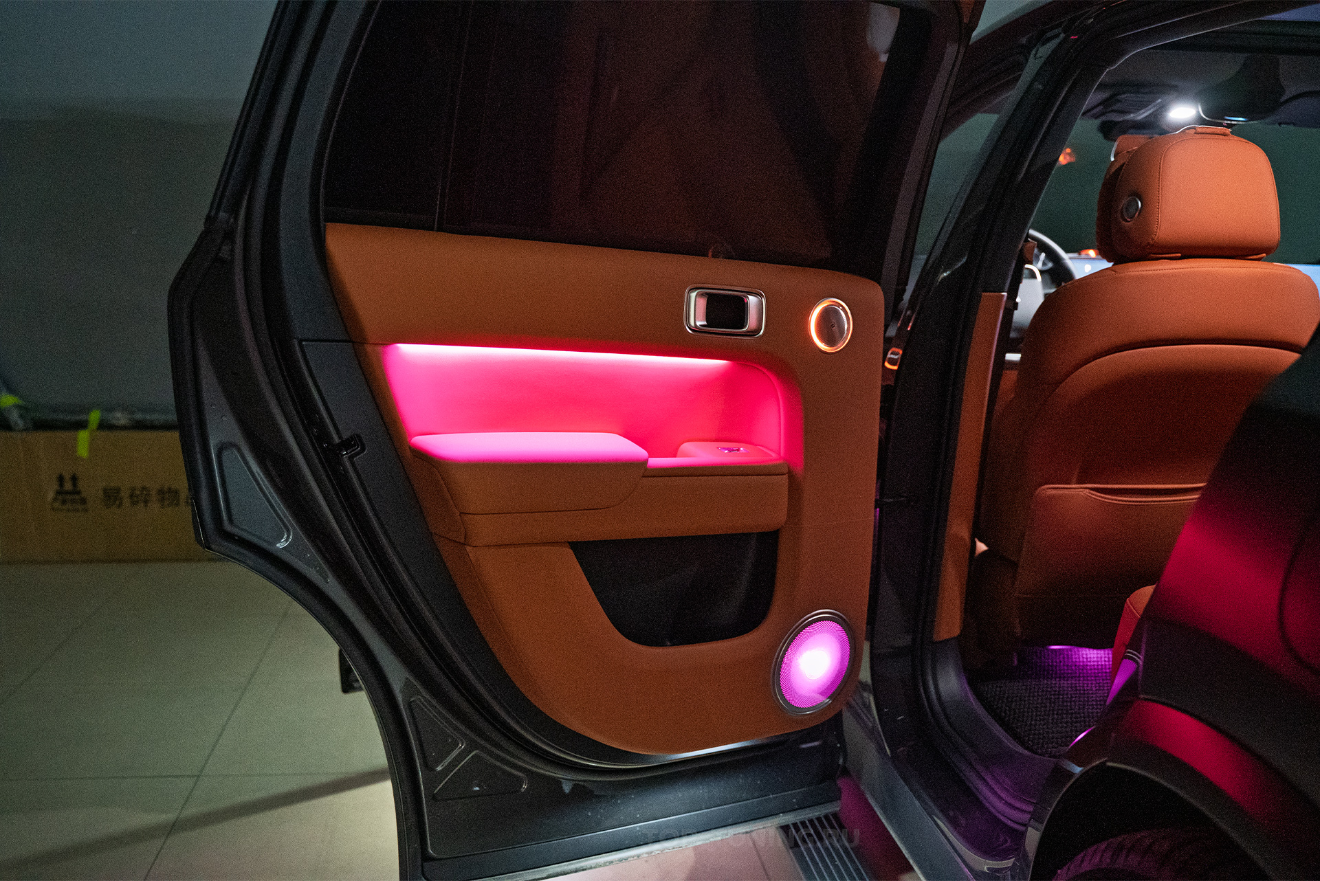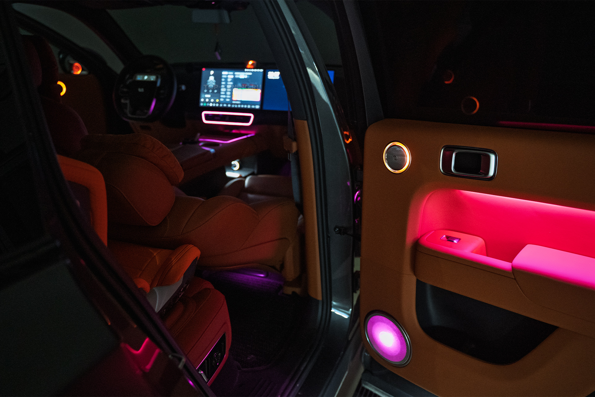 Фишка — не только в эстетике, но и в том, как свет интегрирован. Подсветка «встраивается» в двери, торпедо и даже в консоль беспроводной зарядки Lixiang L7. В ногах — аккуратные RGB-плафоны, создающие мягкое свечение, не слепящее, а направляющее. Особенно актуально ночью, когда привычные элементы салона буквально оживают в новом свете.