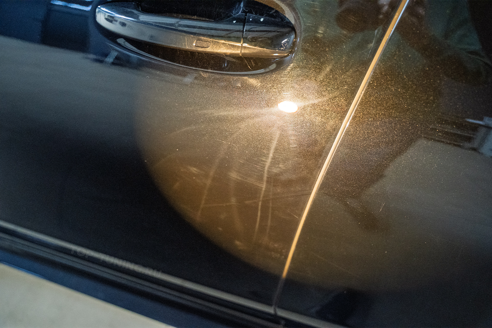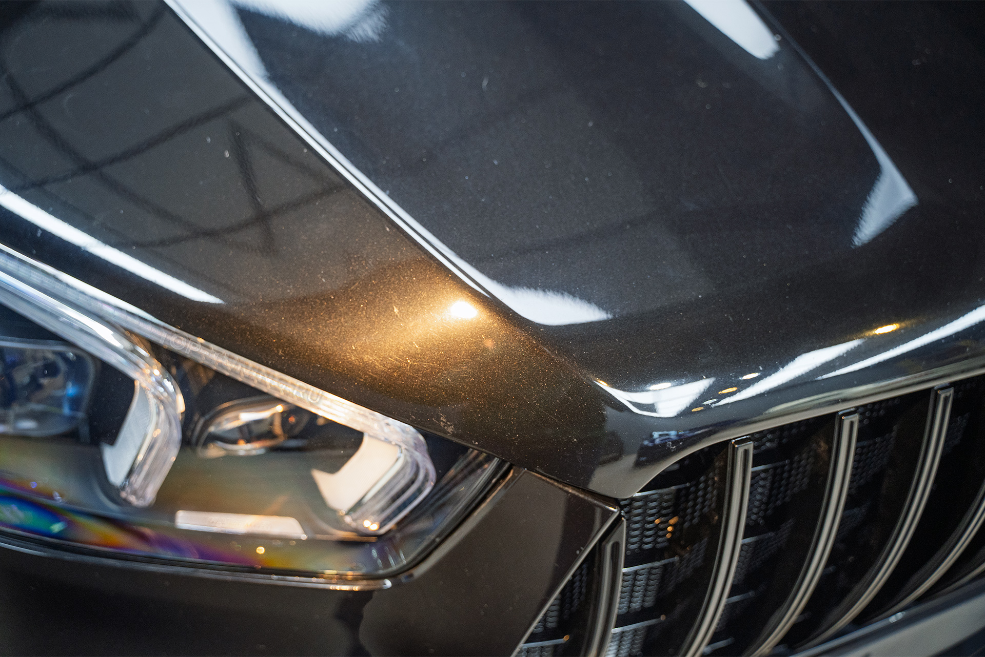 Передняя часть изначально была защищена плёнкой, от демонтажа которой хозяин авто осознанно отказался: плёнка продолжает исполнять роль барьера, а любое снятие — риск для оригинального лака под ней. Мастера Топ Тюнинг выбрали щадящую методику освежения. Задачей было не стереть тонкий слой материала, а вернуть оптическую глубину, приглушить голограммы и выровнять микрорельеф без малейшего намёка на помутнение или пробой плёнки. Такой подход позволил освежить «лицо» автомобиля, сохранив защитный слой там, где он действительно нужен каждый день.