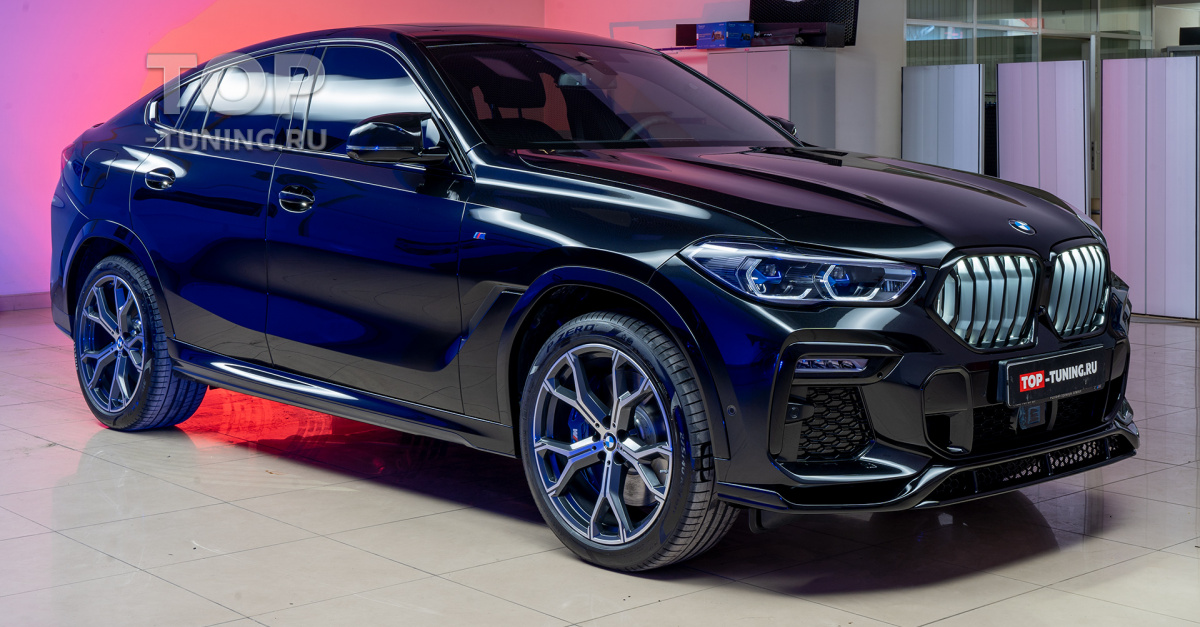 Предварительно окрашенные в цвет кузова крышки, установлены на штатные крепления. Стандартная решетка радиатора Х6 с подсветкой Iconic Glow так же подверглась доработке. Ставшая традиционной для Топ Тюнинг работа по оклейке "ноздрей" черной пленкой наиболее востребованная услуга среди владельцев желающих добавить индивидуальности своему авто с сохранением фирменной фишки BMW X6 G06.