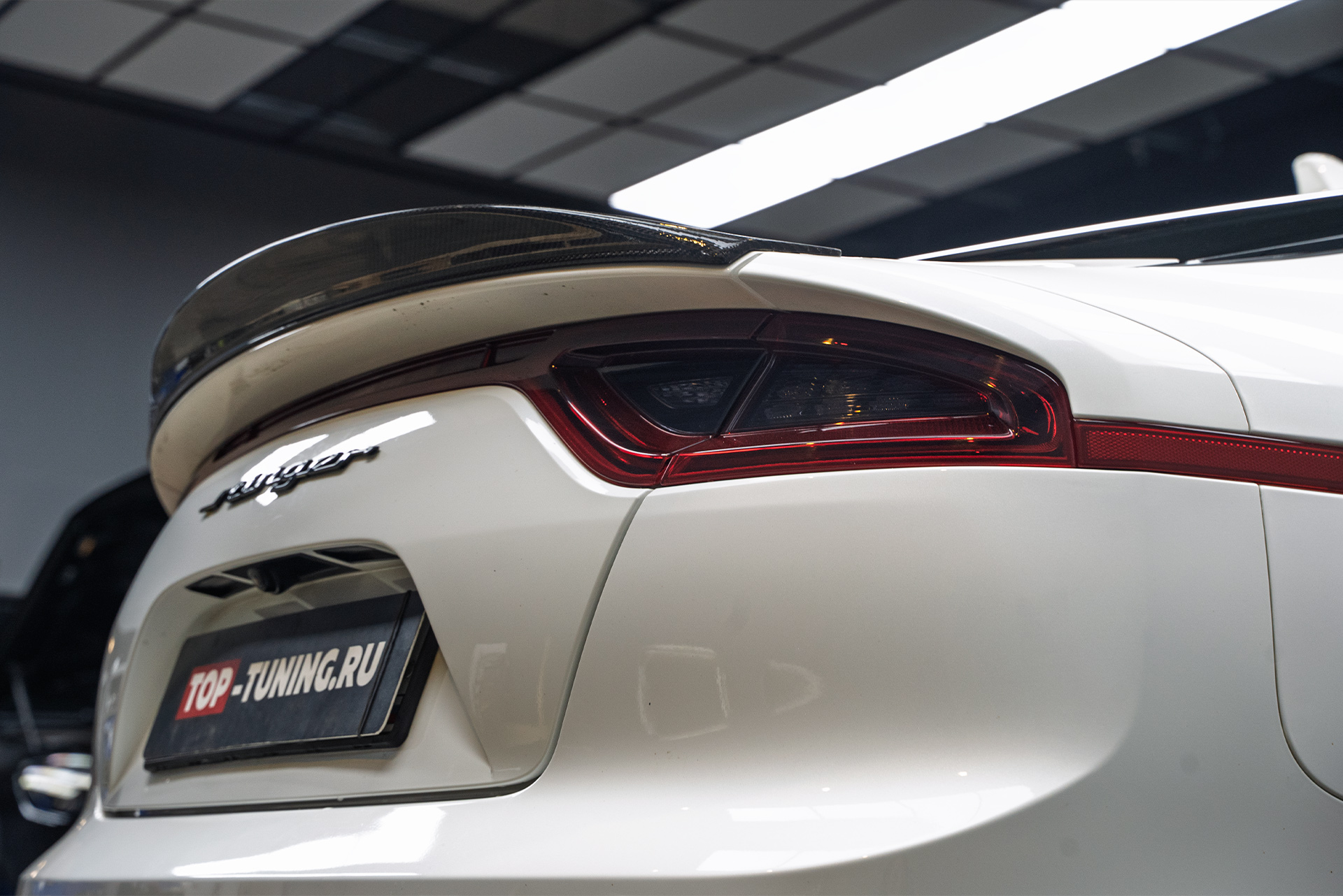 - Спойлер на крышку багажника. Заключительный аэродинамический штрих. Карбоновый лип-спойлер с идеальной точностью повторяет сложный контур пятой двери Стингера. Он не выглядит инородным элементом, а кажется естественным, заводским продолжением кузова.