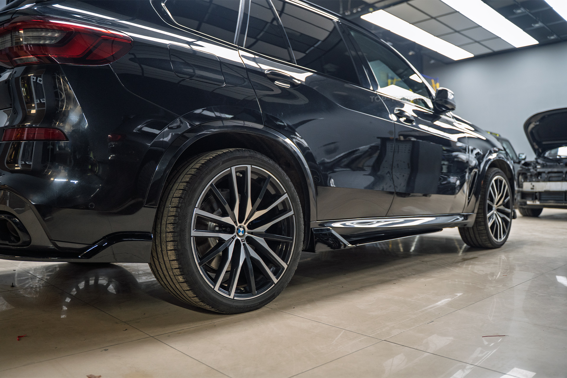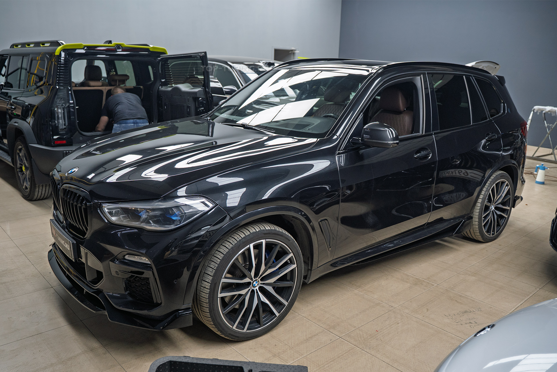 Монтаж выполнялся штатным образом: все детали устанавливаются на заводские крепления, а для надёжности мастерами был задействован стекольный герметик. В результате владелец получил не просто обновлённый экстерьер, а новый характер автомобиля. Теперь BMW X5 G05 в стандартной комплектации можно сравнивать с версией в М-пакете.