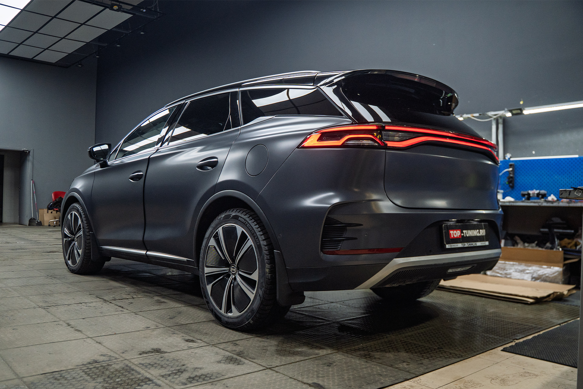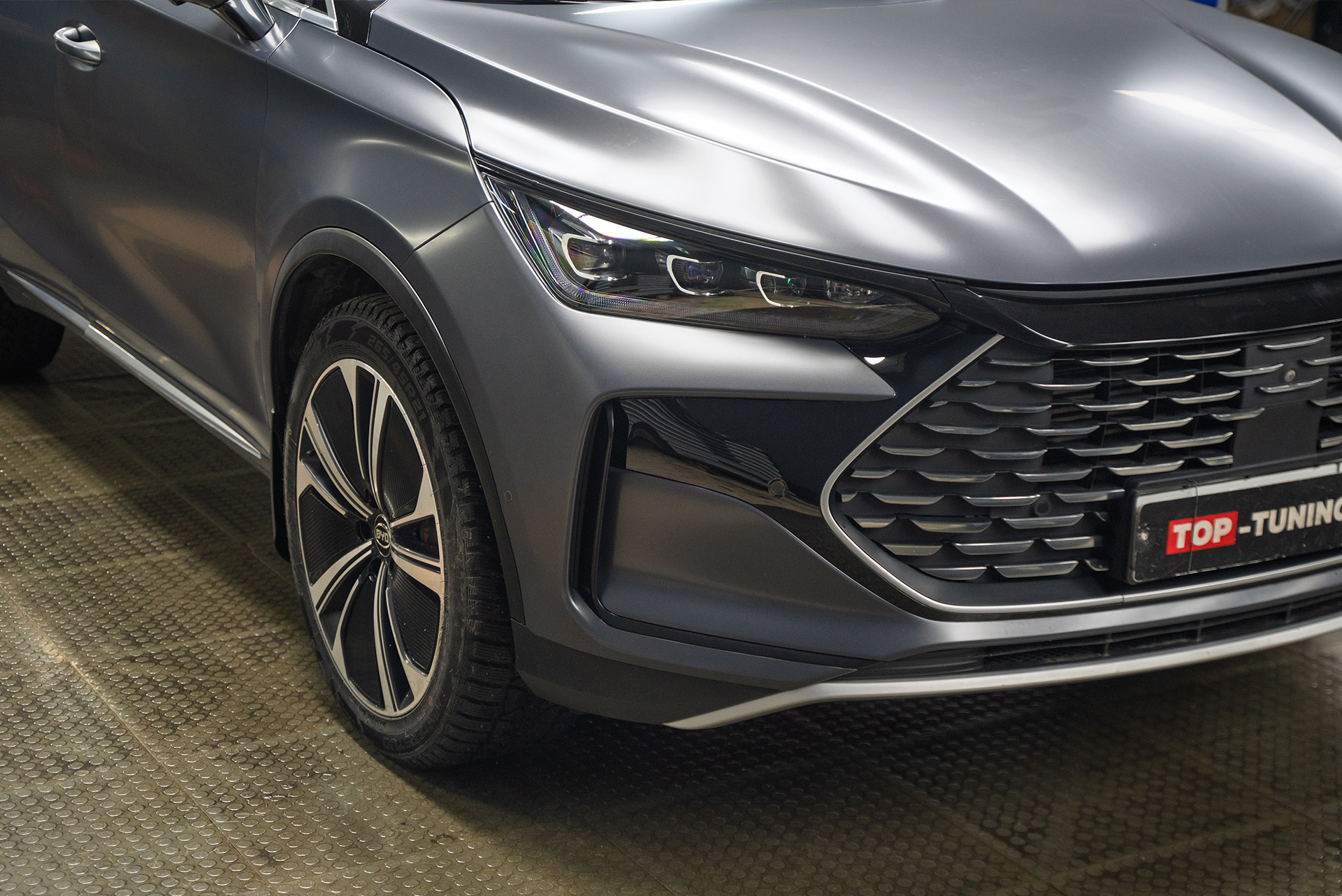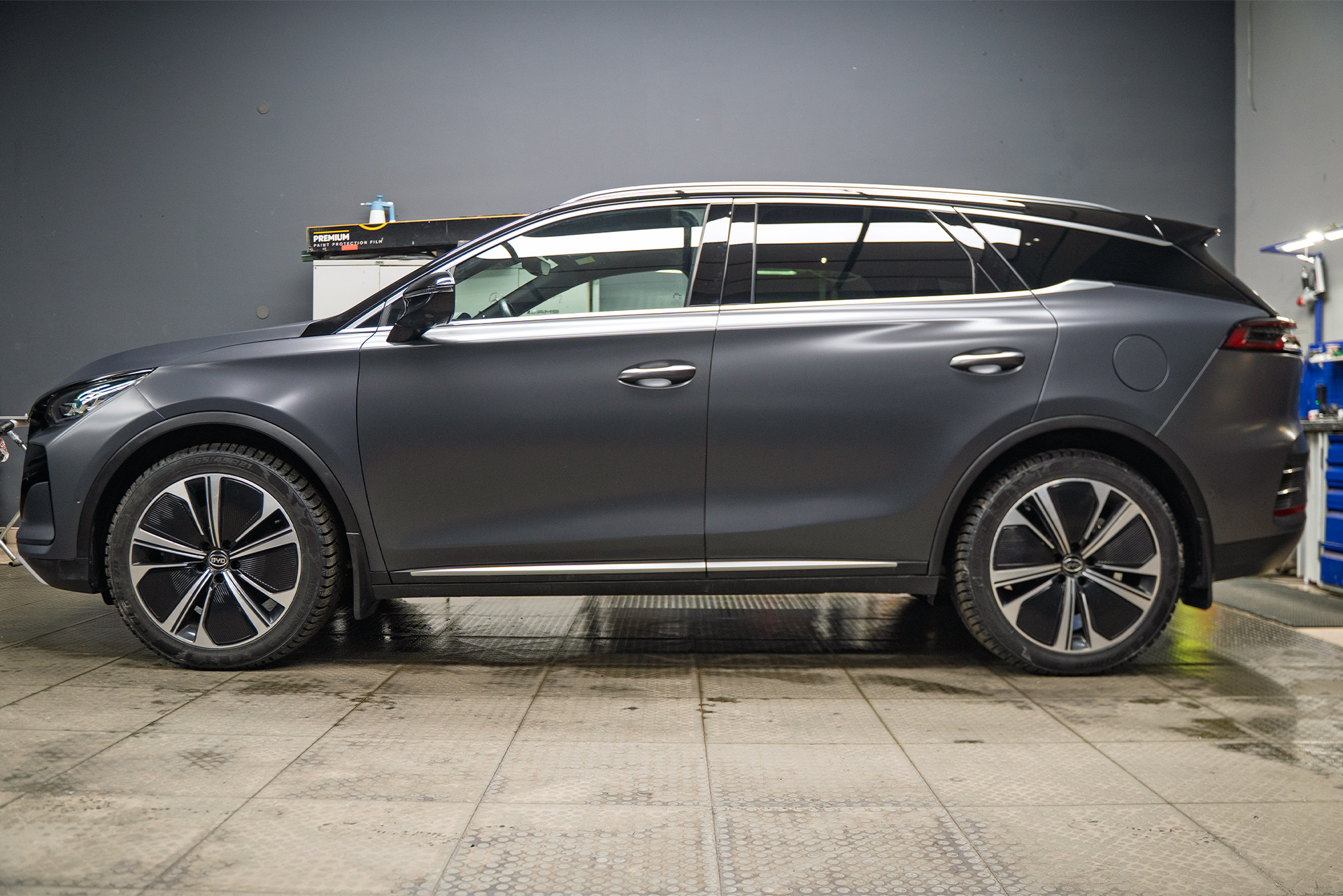 Когда кузов китайского премиум-кроссовера был приведен в порядок, пришло время главного преображения. Владелец выбрал не просто прозрачную защиту, а стилизацию — покрытие лака в полуматовый сатиновый полиуретан, за исключением панорманой крыши – она была оклеена в черную глянцевую пленку. Выбранные подход убивает двух зайцев разом: надежно защищает и кардинально меняет восприятие автомобиля – то, что хотел хозяин Биайди.