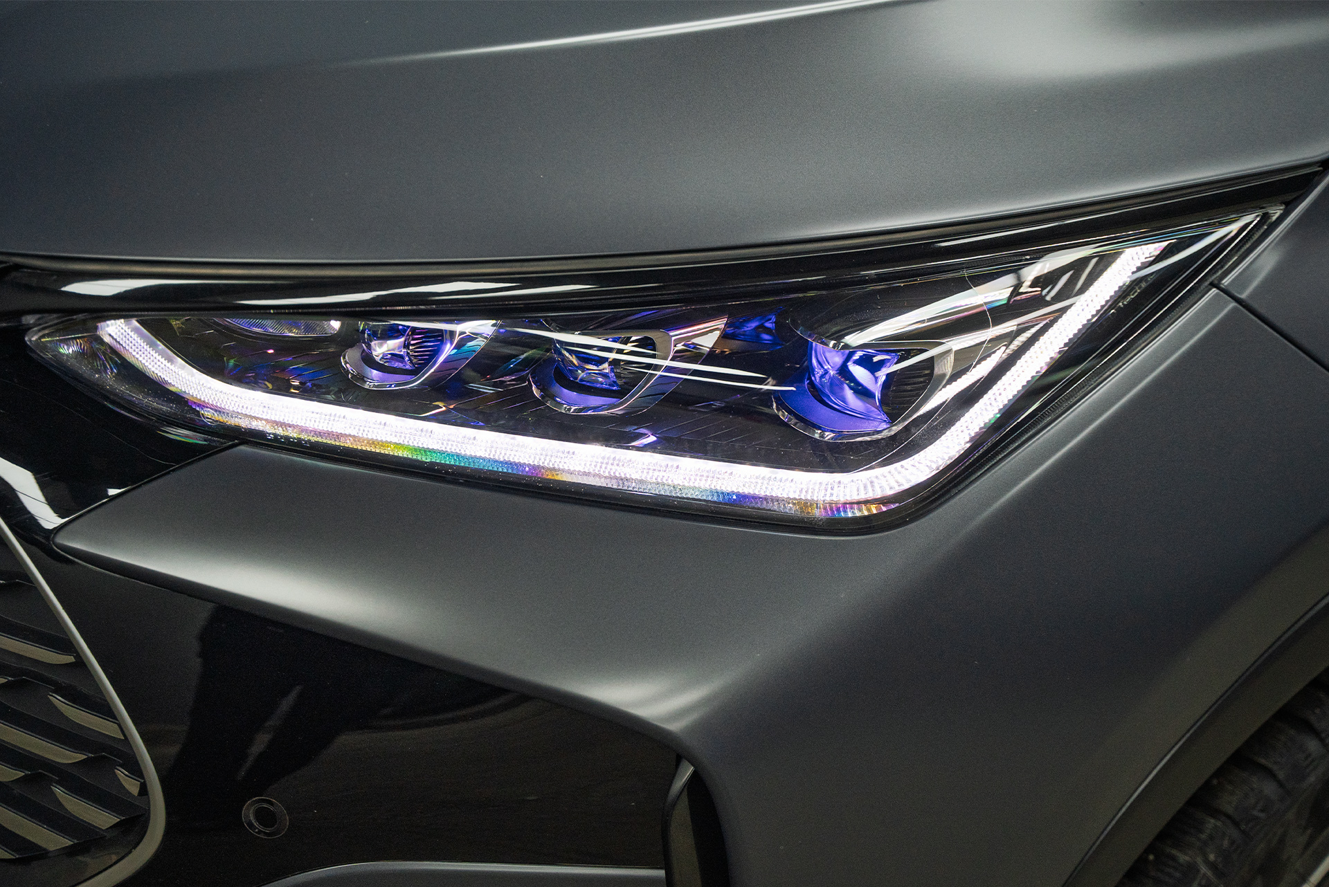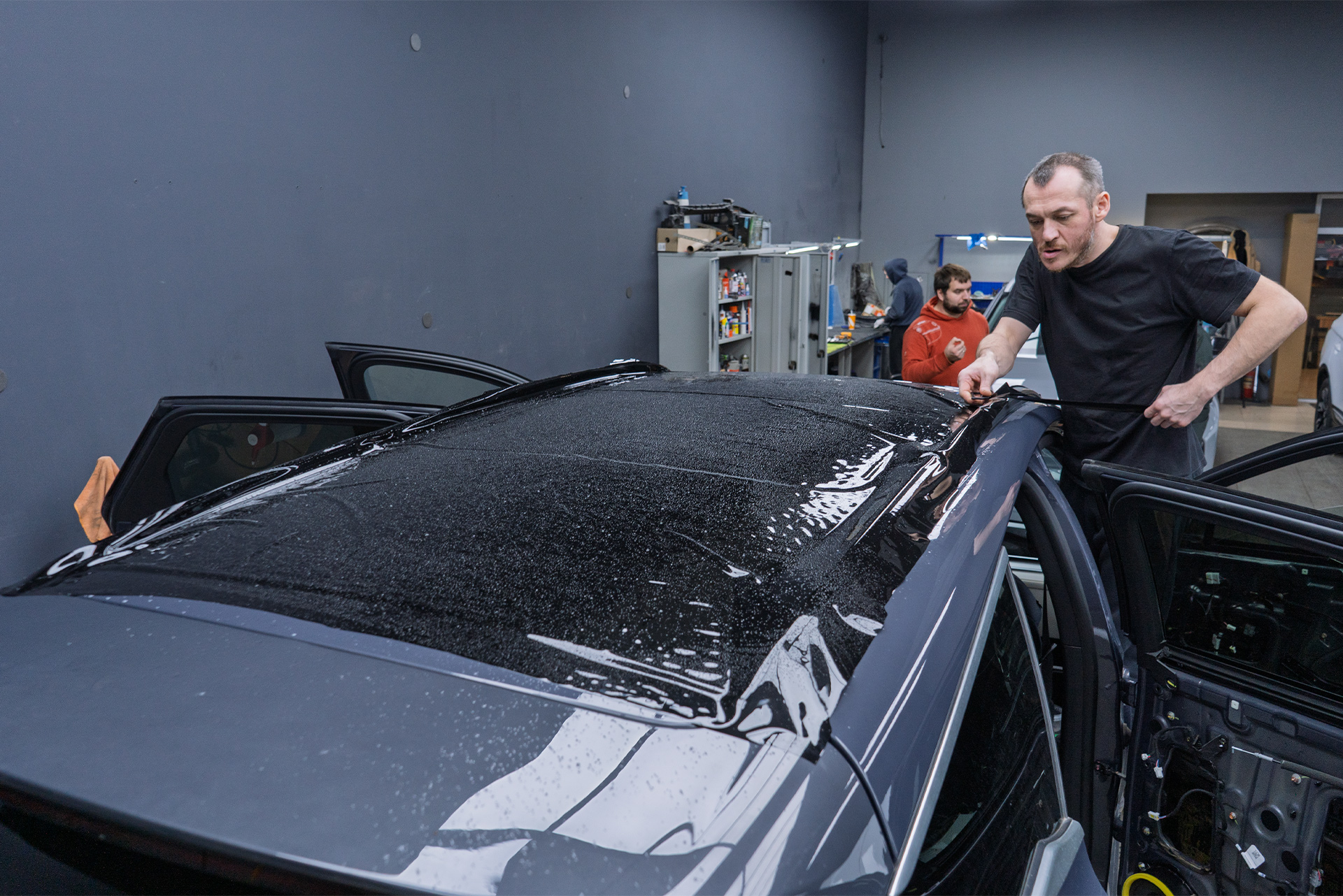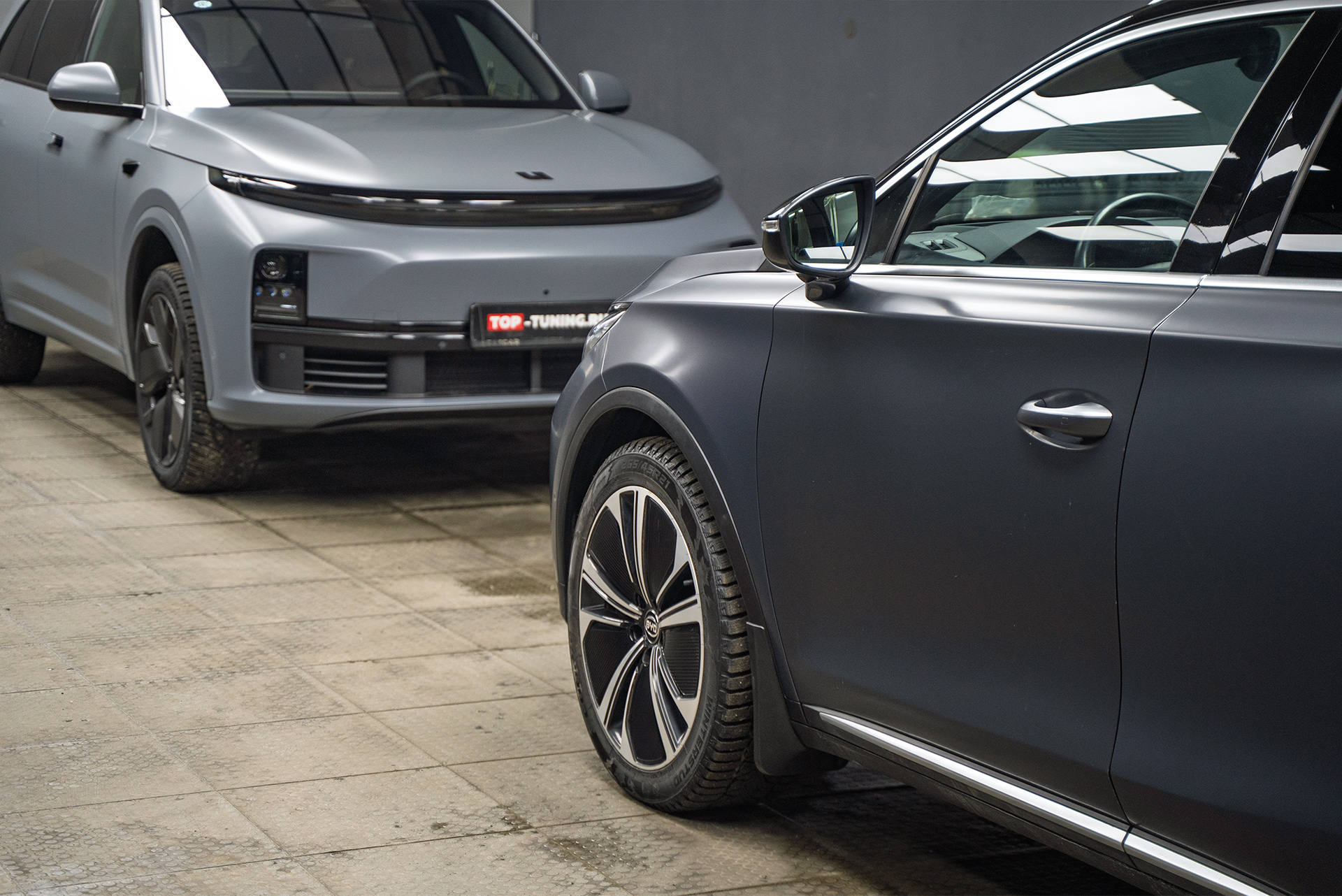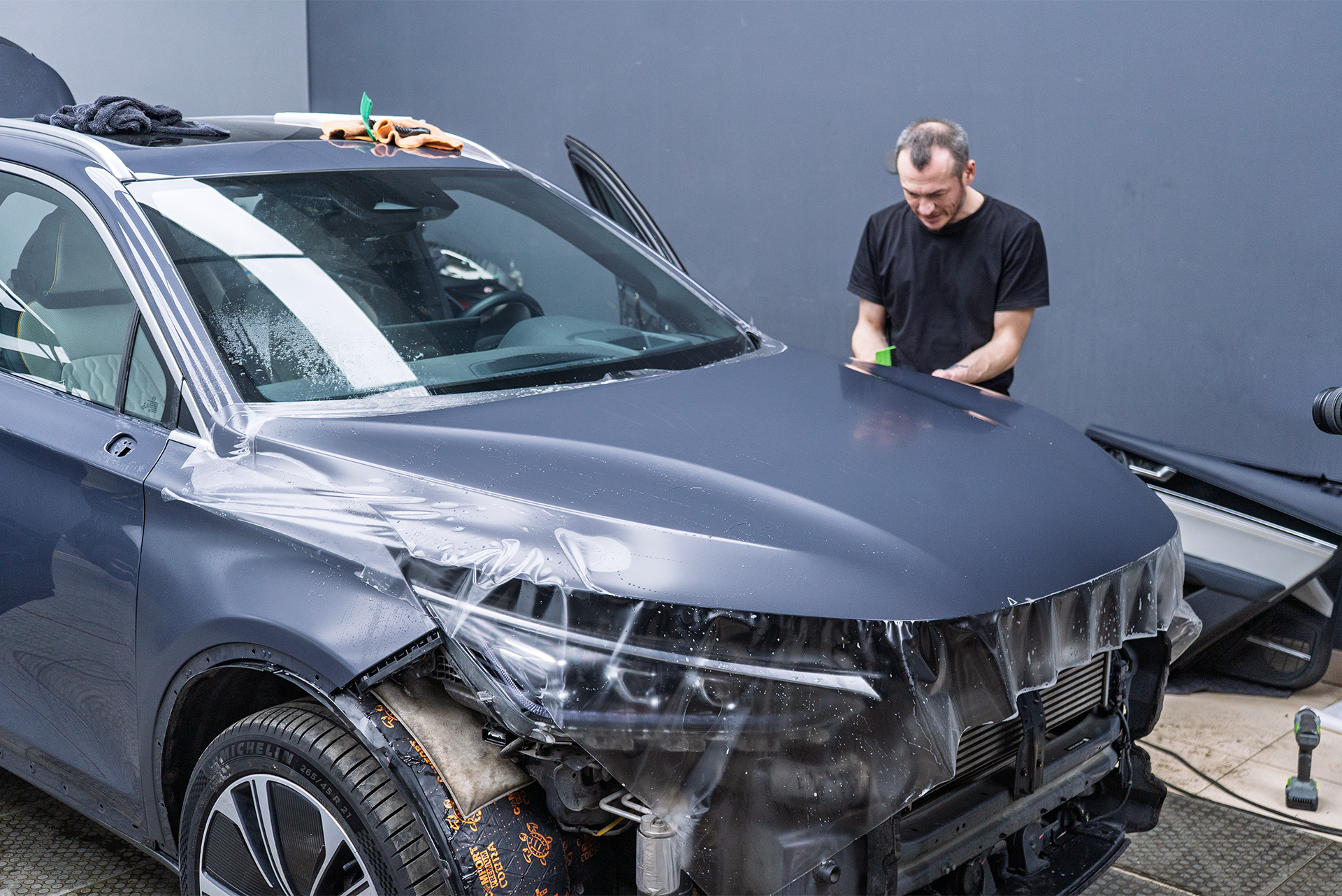 Когда кузов китайского премиум-кроссовера был приведен в порядок, пришло время главного преображения. Владелец выбрал не просто прозрачную защиту, а стилизацию — покрытие лака в полуматовый сатиновый полиуретан, за исключением панорманой крыши – она была оклеена в черную глянцевую пленку. Выбранные подход убивает двух зайцев разом: надежно защищает и кардинально меняет восприятие автомобиля – то, что хотел хозяин Биайди.
