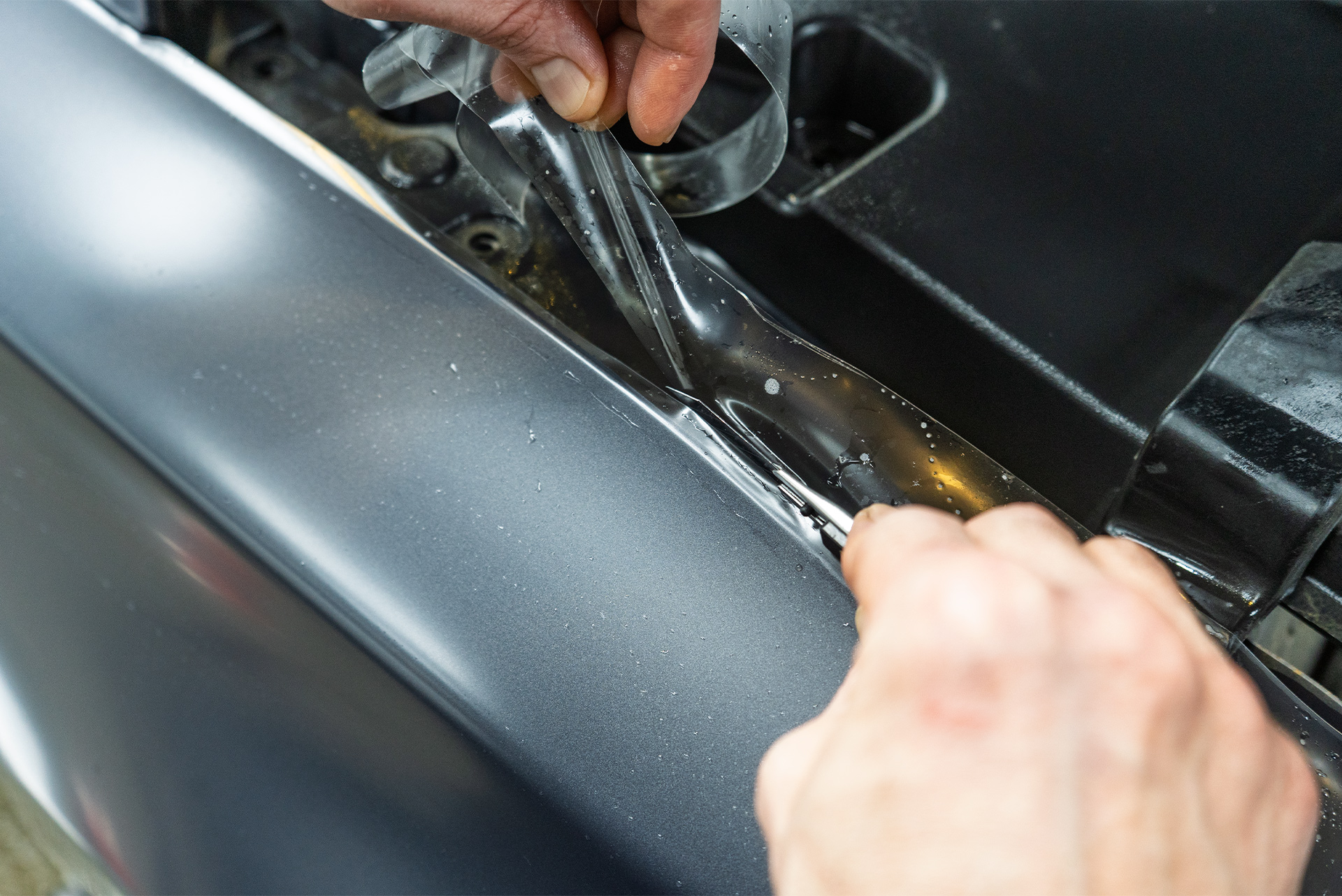 С колесными арками и подкрылками работа идет также из разных плоскостей. Металл арок Биайди предварительно тщательно очищается и обезжиривается для максимальной адгезии.