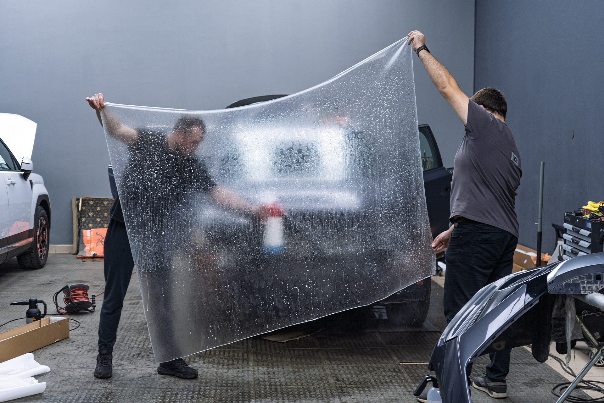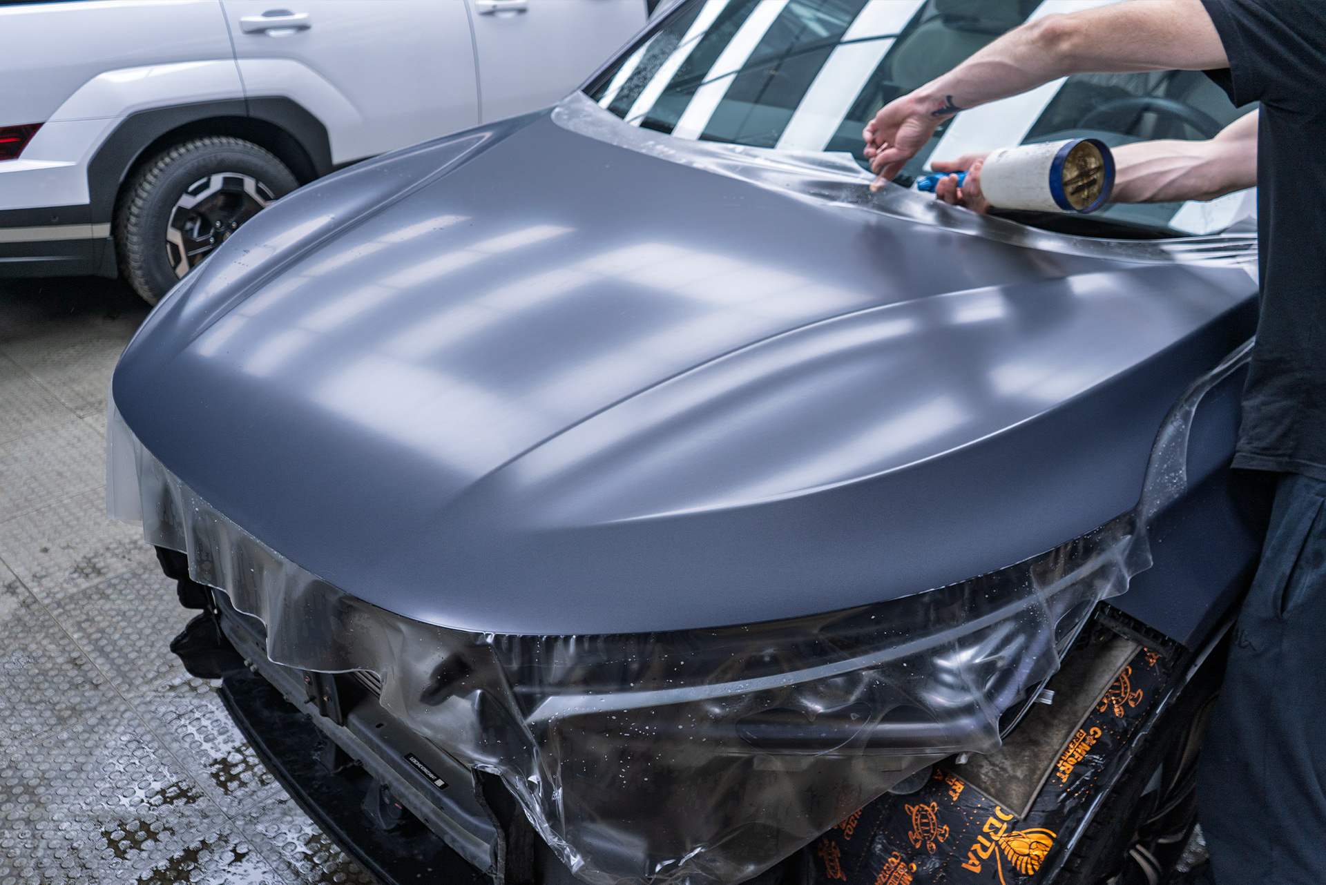 Самый трудоемкий этап — подготовка кузова. Чтобы пленка легла идеально, поверхность должна быть безупречной. Мастера Топ Тюнинг провели глубокую восстановительную полировку всего кузова, устраняя сетку царапин, помутнения лака и следы от насекомых.