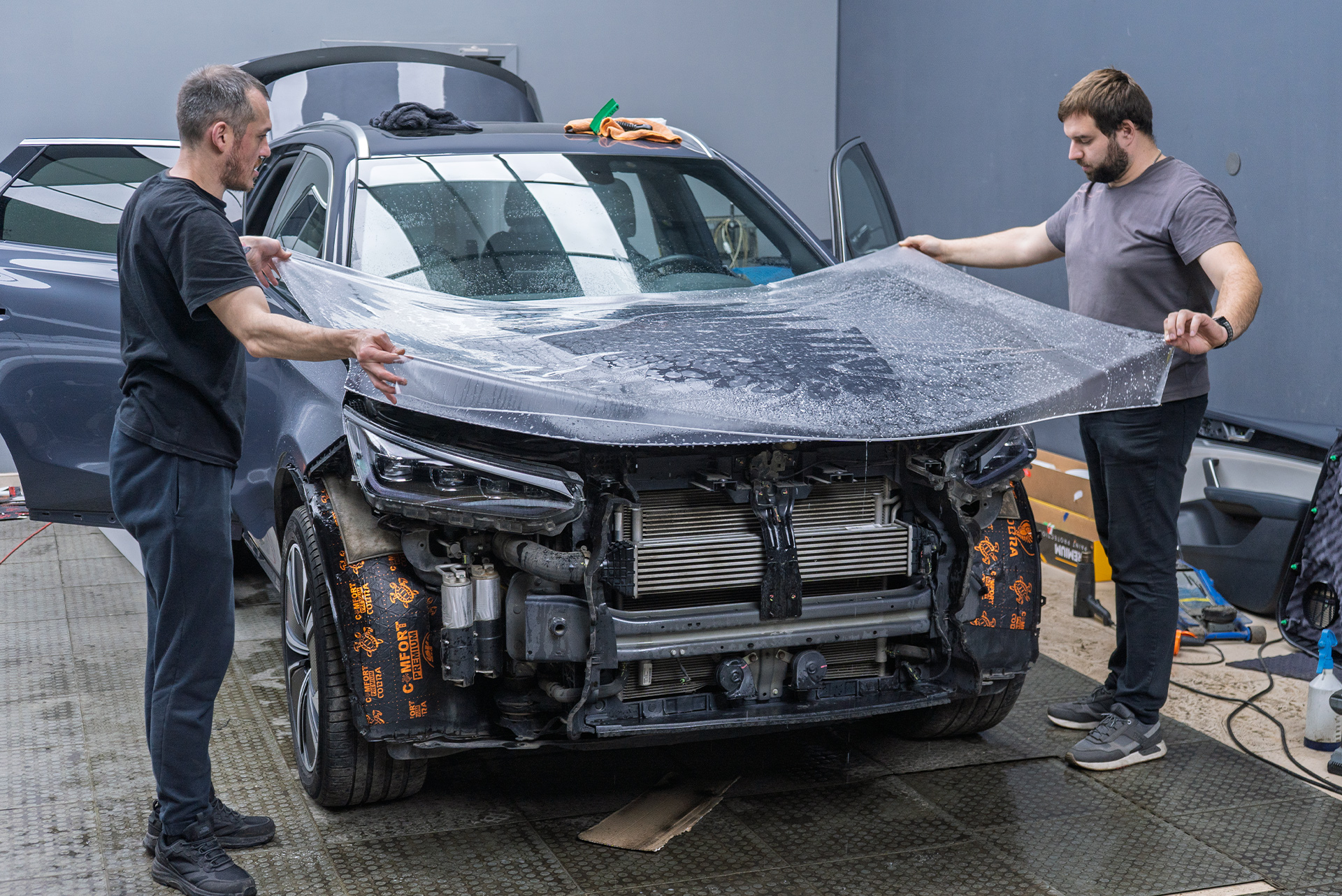 Нынешний владелец, перфекционист по натуре, был не готов мириться с «наследием» от предыдущего хозяина. Задача, поставленная перед командой Топ Тюнинг Москва, была амбициозной: не просто вернуть автомобилю заводской лоск, а превзойти его, добавив комфорта, индивидуальности и надежной защиты на годы вперед. Мастера специализированного центра приняли вызов и приступили к масштабному проекту восстановления и модернизации.