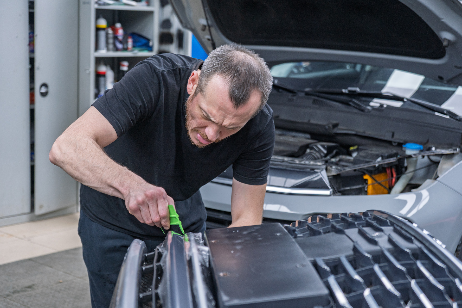 Демонтаж шильдиков и вторичный окрас капота для BYD Tang