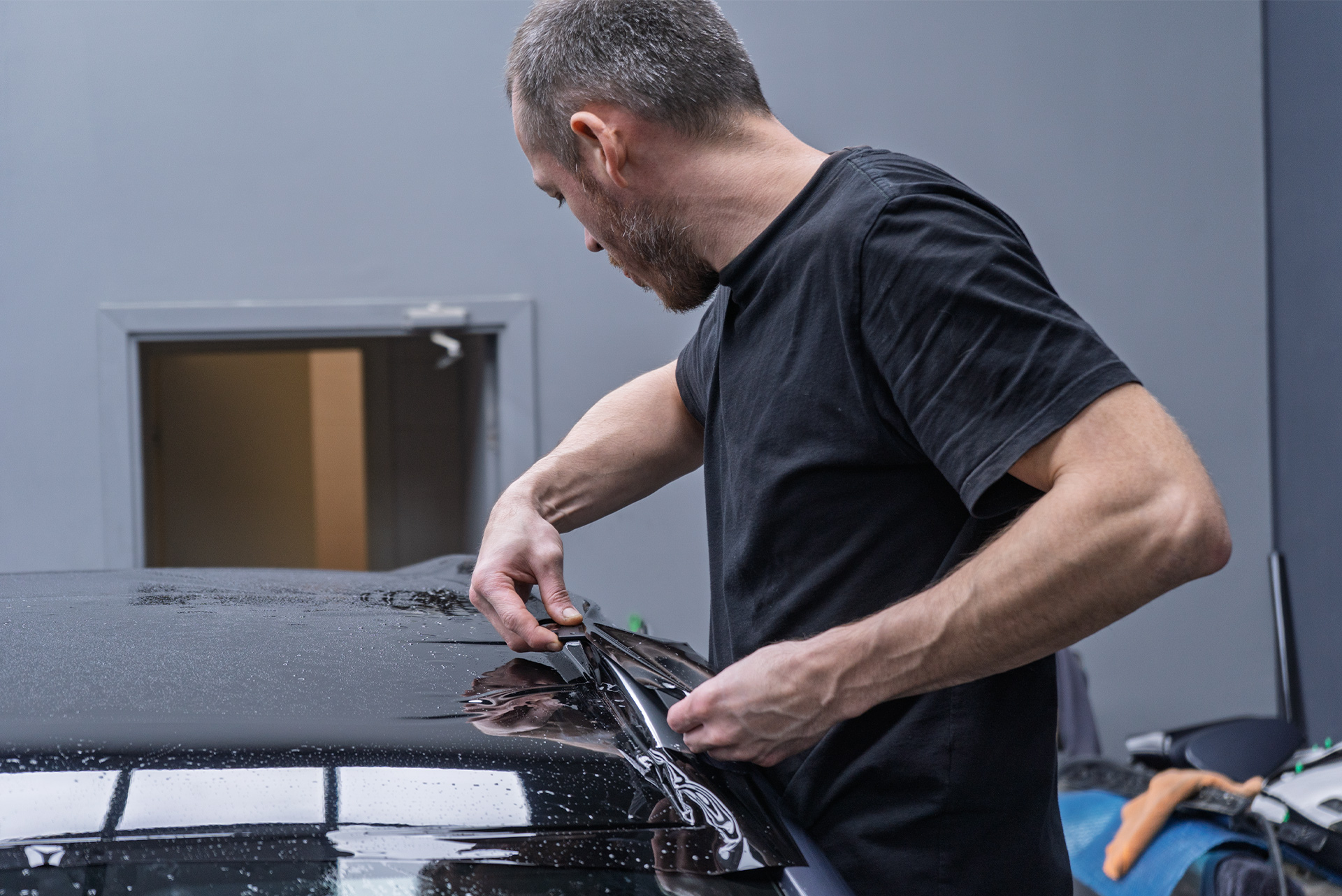 Команда Топ Тюнинг приняла единственно верное решение: полный перекрас крышки багажника с соблюдением всех заводских стандартов. С учетом сложных погодных условий пришлось выжидать почти полтора месяца, пока растворители полностью покинут свежий лак и только после этого элемент был допущен к оклейке. Качество не терпит спешки.