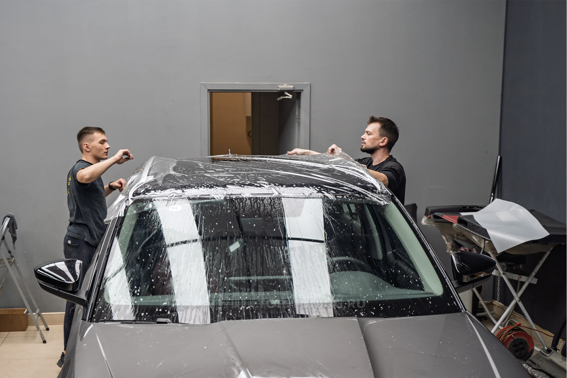 Вторым этапом стала оклейка лобового стекла Шкода Кодиак 1 поколения трёхслойной защитной пленкой. Именно лобовое стекло чаще всего страдает от камней и мелких предметов на дороге. Использованное решение сочетает эстетику и функциональность: