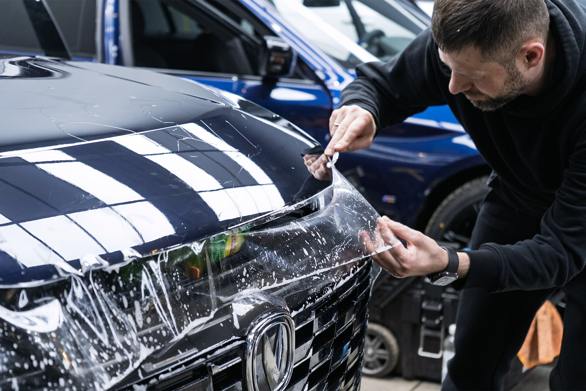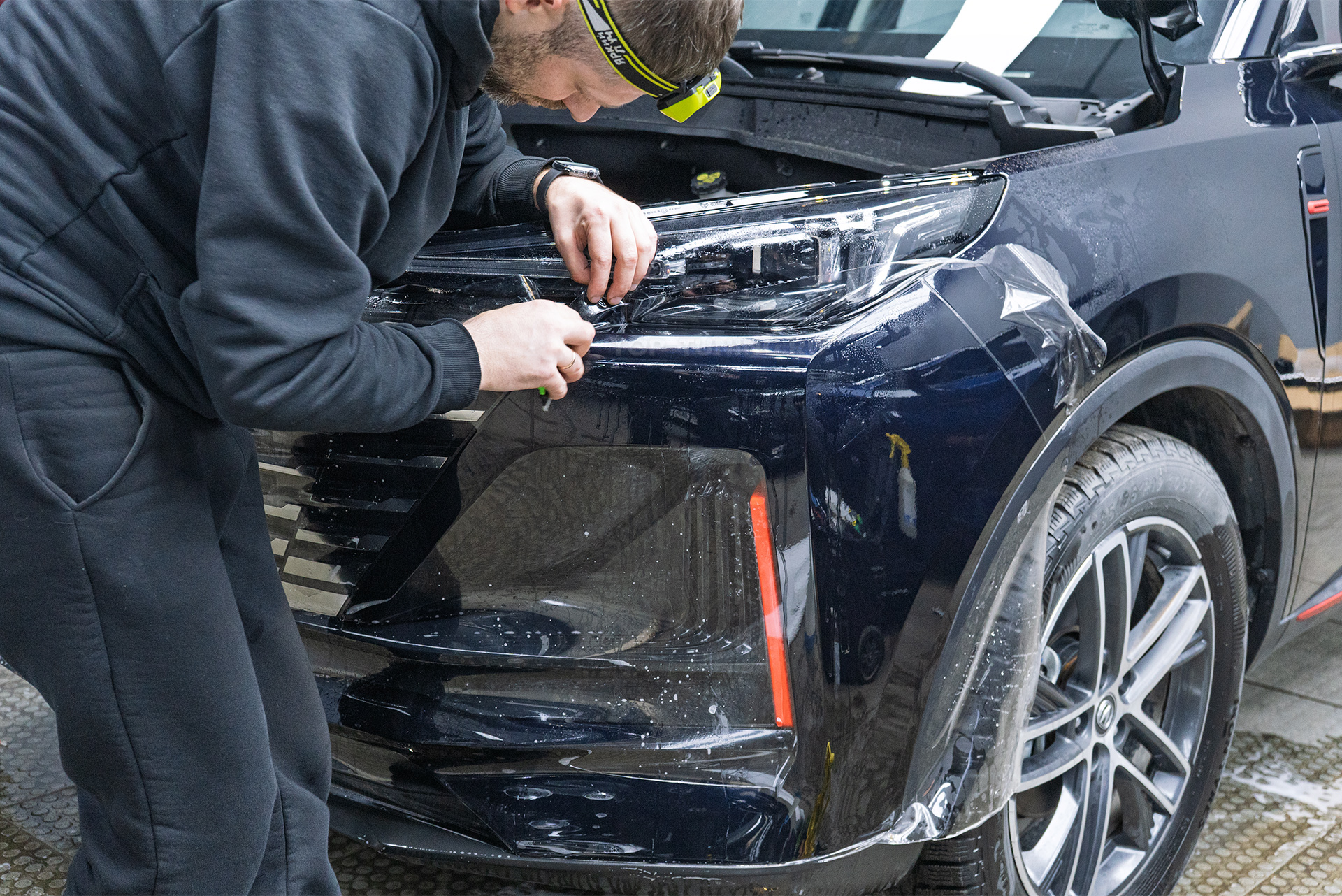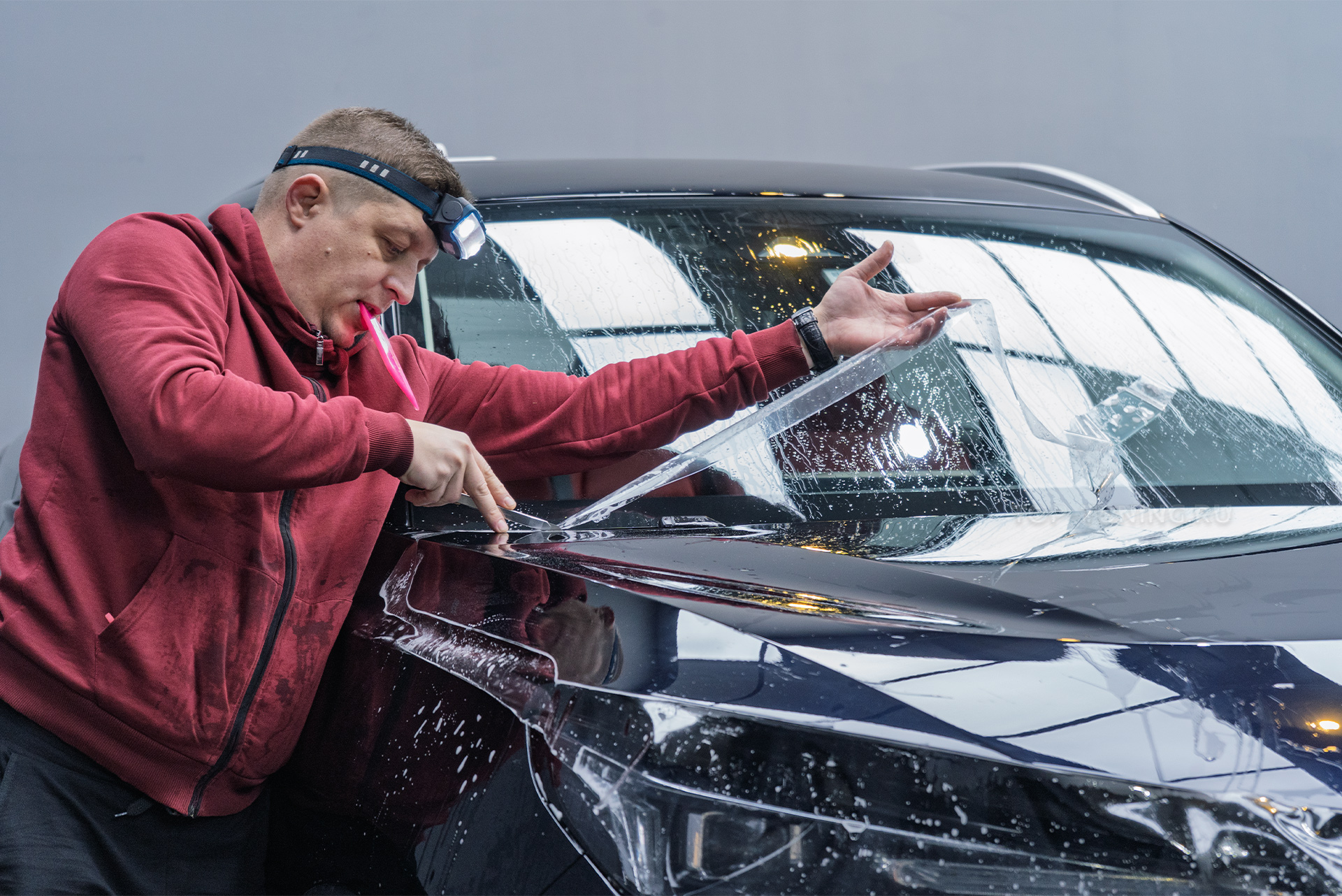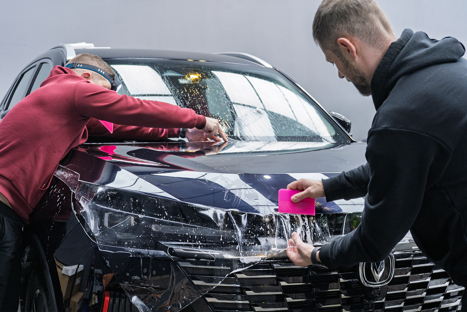 Под защиту попал широкий набор элементов, который первым принимает на себя удары камней, пескоструя и других неприятностей: капот, передние крылья и расширители арок, передний бампер, оптика, крышки зеркал, передние стойки, ударная зона крыши — и даже сложная сегментная решётка радиатора.