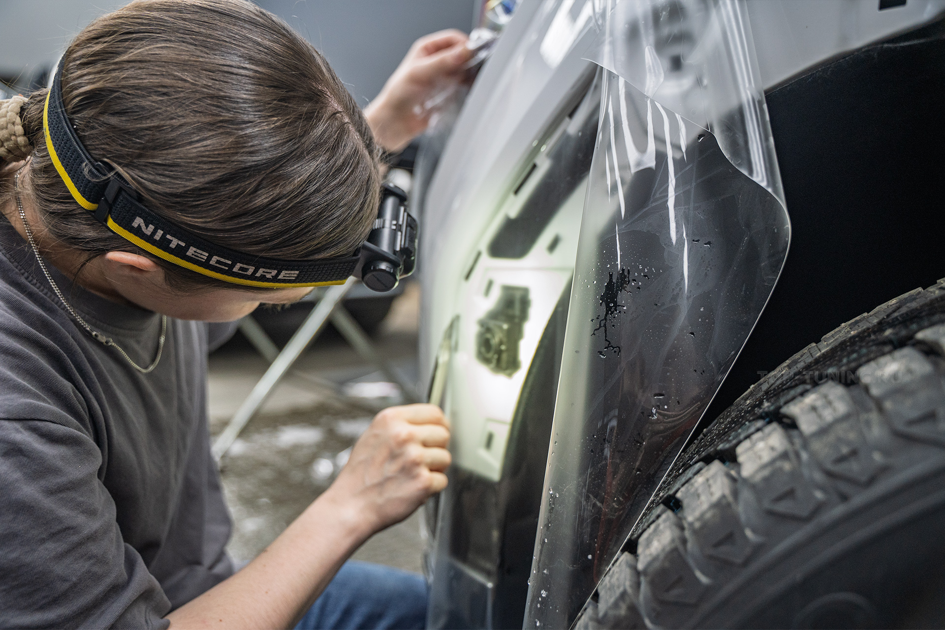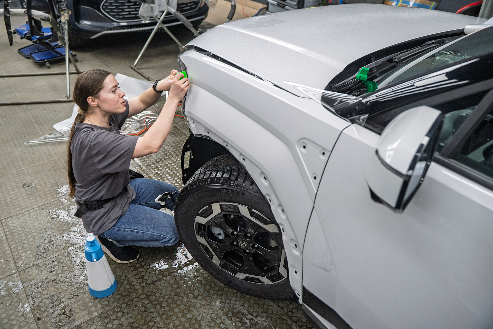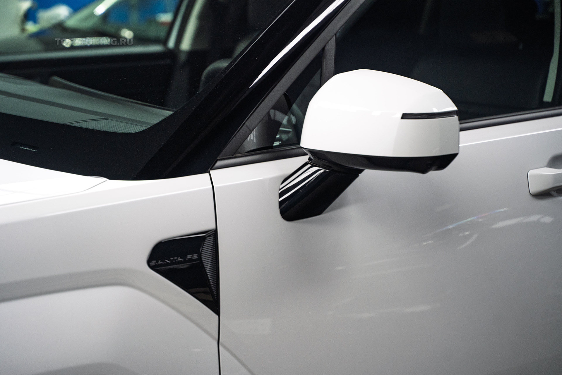 В ходе проекта специалисты Том Тюнинг Москва закрыли плёнкой с заворотом внутрь те поверхности, которые первыми принимают удары абразива и камней – это капот, вытянутый дневной ходовой огонь с фарами, крышки боковых зеркал, передний бампер и передние крылья, лунки под дверными ручками, передние стойки лояльного лака Хендай Санта Фе МХ5.