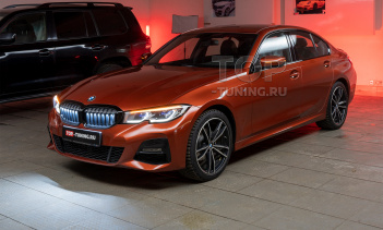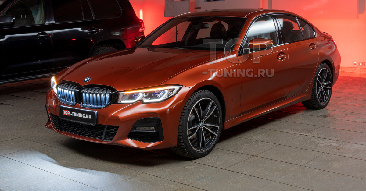 Однако на данный момент, уникальная опция выгодно отличающаяся нестандартным внешним видом от остальных БМВ очевидно притягивает внимание и владельцы G20 проявляют повышенный интерес к комплекту Iconic Glow. Так и произошло с владельцем этой БМВ третьей серии в ярко-оранжевом кузове в комплектации M-Sport и пакете Shadow Line. Машина оснащенная с завода базовой решеткой радиатора с хромированной отделкой порядком надоела хозяину и задача выполнить установку части оригинальных компонентов Iconic Glow из каталога дополнительного оснащения M-Performance стала идеальным решением.