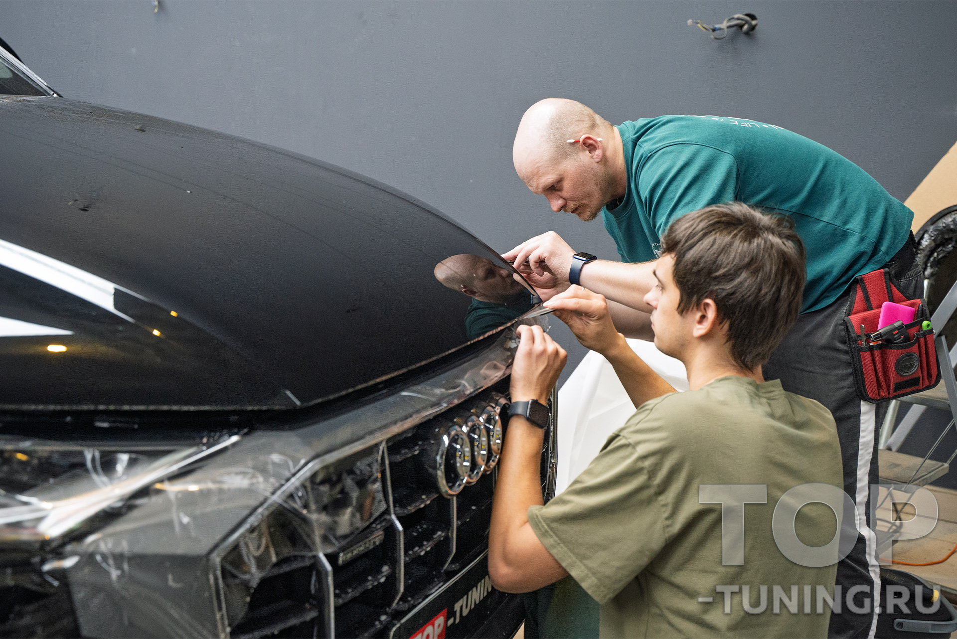 Следующим этапом работы стало бронирование всего кузова авто премиальной полиуретановой пленкой толщиной в несколько сотен микрон – прозрачный материал не желтеет на солнце и практически не заметен на поверхности кузова Audi Q8.