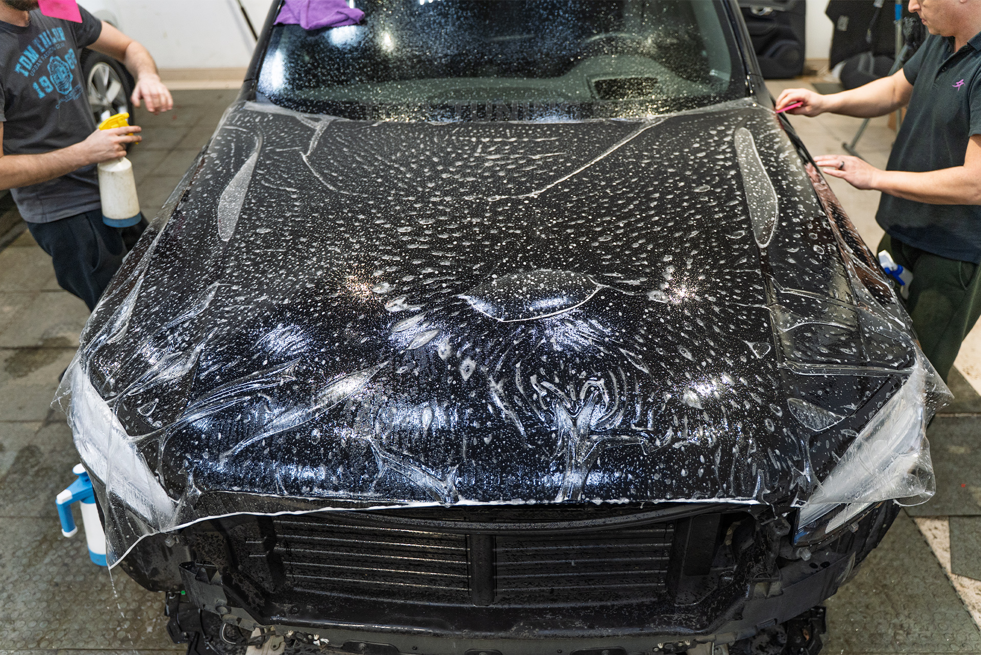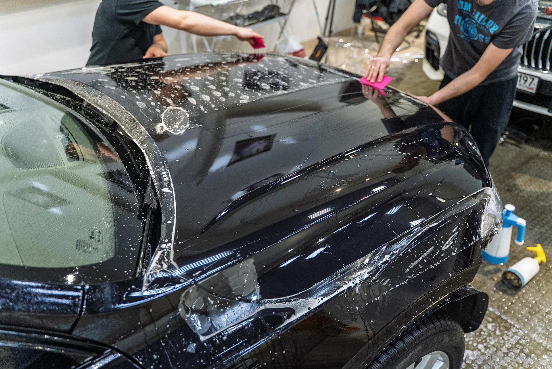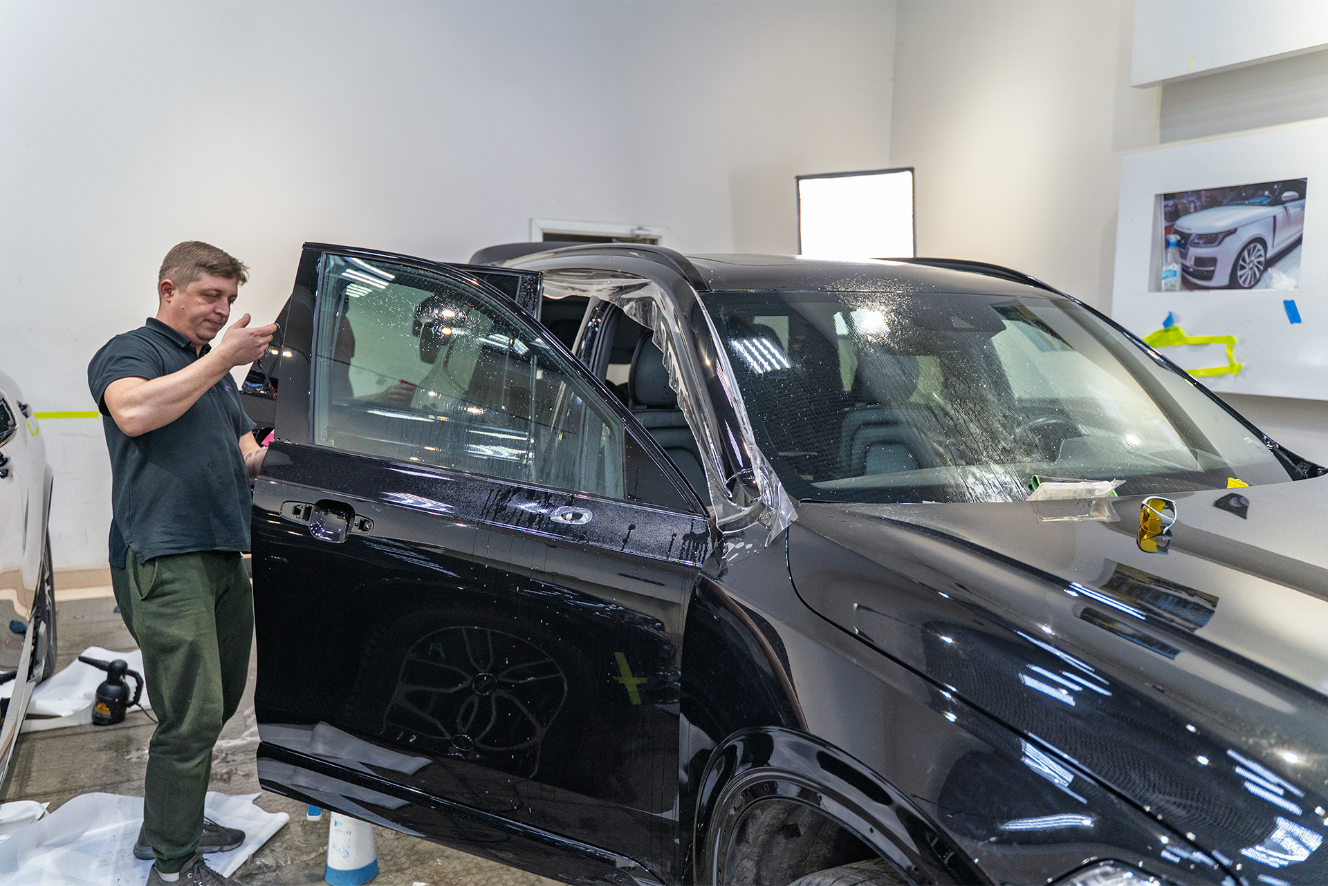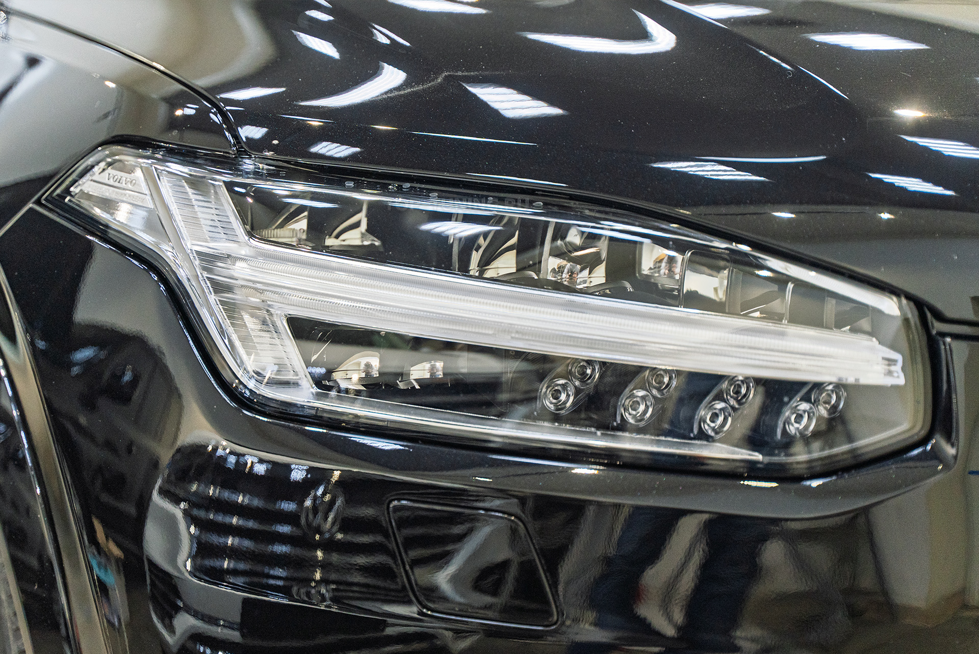 Следом за покраской последовала глубокая восстановительная полировка кузова флагмана Вольво. Критически важный этап перед оклейкой позволил устранить микроцарапины и «паутинку» на лаке, а также восстановить глубокий зеркальный глянец ЛКП.