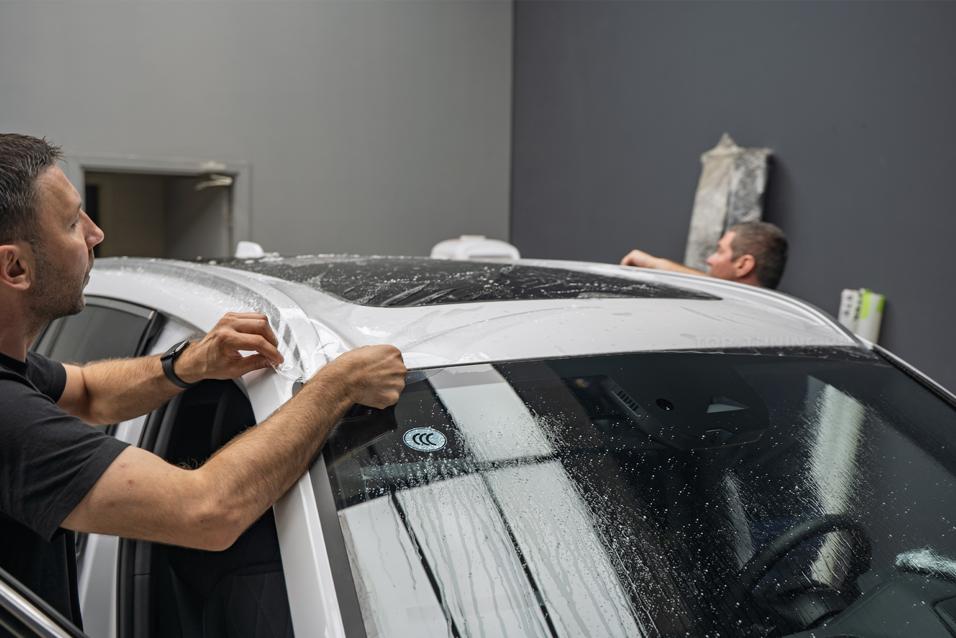 Вторым этапом стала установка трёхслойной защитной плёнки на лобовое стекло нового Джили Монжаро. Как главный элемент притяжения камней и других неприятностей на дороге, лобовое стекло должно стать одним из первых, что будет бронировать владелец. Оклейка специальной пленкой объединяет эстетику и безопасность: