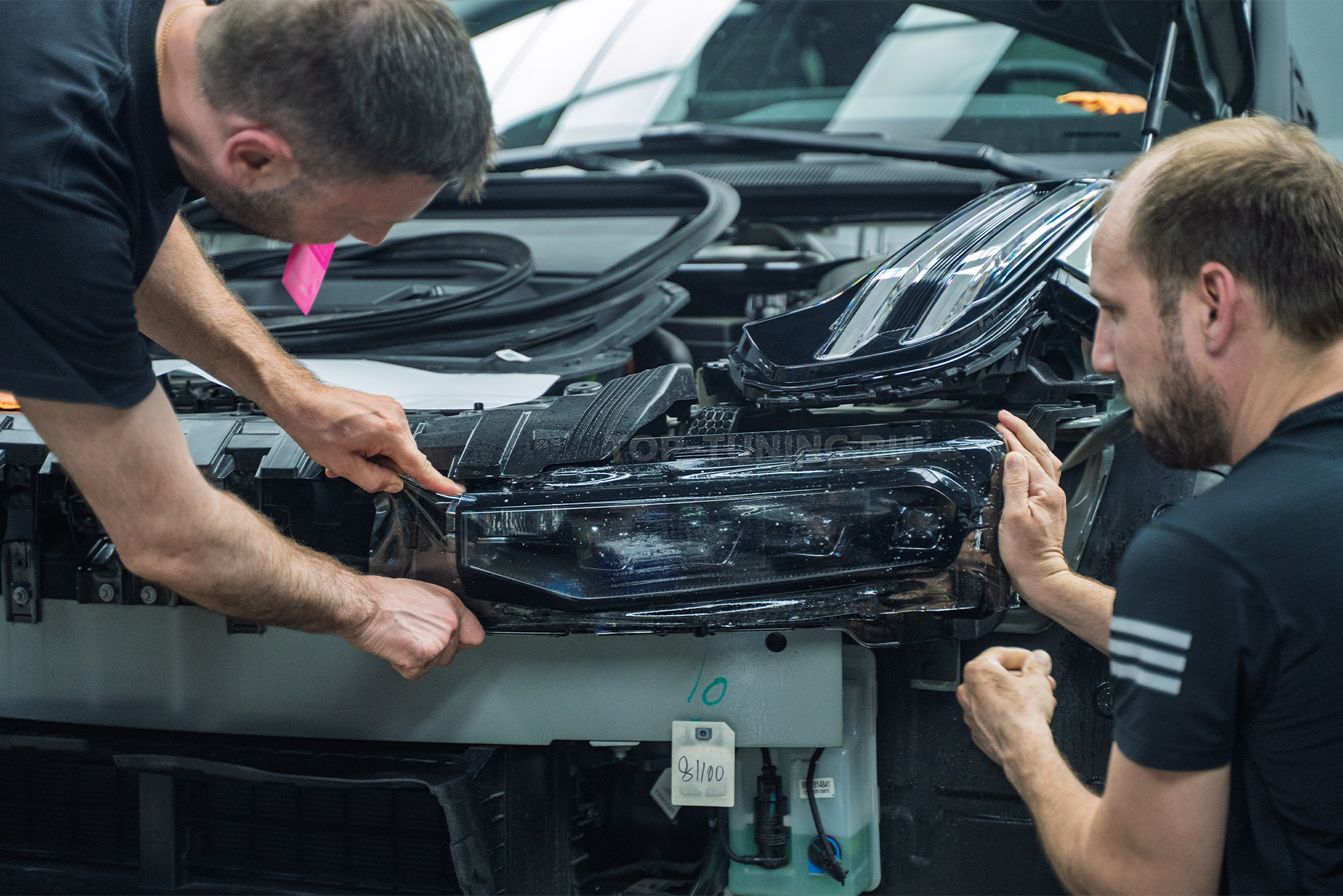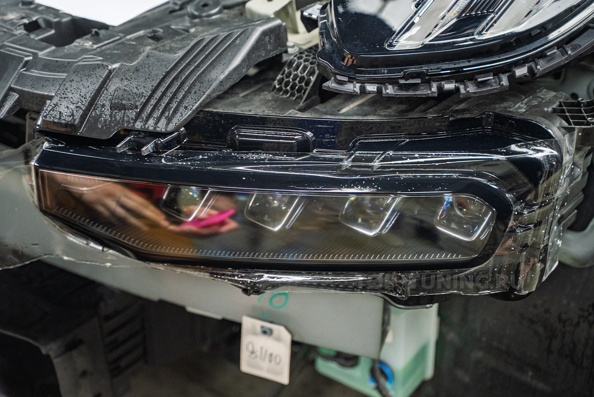 Zeekr 001 restyling изобилует черными глянцевыми элементами и сложной оптикой. Это самые уязвимые зоны: глянец мутнеет и царапается буквально от воздуха, а фары страдают от пескоструя. Мастера защитили не только окрашенные части кузова, но и все декоративные вставки и оптику.