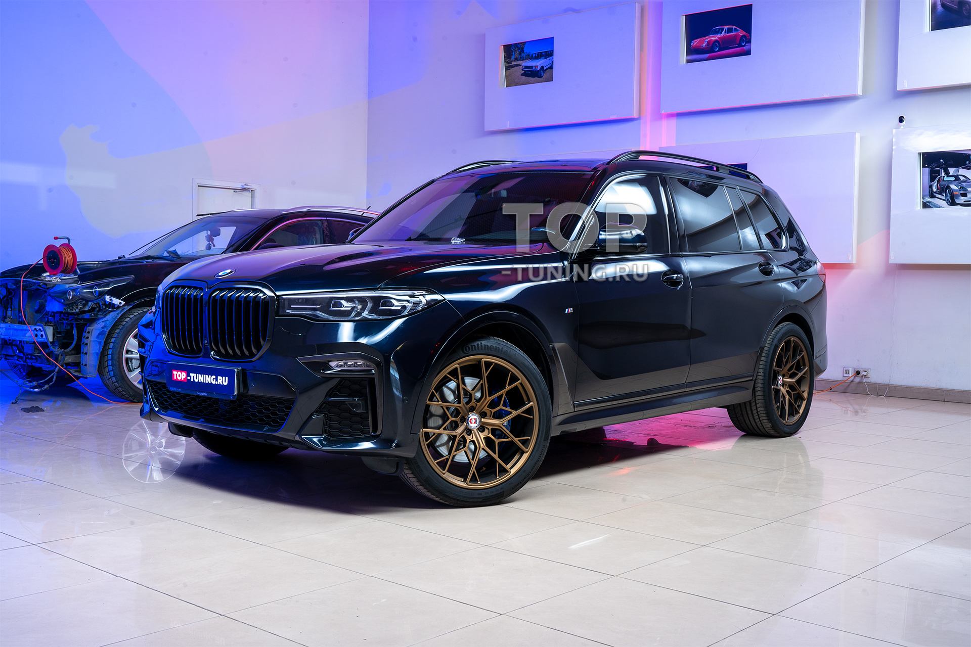 Друзья! Топ Тюнинг с удовольствием представляет вам очередной готовый проект! BMW X7 G07 в цвете Carbon Schwarz. Максимальный, "черный" пакет оснащения в сочетании с нестандартными колесными дисками HRE FF10, выполненных в необычном золотом исполнении. Разноширокие диски: R22 285 / 40 на передней и R22 325 / 25 на задней оси, в золотом цвете, выглядят крайне гармонично и вполне уместно, именно благодаря черным элементам декора.