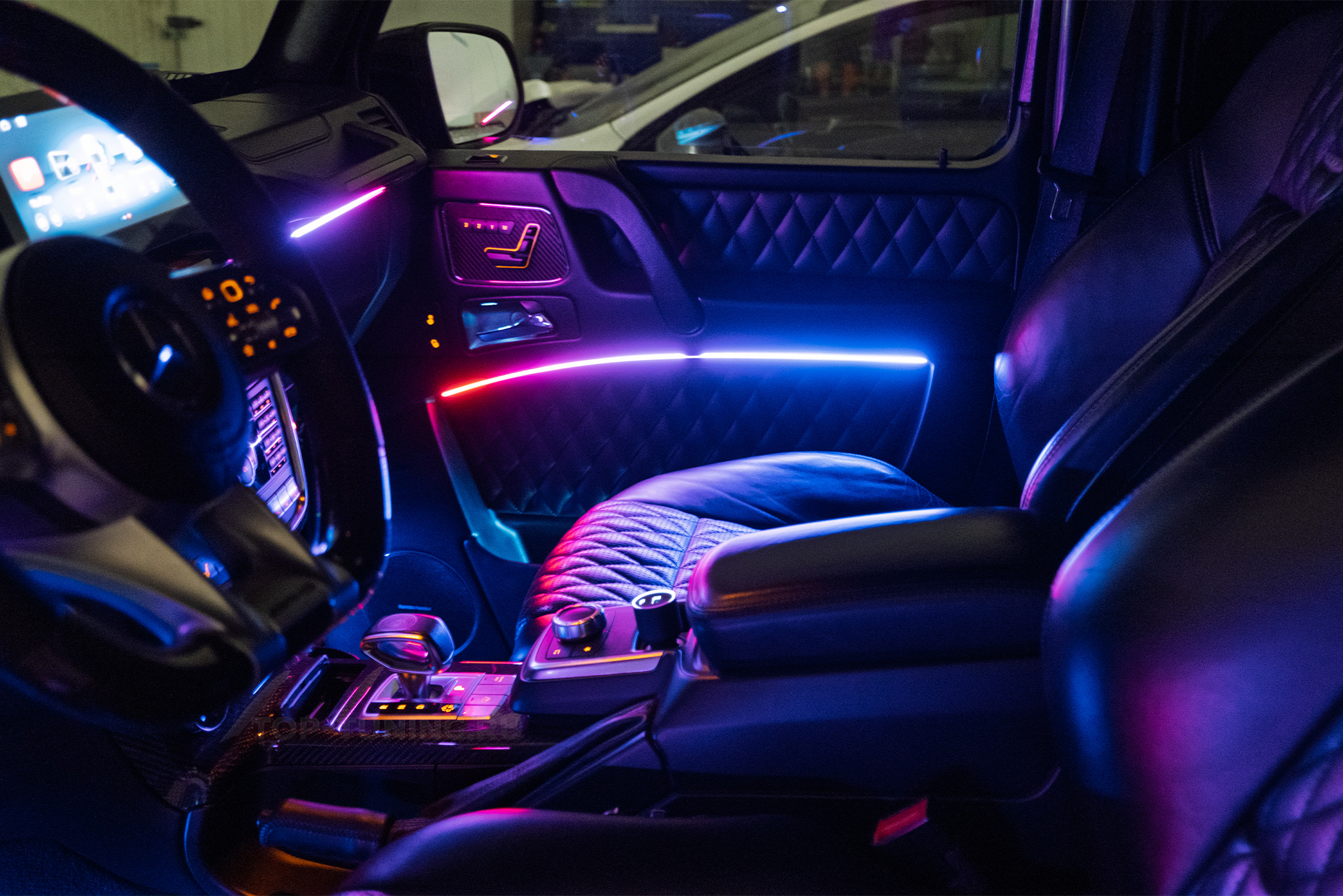 Установка подсветки стала эффективным способом вдохнуть в салон внедорожника больше жизни и добавить уюта и динамики, не разрушая ту премиальную архитектуру, за которую G-Wagen так любят.