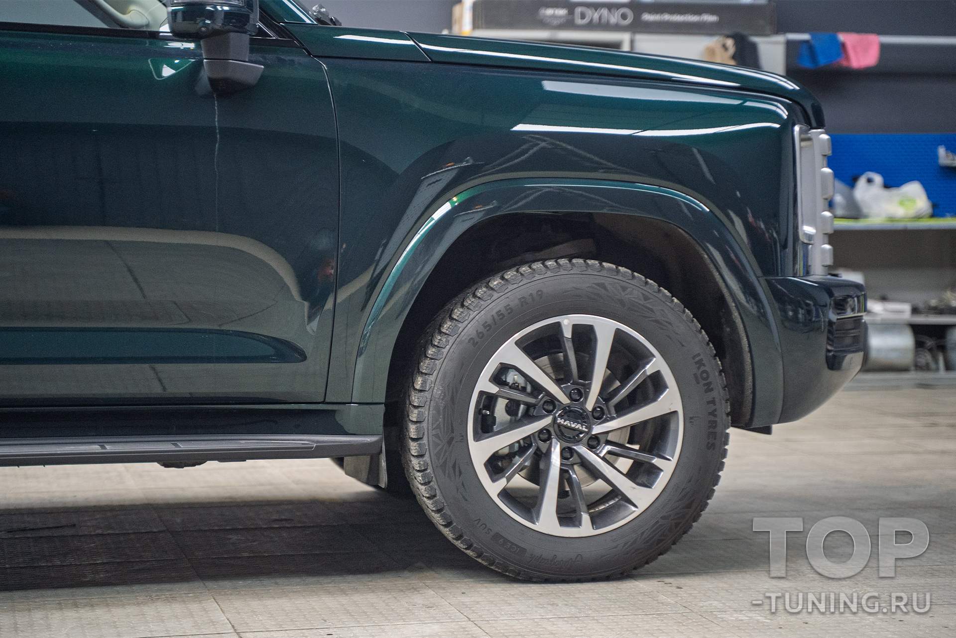 Как итог, владелец в любой момент может прямо из салона активировать омыватель, который обеспечит быструю и качественную очистку фронтальной камеры Haval H9. В ходе проекта был также установлен комплект брызговиков на передние и задние колеса.
