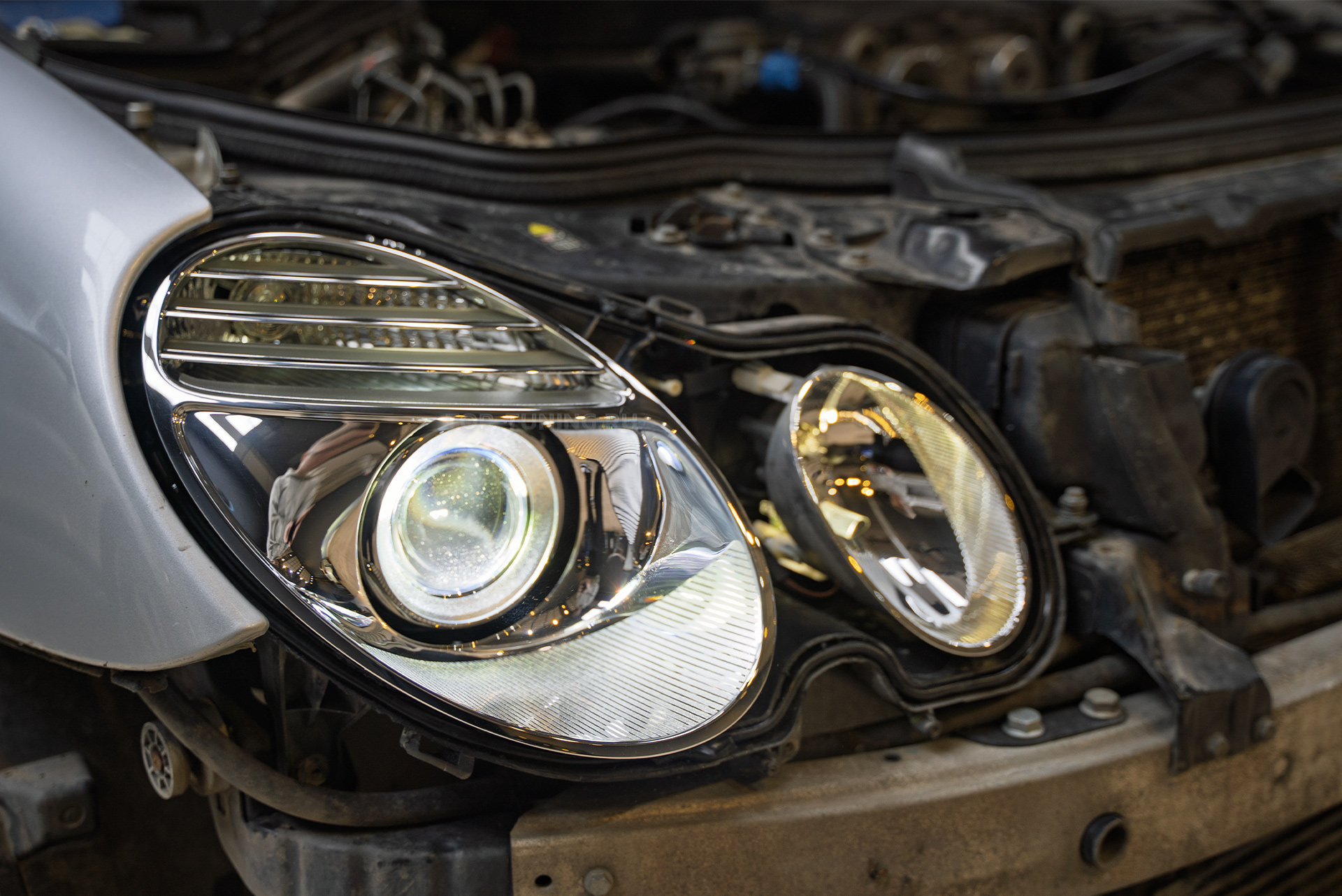 Тюнинг-модернизация передней оптики – установка LED линз вместо би-ксенона для Mercedes-Benz E-class W211 2006–2009