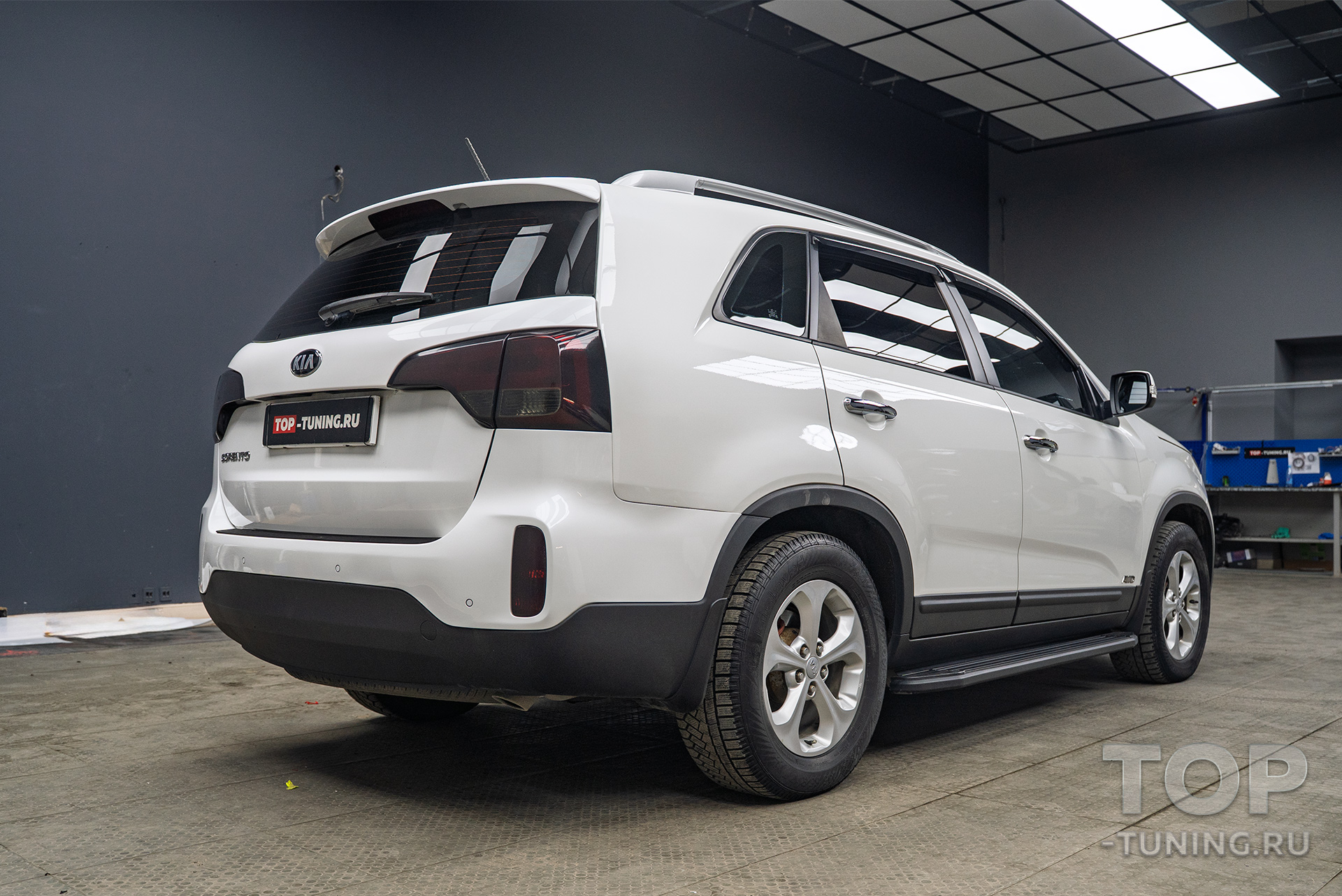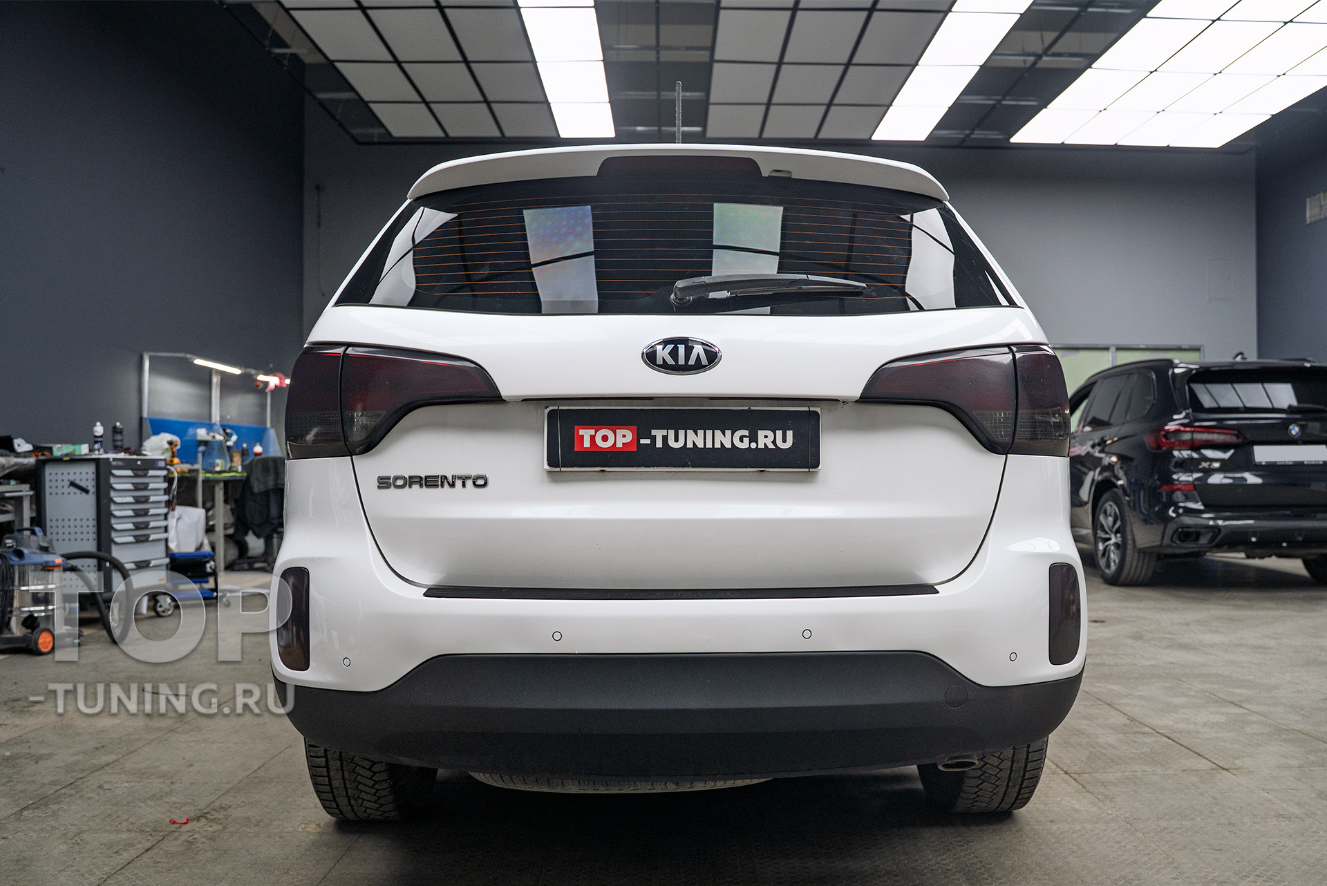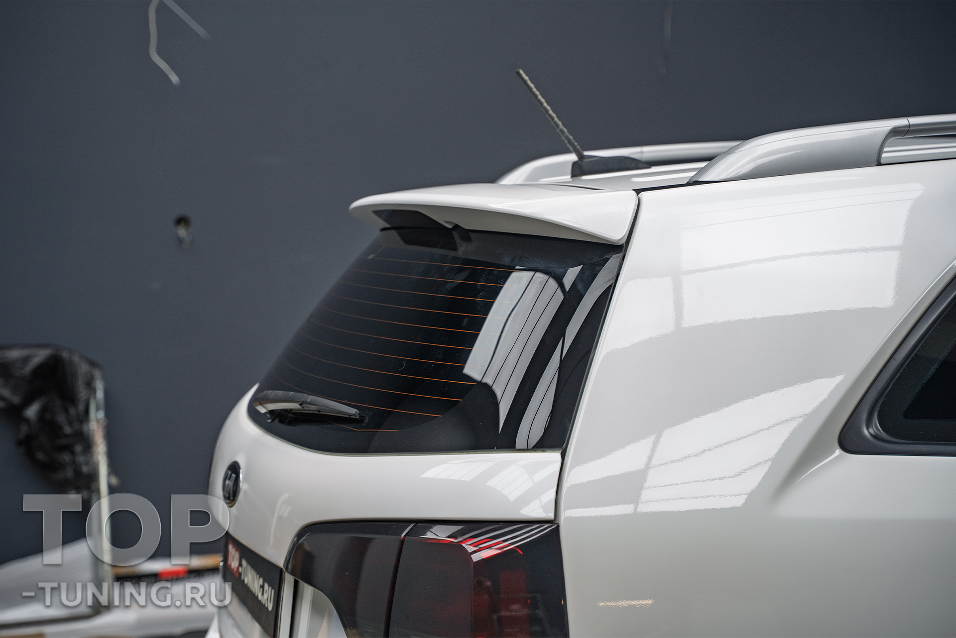 Владелец семейного внедорожника Kia Sorento заранее приобрел окрашенный в цвет кузова спойлер на крышку багажника и доверил установку элемента на любимый автомобиль опытным мастерам Топ Тюнинг Москва.