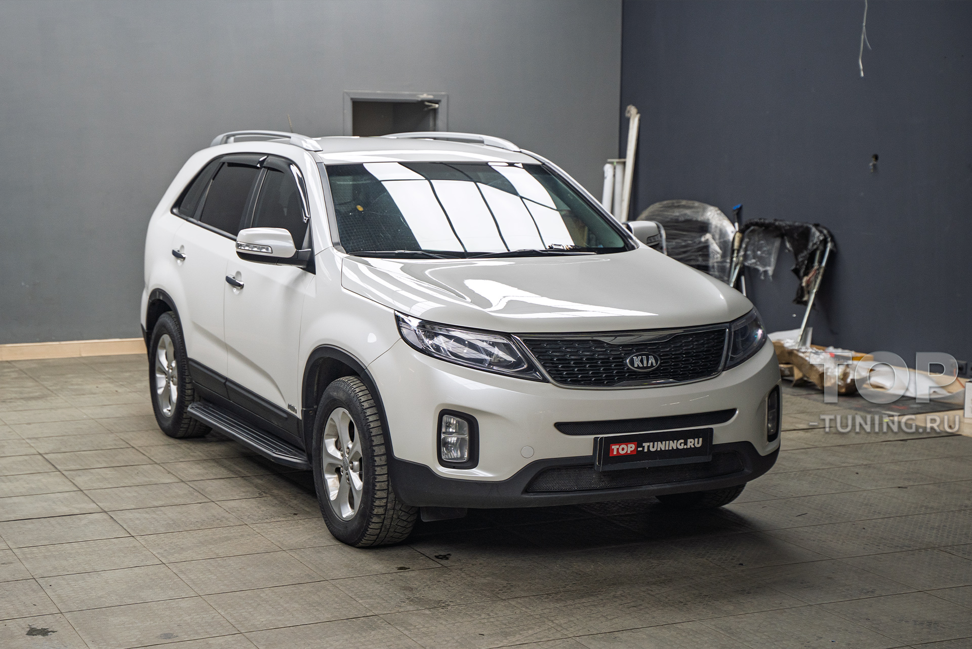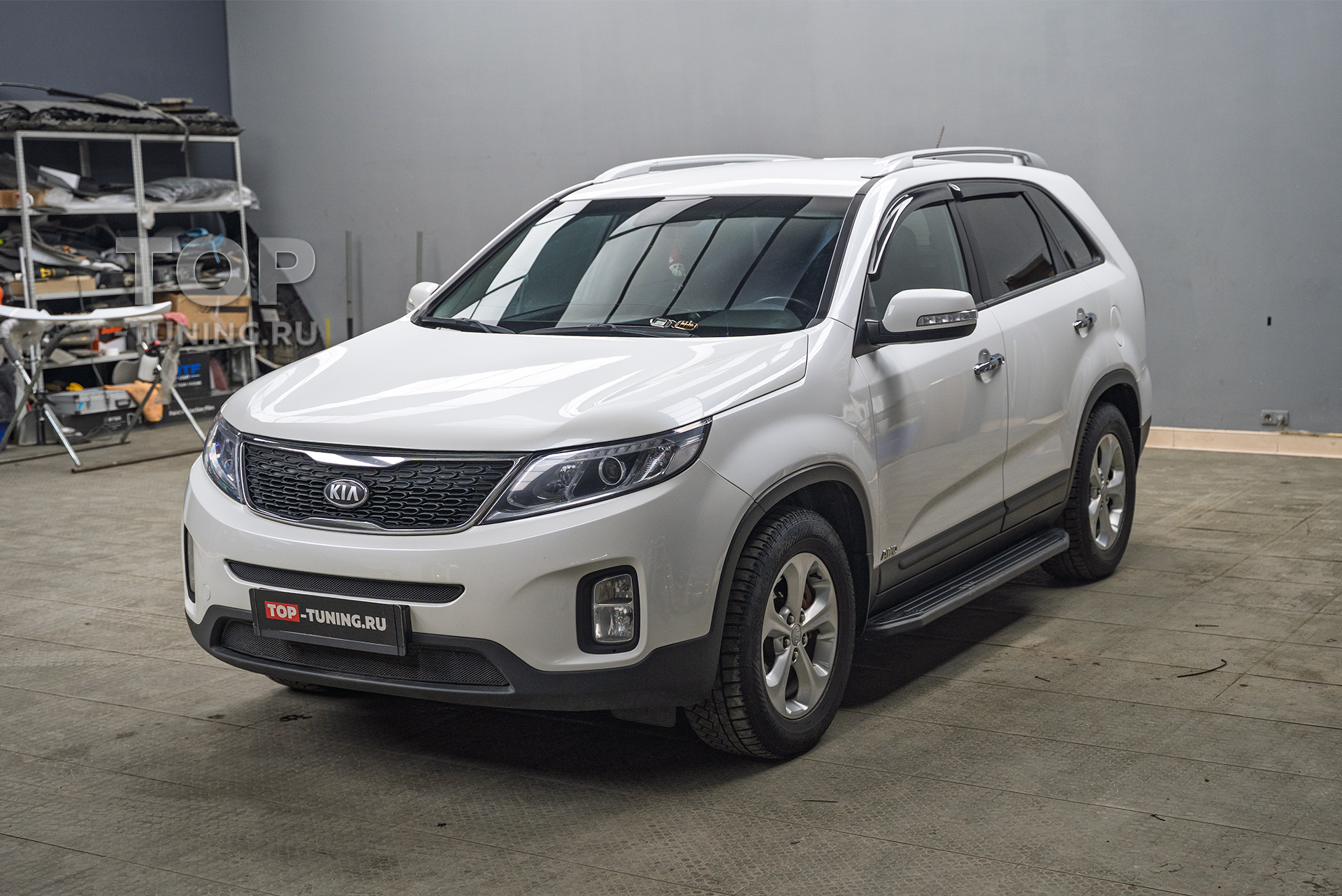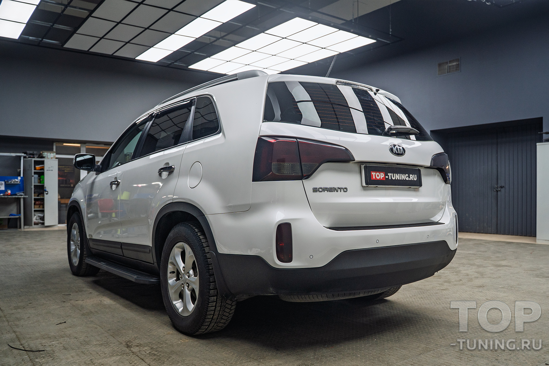 Владелец семейного внедорожника Kia Sorento заранее приобрел окрашенный в цвет кузова спойлер на крышку багажника и доверил установку элемента на любимый автомобиль опытным мастерам Топ Тюнинг Москва.