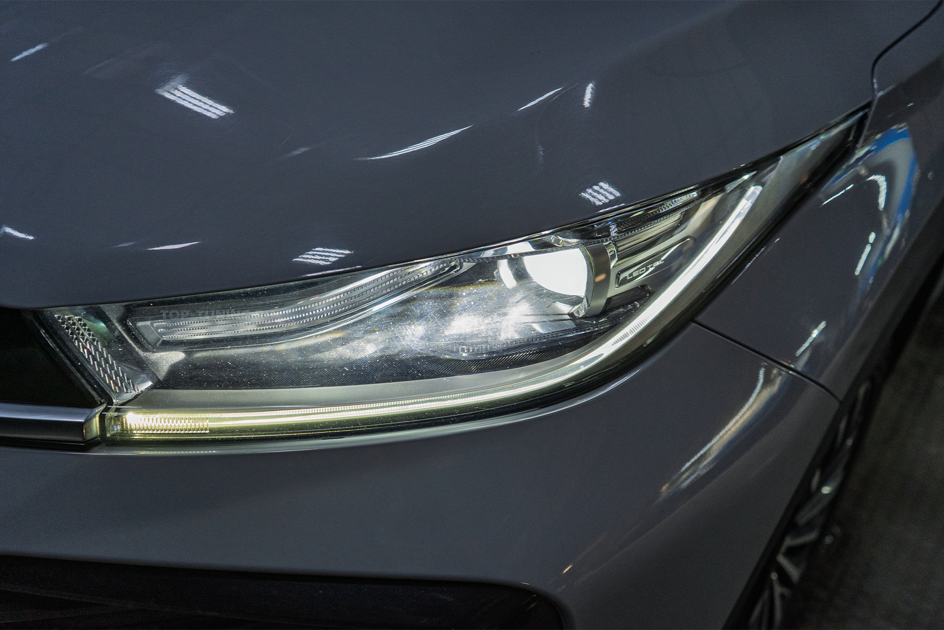 Отдельным этапом была произведена восстановительная полировка стёкол: убрана микрориска и матовость, возращена прозрачность. Чистая оптика — это не только эстетика, но и полноценная отдача новых линз, установленных в фары Exeed TXL 2021+.
