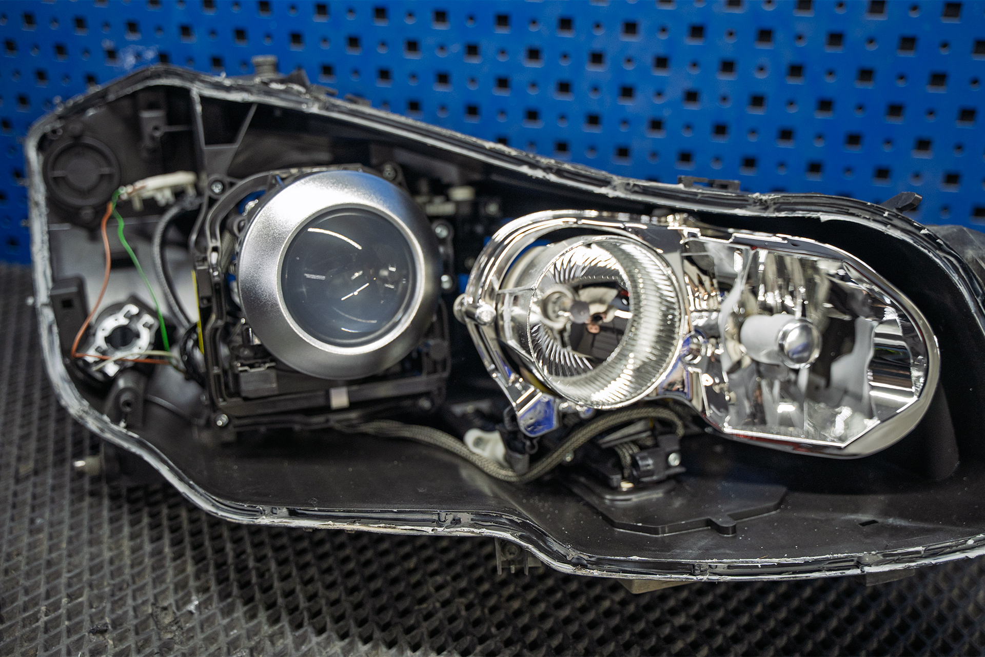 Задачей проекта фактически стала смена класса освещения авто. В ходе работы команда Топ Тюнинг Москва применила специальные переходные рамки для точной посадки и жёсткой фиксации линз MaxBeam 2.0 в корпусах фар — геометрия сохранена, как и функционал системы AFS.
