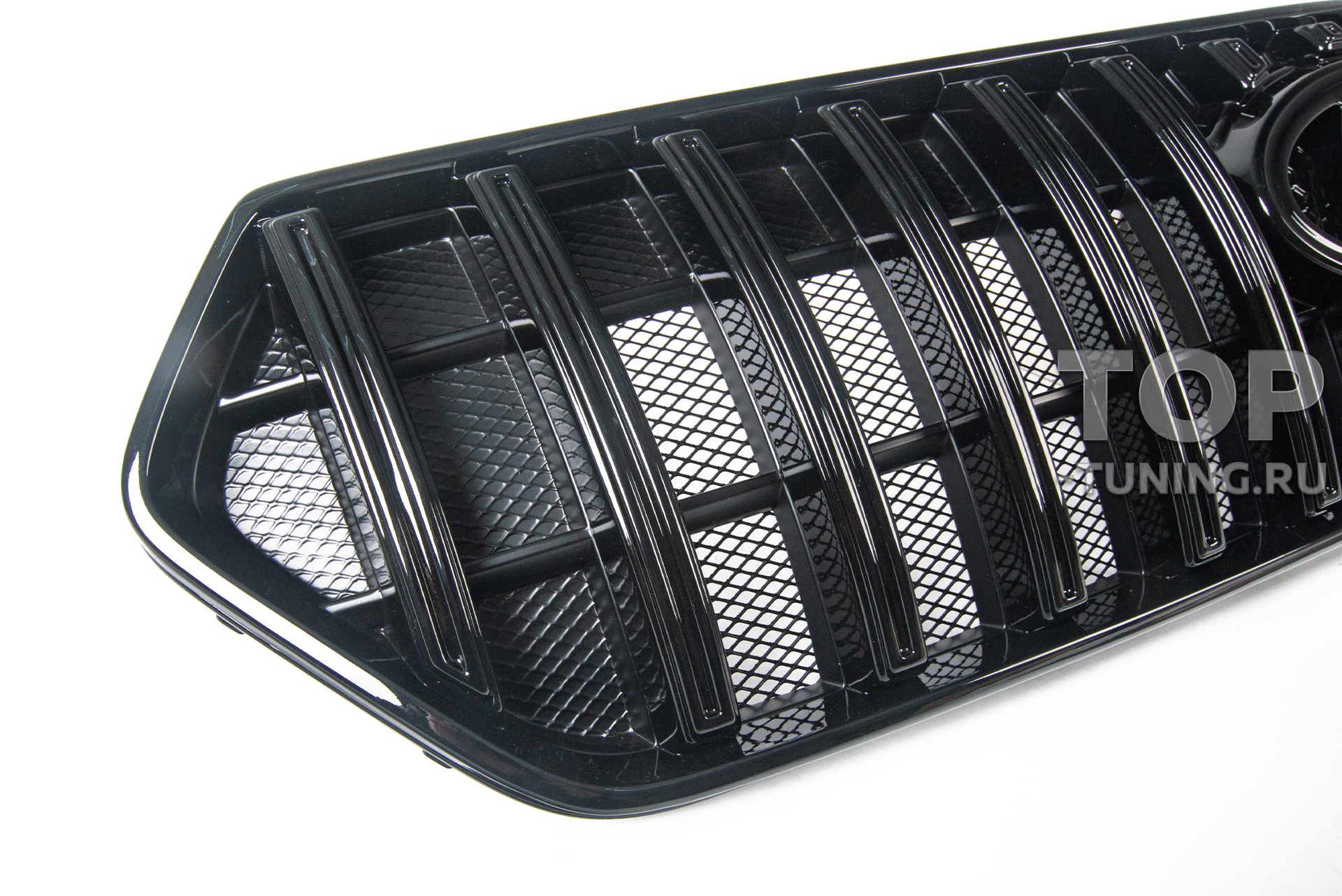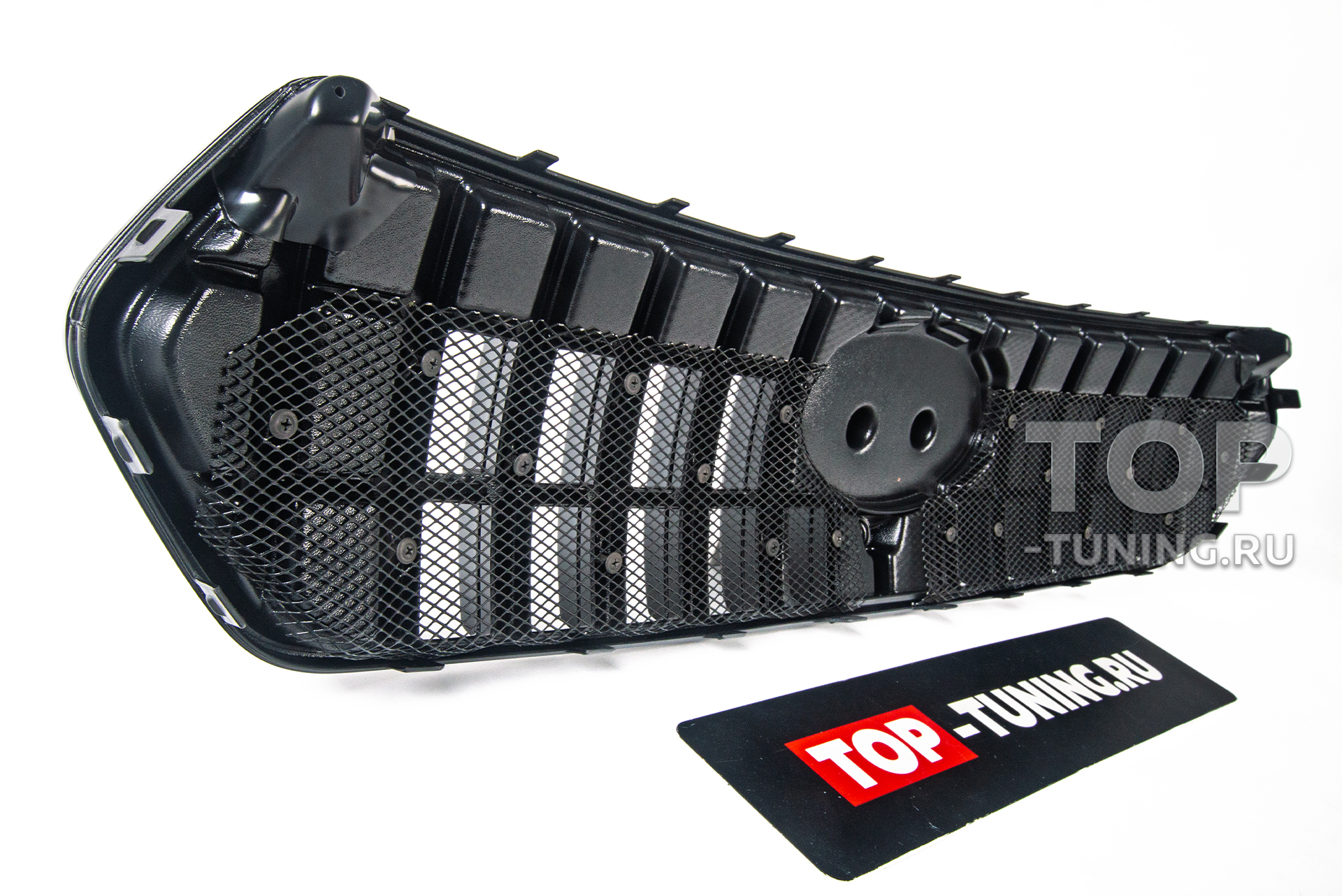 Форма вертикальных ламелей с ложбинками выполнена в стиле современных тюнинг решеток радиатора "Panamericana Style" для люкс версий автомобилей Mercedes Benz. По краям решетки установлены декоративные пластины с узором имитирующим сетку-фильтр.
