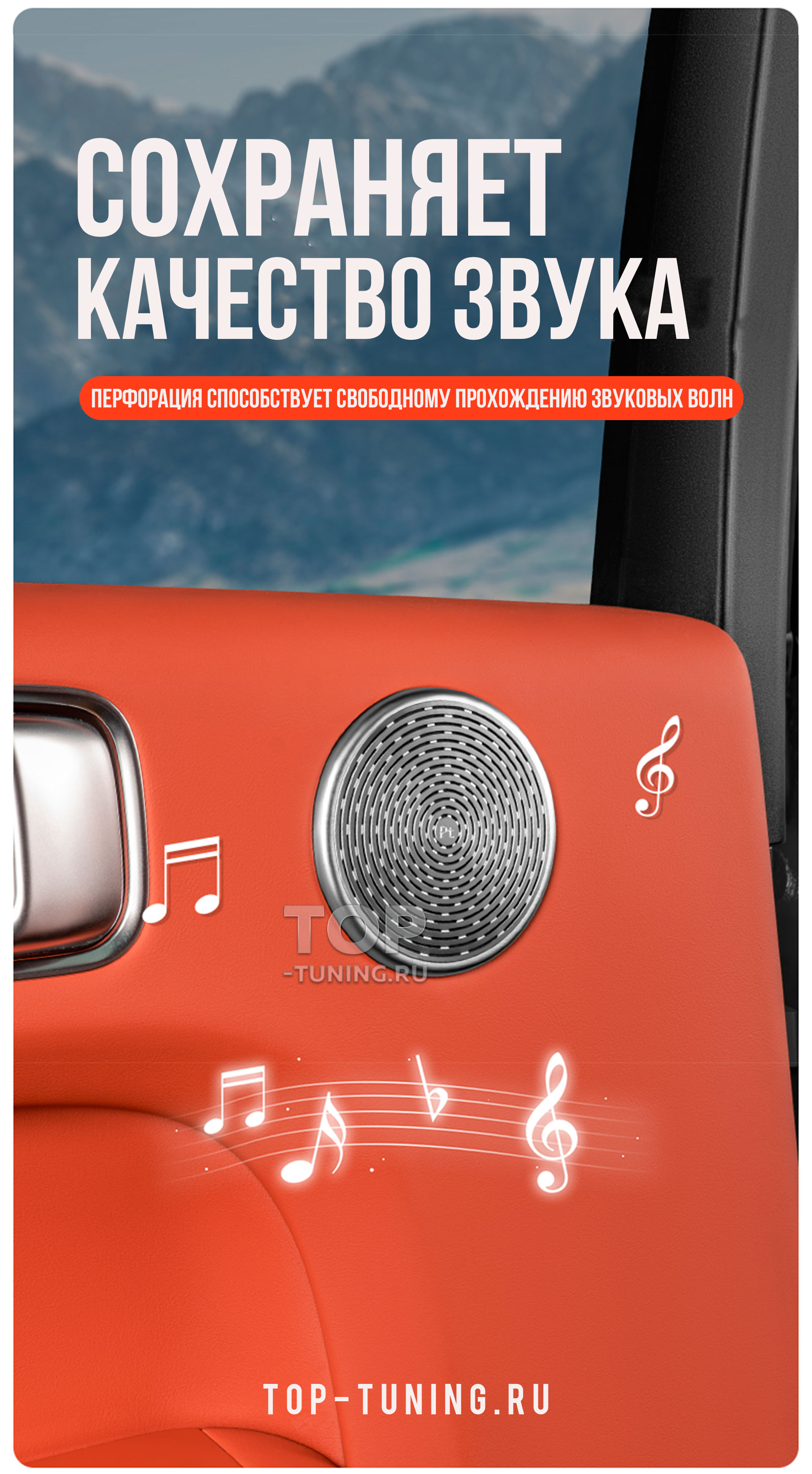 Особое внимание уделено перфорации — она выполнена с высокой точностью, что позволяет звуковым волнам свободно проходить через накладки без искажений. Благодаря этому, оригинальное качество и чистота звучания штатной аудиосистемы полностью сохраняются, обеспечивая максимальное удовольствие от прослушивания музыки.