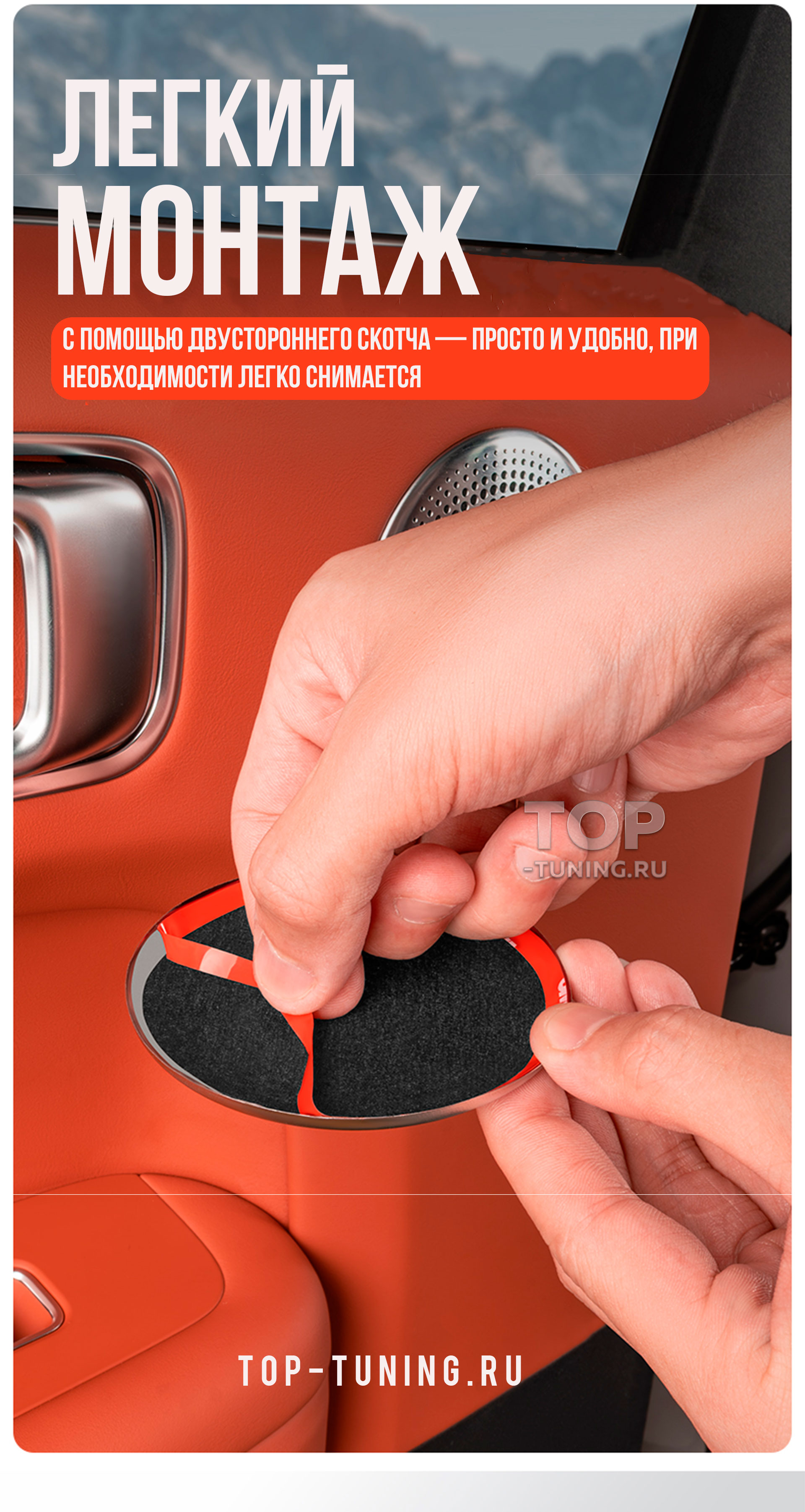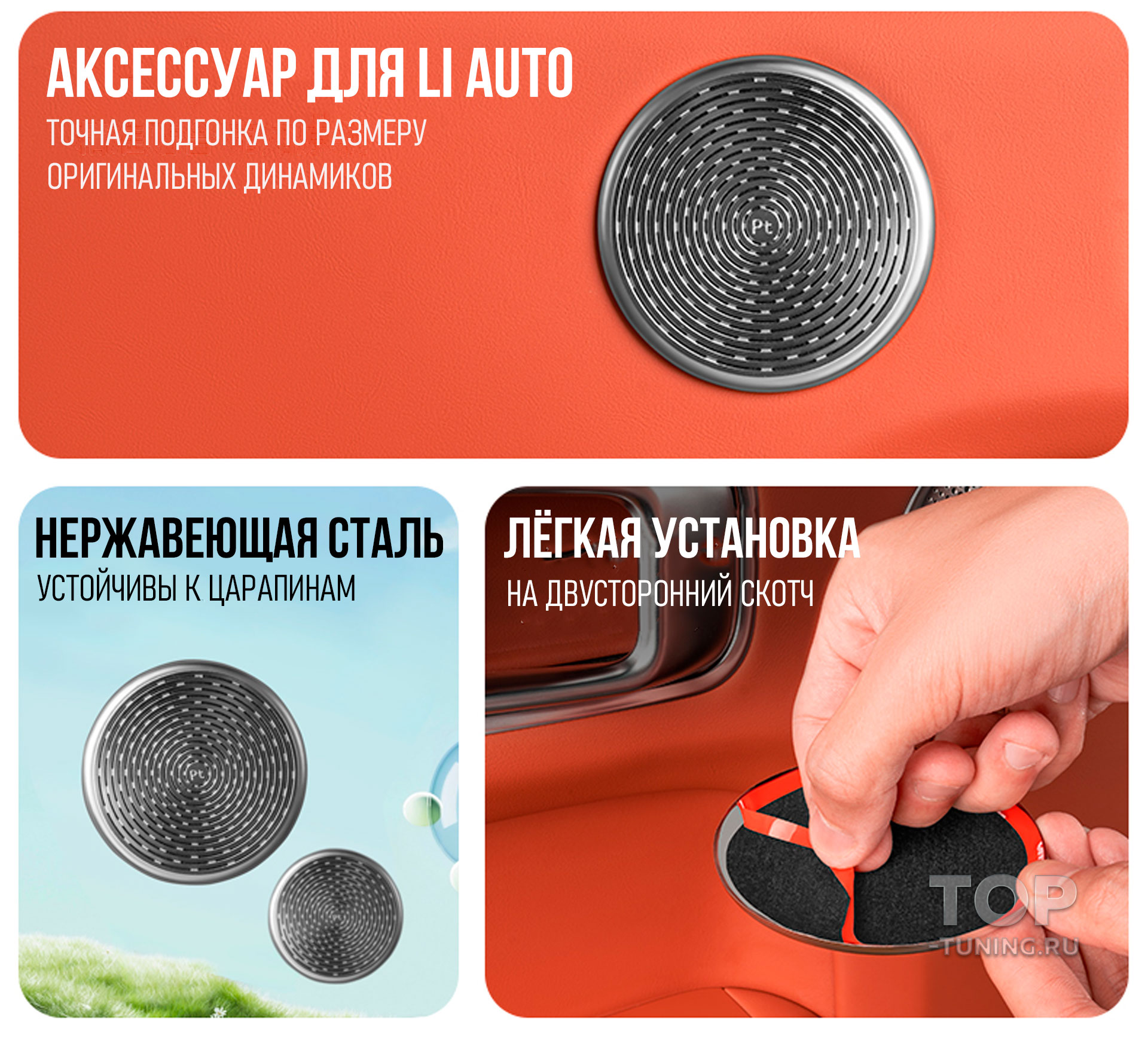 Монтаж накладок Platium производится с помощью прочного двустороннего скотча, что исключает необходимость сверления и повреждений заводской отделки. Установка занимает минимум времени и подходит для всех моделей Lixiang L6, L7, L8 и L9 с учётом их особенностей и размеров динамиков.