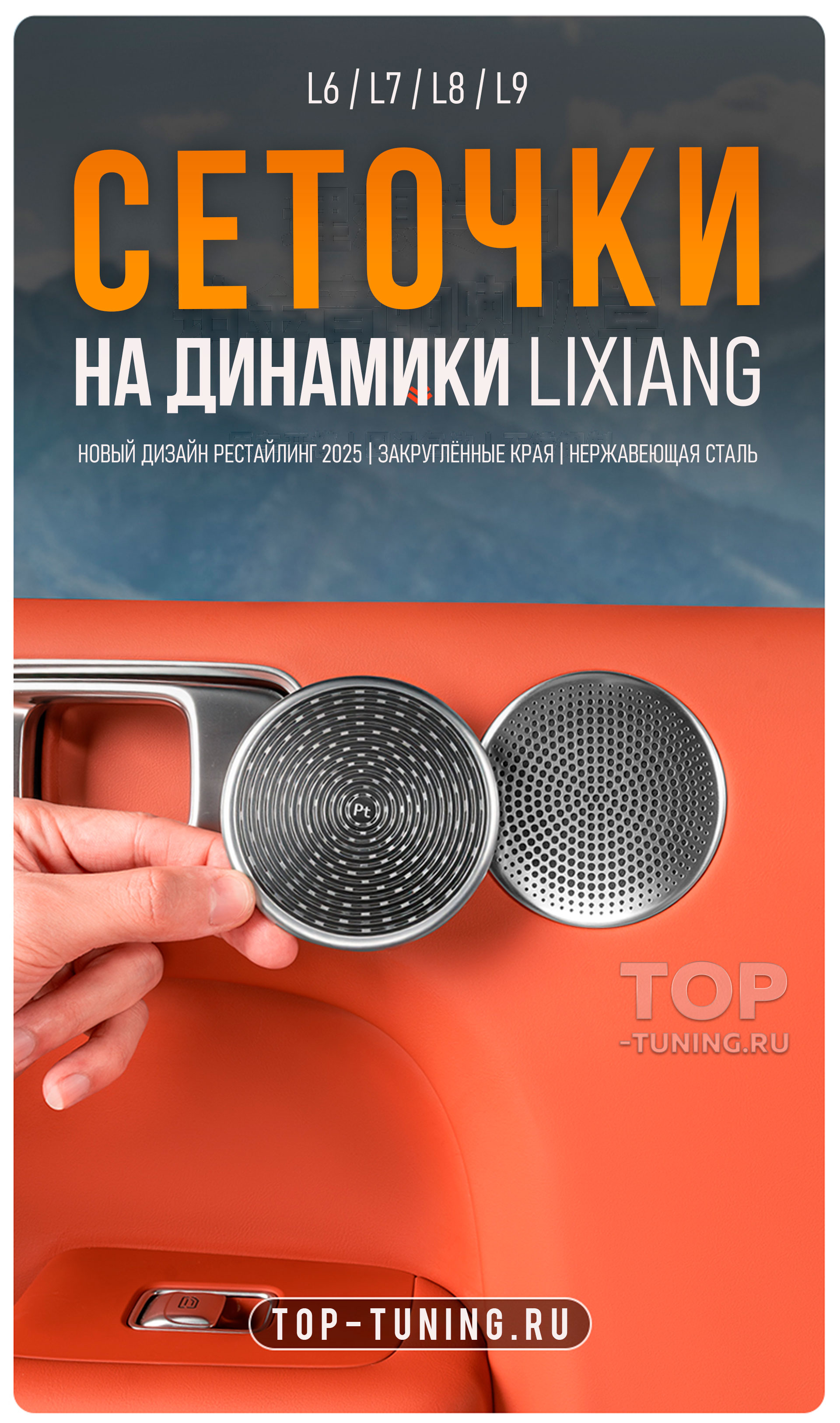 Стайлинг интерьера Lixiang L6, L7, L8 и L9 – комплектом накладок Platium на штатную акустику в дверях. Эти металлические сетки выполнены из нержавеющей стали с фирменной Pt перфорацией, отражающей знаковое обновление популярного кроссовера, представленного в середине 2025 года.