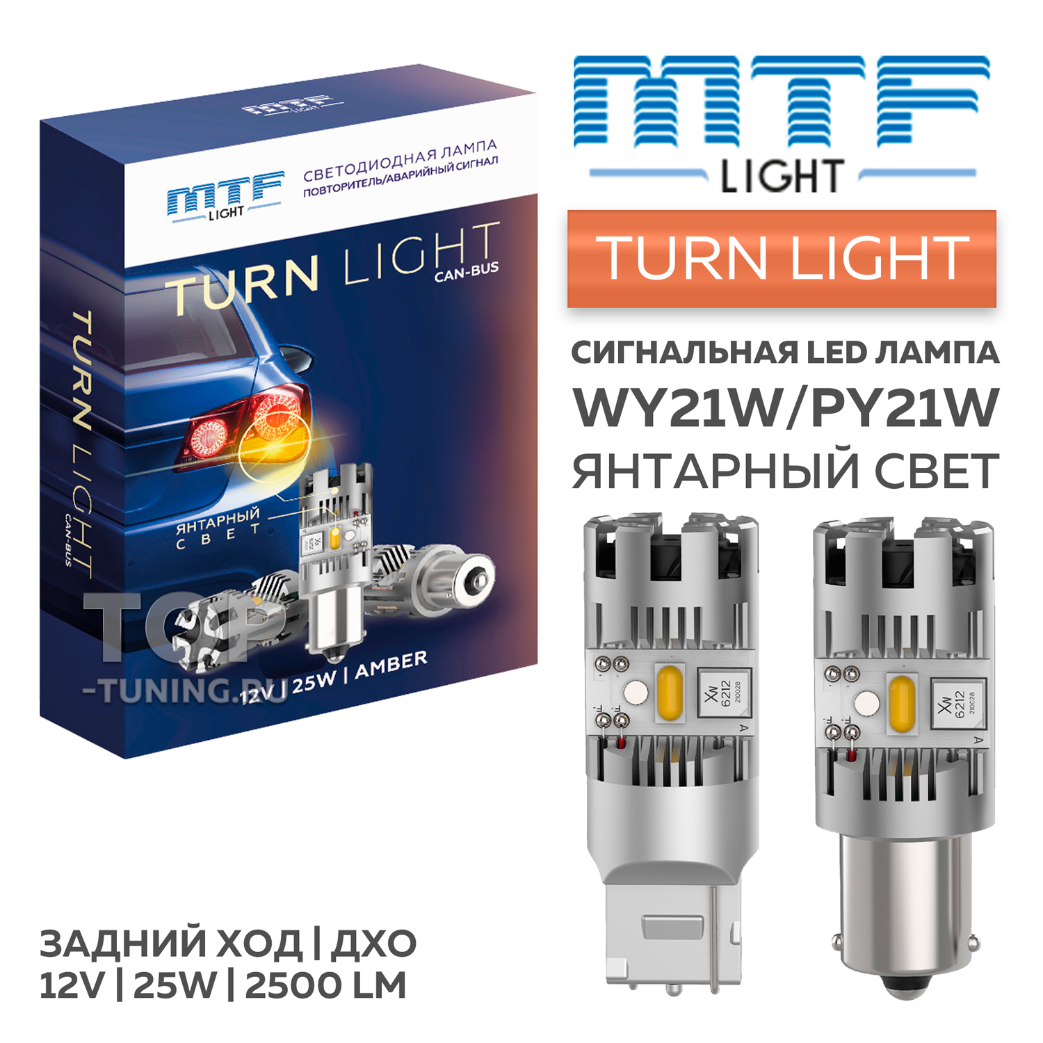 MTF TURN LIGHT — Cветодиодная лампа мощностью 25 Вт и яркостью 2500 lm, доступная в двух вариантах цоколя: W21W или PY21W. Янтарная цветовая температура делает её отличным решением для поворотных огней, особенно в условиях пониженной видимости.