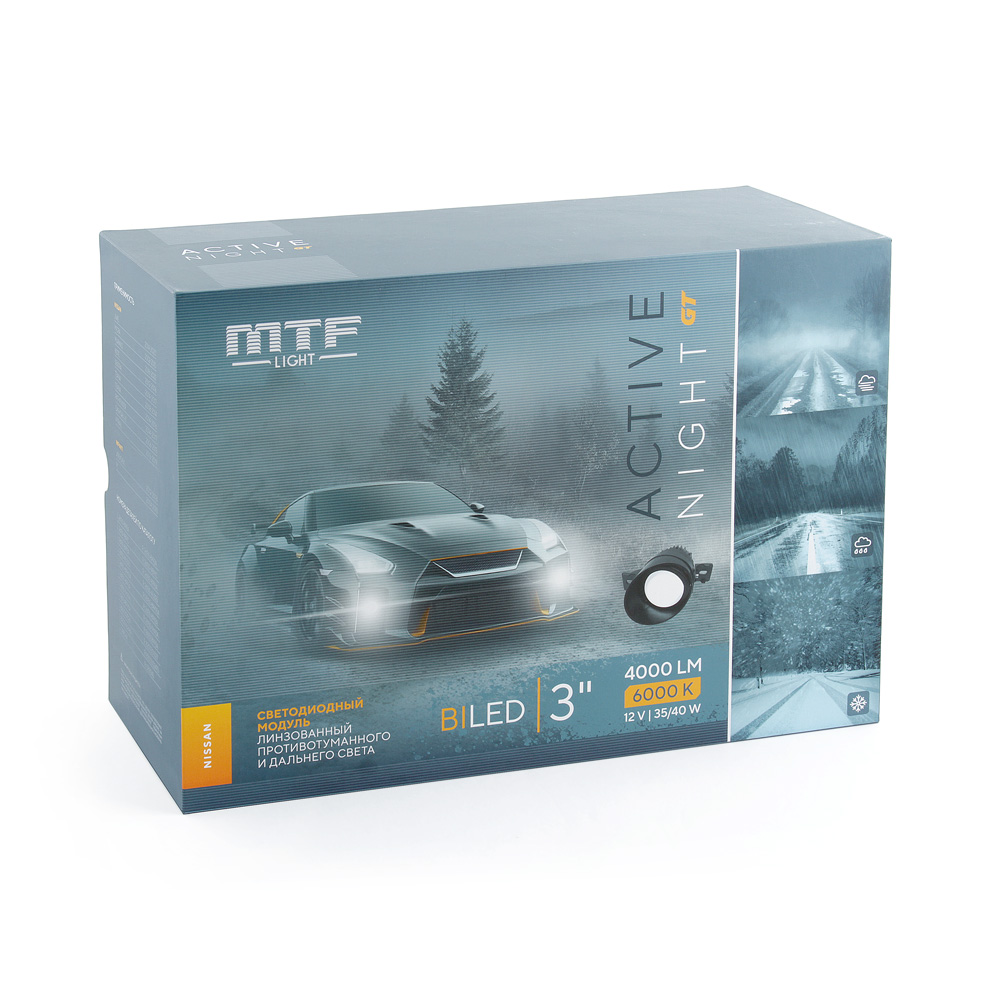 Противотуманные LED фары MTF Active Night GT 3” для Nissan и Infiniti — это двухрежимные светодиодные модули проекторного типа с функцией дальнего света, разработанные для установки в штатные посадочные места переднего бампера.