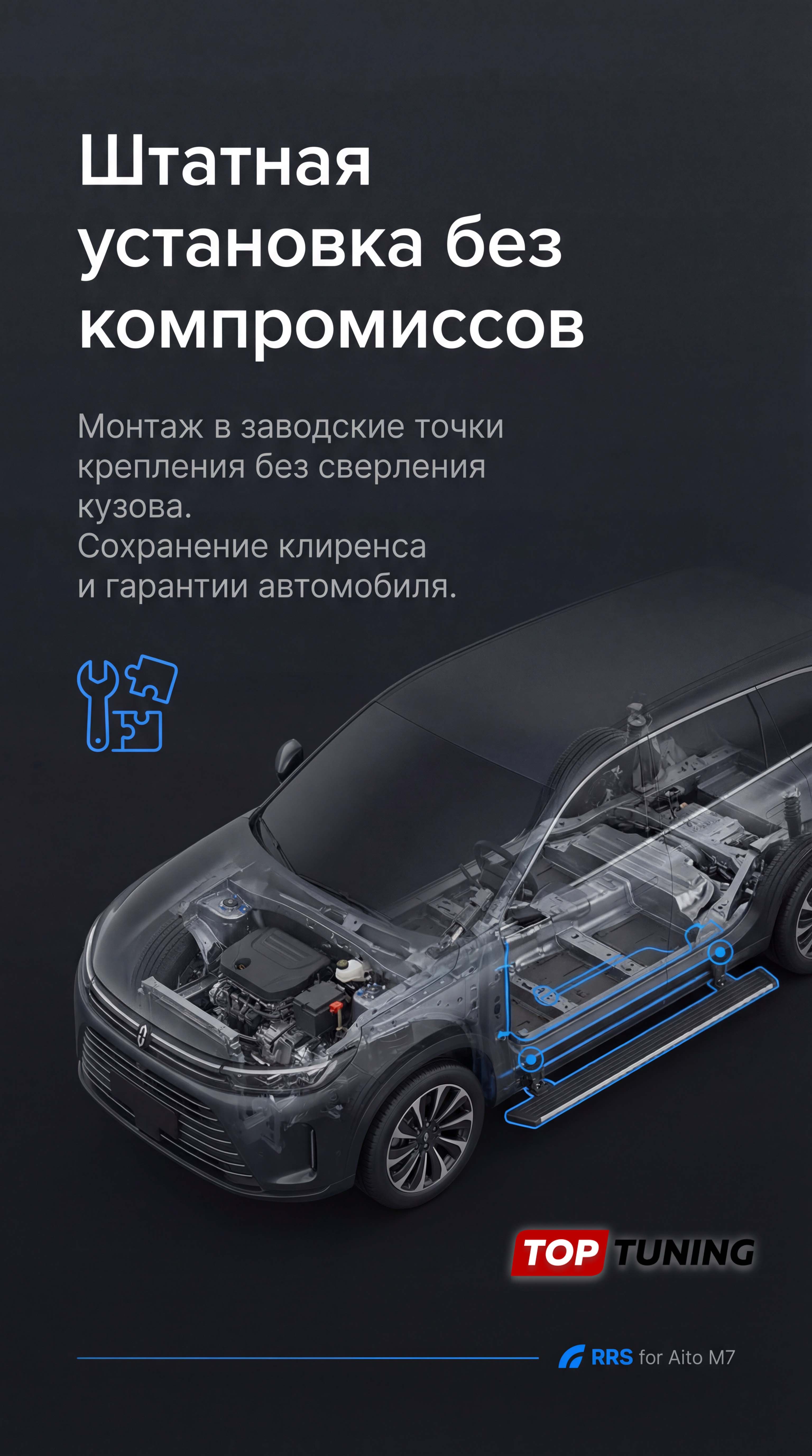 Главное преимущество системы RRS — это полная интеграция с конструкцией Aito M7. Инженеры разработали кронштейны и геометрию ступеней специально под кузов этой модели (2022–2025 г.в.).