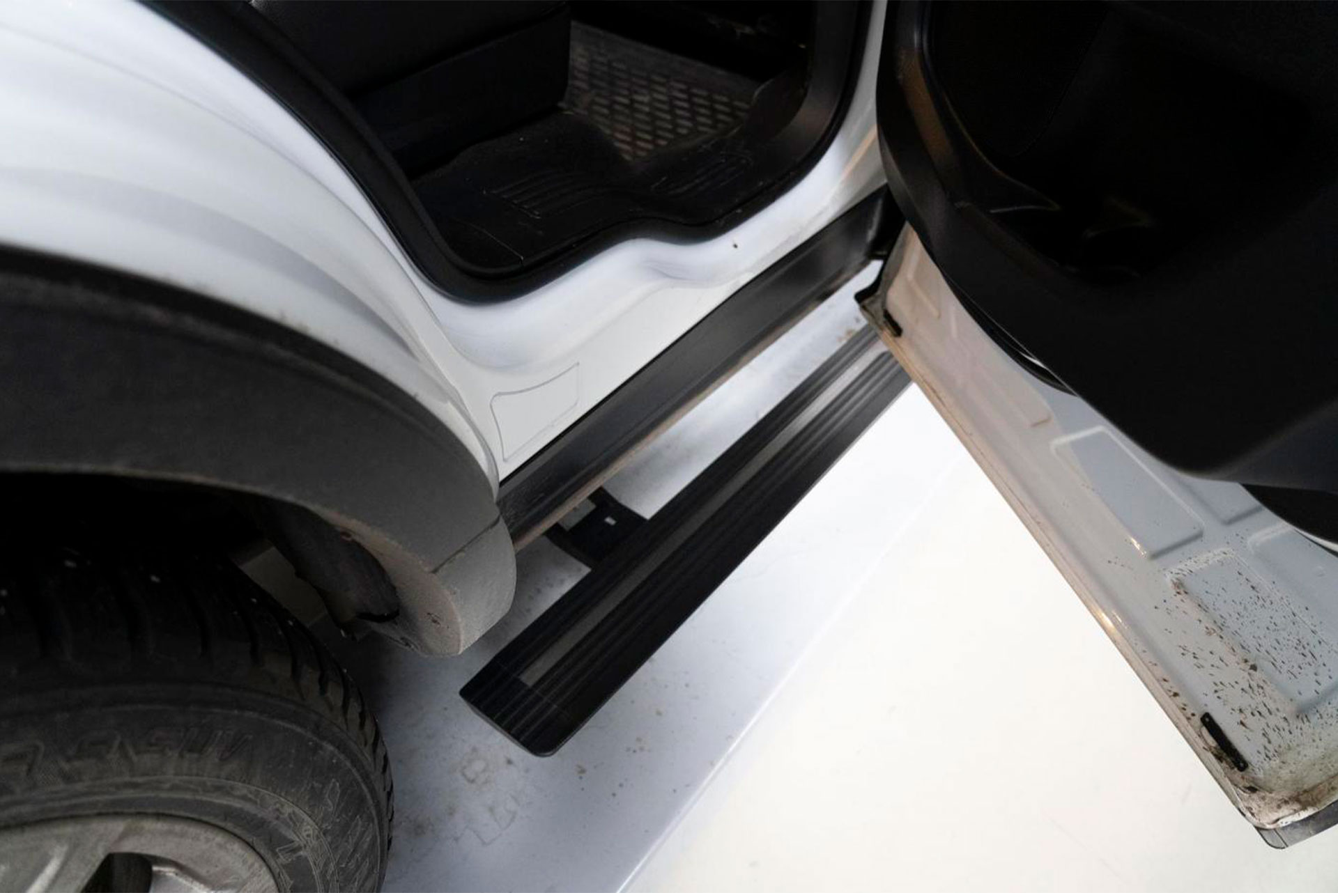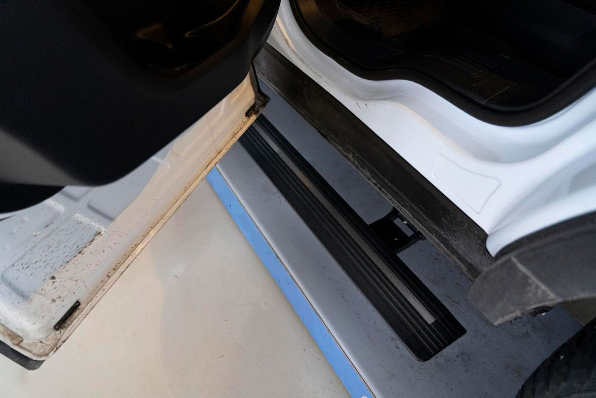 Электропривод активируется при открытии двери автомобиля. Ступень плавно выдвигается, обеспечивая удобную опору для посадки. После закрытия двери механизм автоматически возвращает порог под кузов.