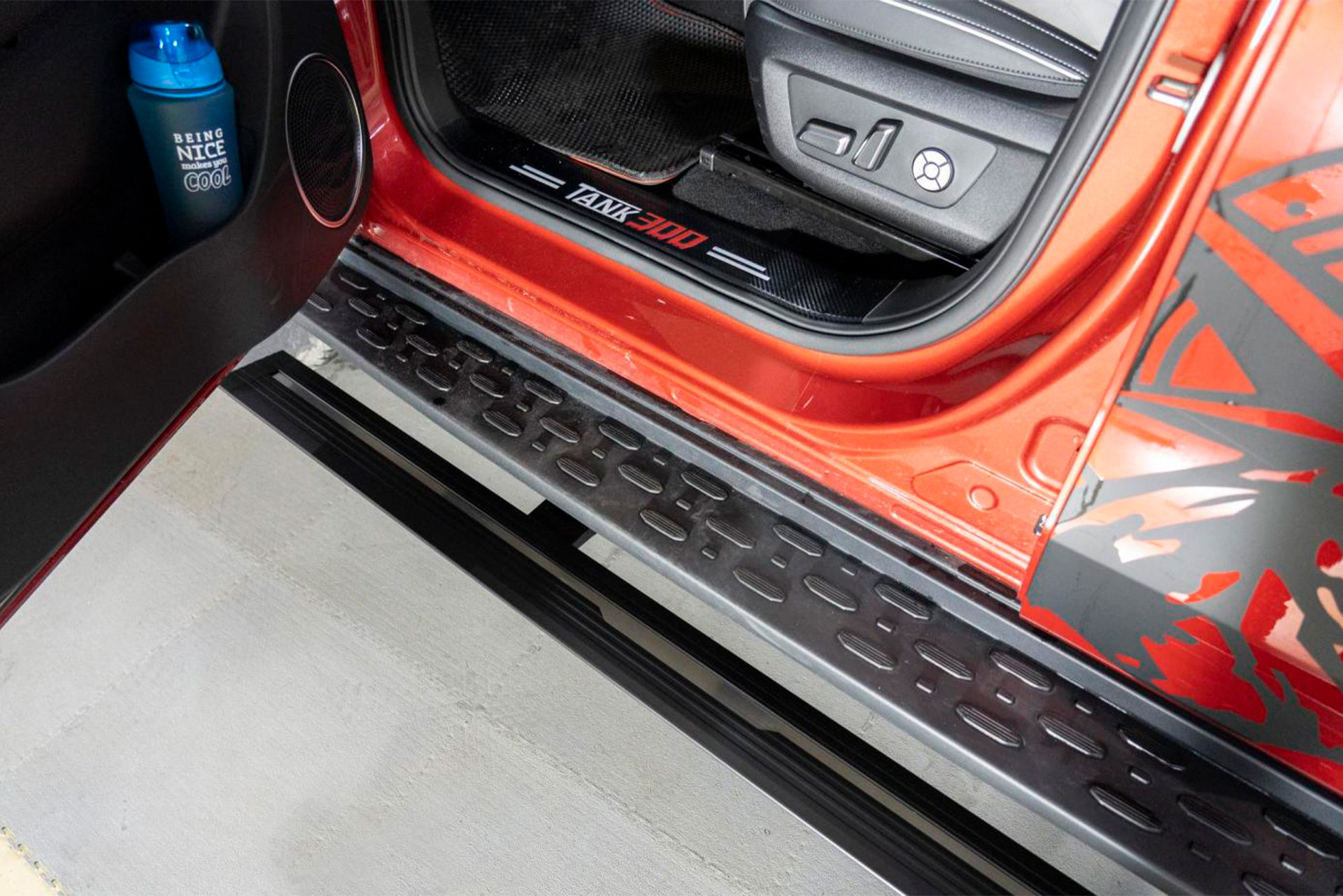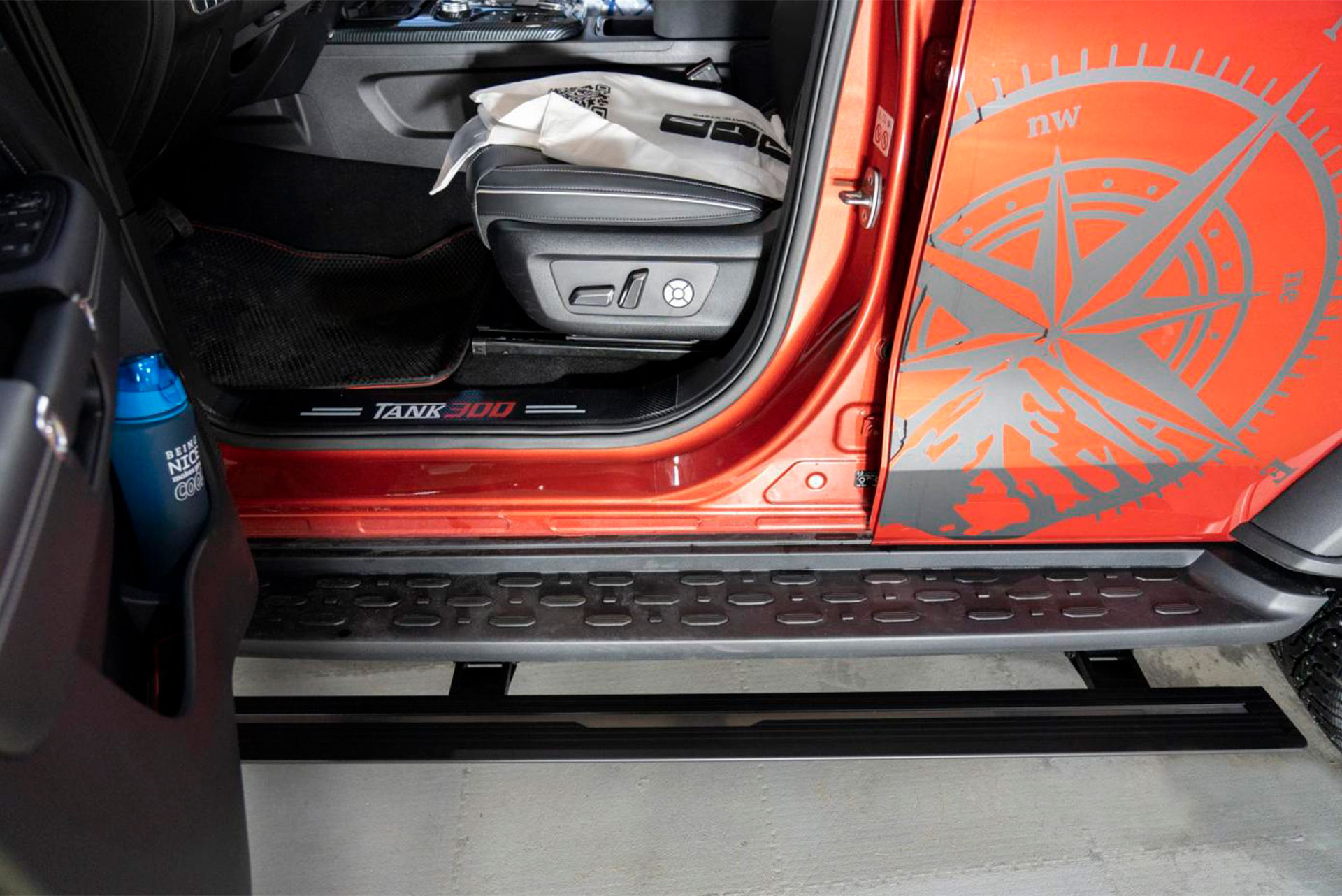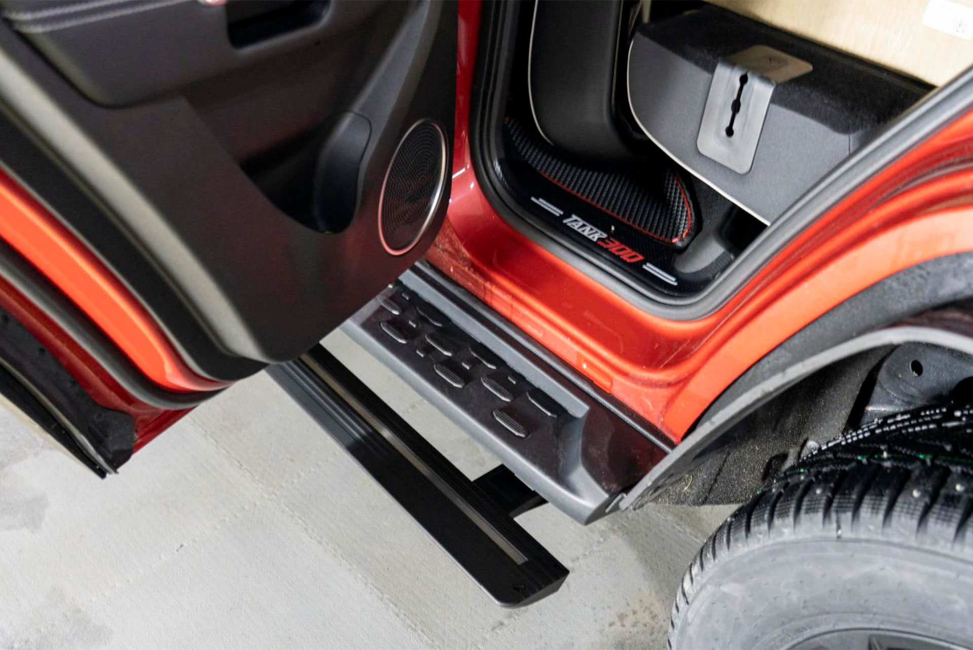 Высокий клиренс и внедорожная геометрия ТАНК 300 повышают проходимость, но делают посадку менее удобной. Электроподножки автоматически выдвигаются при открытии двери и убираются после закрытия, незначительно уменьшая дорожный просвет в сложенном положении.